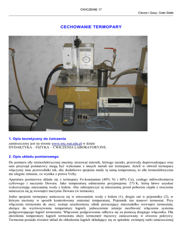 ĆWICZENIE 17 Ciecze i Gazy, Ciało Stałe CECHOWANIE TERMOPARY 1. Opis teoretyczny do ćwiczenia zamieszczony jest na stronie www.wtc.wat.edu.pl w dziale DYDAKTYKA – FIZYKA – ĆWICZENIA LABORATORYJNE. 2. Opis układu pomiarowego Do pomiaru siły termoelektrycznej musimy stosować miernik, którego zaciski, przewody doprowadzające oraz sam przyrząd pomiarowy mogą być wykonane z innych metali niż termopara. Jeżeli w obwód termopary włączymy inne przewodniki tak, aby dodatkowe spojenia miały tę samą temperaturę, to siła termoelektryczna nie ulegnie zmianie, co wynika z prawa Volty. Aparatura pomiarowa składa się z termopary Fe-konstantan (40% Ni i 60% Cu), czułego miliwoltomierza cyfrowego i naczynia Dewara. Jako temperaturę odniesienia przyjmujemy 273 K, którą łatwo uzyskać wykorzystując mieszaninę wody z lodem. Aby zabezpieczyć tę mieszaninę przed poborem ciepła z otoczenia umieszcza się ją wewnątrz naczynia Dewara (w termosie). Jedno spojenie termopary umieszcza się w mieszaninie wody z lodem (1), drugie zaś w pojemniku (2), w którym możemy w sposób kontrolowany zmieniać temperaturę. Pojemnik ten stanowi termostat. Przy włączeniu termostatu do sieci, zostaje uruchomiony silnik poruszający mieszadełko wewnątrz termostatu, służące do wyrównywania temperatury kąpieli, jednocześnie istnieje możliwość włączenia systemu podgrzewającego kąpiel termostatu. Włączenie podgrzewania odbywa się za pomocą drugiego włącznika. Dla określenia temperatury kąpieli termostatu służy termometr rtęciowy zamocowany w otworze pokrywy. Termostat posiada również układ do chłodzenia kąpieli składający się ze spiralnie zwiniętej rurki umieszczonej ĆWICZENIE 17 Ciecze i Gazy, Ciało Stałe wewnątrz termostatu. Układ chłodzenia podłączony jest do kranu sieci wodociągowej za pomocą węża gumowego. Drugi wąż służy do odprowadzania wody chłodzącej. Przy chłodzeniu termostatu należy wyłączyć podgrzewanie i nie wyłączając silnika lekko odkręcić kran wodociągowy. Szybkość chłodzenia kąpieli można regulować za pomocą zwiększenia lub zmniejszenia przepływu wody. Szybkość podgrzewania kąpieli można również regulować przez równoczesne włączenie chłodzenia. 3. Przeprowadzenie pomiarów 1. Zaznajomić się z przyrządami i ich przeznaczeniem. 2. Umieścić jedno spojenie termopary w topniejącym lodzie, drugie w kąpieli o zmiennej temperaturze (termostat). 3. Podłączyć termoparę do zacisków miliwoltomierza. 4. Podłączyć napięcie do miliwoltomierza i termostatu. 5. Uruchomić termostat, włączyć podgrzewanie. Szybkość podgrzewania kąpieli powinna być nie większa niż 1 K na minutę. Jeśli kąpiel termostatu nagrzewa się szybciej, nieznacznie odkręcić kran, przepuszczając w ten sposób przez układ chłodzenia słaby strumień wody. 6. Notować wskazania miliwoltomierza i termometru rtęciowego co 2 – 3 K, aż do uzyskania temperatury 50oC. 7. Po uzyskaniu temperatury 50oC (lecz nie wyższej!) wyłączyć podgrzewanie. Odkręcić kran na tyle, aby szybkość chłodzenia była taka sama jak szybkość podgrzewania. 8. Notować wskazania miliwoltomierza dla tych samych temperatur co przy podgrzewaniu, aż do uzyskania temperatury, jaką miała kąpiel przed rozpoczęciem pomiarów. 4. Opracowanie wyników pomiarów 1. Dla każdej temperatury wyznaczyć średnią wartość napięcia z dwóch wskazań miliwoltomierza otrzymanych przy podgrzewaniu i chłodzeniu kąpieli. 2. Wykres-1. Wykonać wykres zależności otrzymanych w poprzednim punkcie V T T . Nanieść na wykres niepewności pomiarowe. 3. Zależność V T T T 2 T 1 jest w przybliżeniu liniowa. Nanieść na wykres prostą y a x b wyznaczoną metodą najmniejszych kwadratów Gaussa, gdzie x T , y VT , natomiast parametry prostej oraz ich niepewności wyznaczamy z n n n n x i yi n ( x i a i 1 i 1 i 1 2 n n n xi xi yi ) b i 1 i 1 n n xi n xi2 i 1 i 1 n yi y i xi2 i 1 2 i 1 n xi n xi2 i 1 i 1 n a 1 n2 n i2 i 1 n n n i 1 xi2 n xi i 1 2 b 1 n2 xi2 n i2 i 1 i 1 n n i 1 gdzie: n n n n i 1 i 1 i 1 i 1 i2 yi2 a xi yi b yi , xi2 n xi i 1 2 ĆWICZENIE 17 Ciecze i Gazy, Ciało Stałe a także wyznaczyć współczynnik korelacji (0<R2<1), którego wartość bliska 1 świadczy o zgodności rozkładów punktów eksperymentalnych z wyznaczoną prosta n xi x yi y R 2 i 1 2 n n x x y i i 1 i 2 2 . y i 1 4. Wartość współczynnika termoelektrycznego jest jednoznaczna z a , a jego niepewność standardowa jest równa niepewności standardowej współczynnika a tzn. u( ) a . u ( ) 5. Wyznaczyć niepewność względną ur ( ) . Sprawdzić jej relację z wartością 0,1 i wyciągnąć wnioski. 6. Wyznaczyć niepewność rozszerzoną zgodnie z zależnością U k u przyjmując do obliczeń współczynnik rozszerzenia k = 2. Sprawdzić, czy w przedziale wyznaczonym przez wyznaczoną wielkości i jej niepewność rozszerzoną zawiera się wartość teoretyczna. 7. Przeanalizować wykres. Wyjaśnić, co oznacza wartość b różna od zera? 5. Podsumowanie Zestawić wyniki, przeanalizować uzyskane rezultaty, wyciągnąć wnioski. Stwierdzić czy cel ćwiczenia: wyznaczenie współczynnika termoelektrycznego; zbadanie liniowości wskazań termopary; został osiągnięty. 6. Przykładowe pytania Zamieszczone są na stronie www.wtc.wat.edu.pl w dziale DYDAKTYKA – FIZYKA – ĆWICZENIA LABORATORYJNE. ĆWICZENIE 17 Ciecze i Gazy, Ciało Stałe Grupa …...................................................................................................................................................... 3.1 Wartości teoretyczne wielkości wyznaczanych lub określanych: współczynnik termoelektryczny termopary Fe-konstantan 48,9 V V , Fe-Cu 0,41 . K K 3.2 Parametry stanowiska (wartości i niepewności): 3.3 Pomiary i uwagi do ich wykonania. Temperatura T [ºC] wzrost L.p. Temperatura T [ºC] spadek 13, 1 13, 15, 2 15, 17, 3 17, 19, 4 19, 21, 5 21, 23, 6 23, 25
