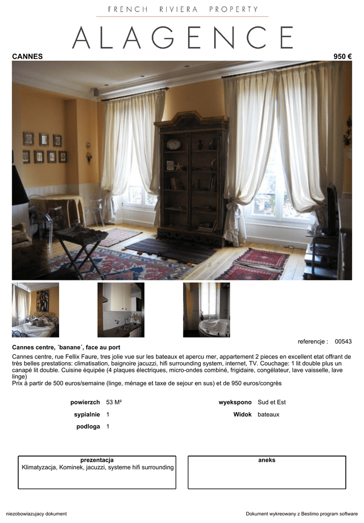 CANNES 950 € referencje : 00543 Cannes centre, ´banane´, face au port Cannes centre, rue Fellix Faure, tres jolie vue sur les bateaux et apercu mer, appartement 2 pieces en excellent etat offrant de très belles prestations: climatisation, baignoire jacuzzi, hifi surrounding system, internet, TV. Couchage: 1 lit double plus un canapé lit double. Cuisine équipée (4 plaques électriques, micro-ondes combiné, frigidaire, congélateur, lave vaisselle, lave linge) Prix à partir de 500 euros/semaine (linge, ménage et taxe de sejour en sus) et de 950 euros/congrès powierzch 53 M² sypialnie 1 podloga 1 prezentacja Klimatyzacja, Kominek, jacuzzi, systeme hifi surrounding niezobowiazujacy dokument wyekspono Widok Sud et Est bateaux aneks Dokument wykreowany z Bestimo program software