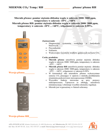 MIERNIK CO2/ Temp./ RH ____________________ pSense/ pSense RH ______________________________________________________________ Miernik pSense: pomiar stężenia ditlenku węgla w zakresie 2000/ 3000 ppm, temperatury w zakresie -10°C…+60°C Miernik pSense RH: pomiar stężenia ditlenku węgla w zakresie 2000/ 3000 ppm, temperatury w zakresie -10°C…+60°C, wilgotności w zakresie 0-99%. Zastosowanie • Diagnostyka systemów wentylacji w budynkach biurowych • Pieczarkarnie • Szklarnie • Wykrywanie wycieków środków gaśniczych na bazie CO2 Wersja pSense________ Cechy produktu: • Miernik pSense umożliwia pomiar stężenia ditlenku węgla w zakresie 2000/ 3000 ppm, temperatury w zakresie -10°C…+60°C • Miernik pSense RH umożliwia pomiar stężenia ditlenku węgla w zakresie 2000/ 3000 ppm, temperatury w zakresie -10°C…+60°C, wilgotności w zakresie 0-99% • W konstrukcji obu mierników pSense wykorzystano sensory CO2 pracujące w oparciu o metodę pochłaniania strumienia podczerwieni nierozproszonej (NDIR). • Wszystkie funkcje sterowane są przy pomocy mikroprocesora. Upraszcza to obsługę, umożliwia miniaturyzację i eliminuje wszelkie elementy regulacji. • Miernik jest wyposażony w futerał ochronny. Wersja pSense RH_______ ___________________________________________________________________________________ APG-INNOWACJE Jolanta Góralczyk, 41-400 Mysłowice, ul. Mikołowska 29, NIP 222-016-29-35 tel./ fax: 32 317 31 13, kom. 502 430 657, e-mail: [email protected], www.apg-innowacje.pl ___________________ MIERNIK CO2/ Temp./ RH ____________________ pSense/ pSense RH ______________________________________________________________ Dane techniczne: TYP pSENSE pSENSE RH Zasada pomiaru NDIR – pochłanianie podczerwieni nierozproszonej, czujnik Wykrywane gazy ditlenek węgla Zakres pomiarowy 0 – 2000ppm/ -10°C…+60°C 0 – 3000ppm/ -10°C…+60°C/ 0-99%RH Zakres pomiarowy CO2 nieliniowy Gazy zakłócające pomiar Metoda próbkowania gazu Czas odpowiedzi Dokładność w temp. 25°C Zależność od ciśnienia brak dyfuzyjna około 30 sekund ±50ppm lub ±5% wskazań (w zakresie 0-2000ppm)/ 0,1°C/ 0,1%RH + 1,6% wskazań/ 1 kPa odchylenia od ciśnienia normalnego (1013 hPa) DANE OGÓLNE Trwałość sensora Zasilanie Autodiagnostyka Czas wygrzewania wstępnego około 15 lat 4 baterie typu AA lub (opcjonalnie) zasilacz 9V zasilanie/ sensor/ ustawienia wewnętrzne/ autokalibracja 30 sekund, gotowość metrologiczna po 15 min. Temperatura pracy/ przechowywania 0°C…+50°C/ -20°C…+60°C Wilgotność dopuszczalna 0 ÷ 95% RH (bez kondensacji) ___________________________________________________________________________________ APG-INNOWACJE Jolanta Góralczyk, 41-400 Mysłowice, ul. Mikołowska 29, NIP 222-016-29-35 tel./ fax: 32 317 31 13, kom. 502 430 657, e-mail: [email protected], www.apg-innowacje.pl ___________________