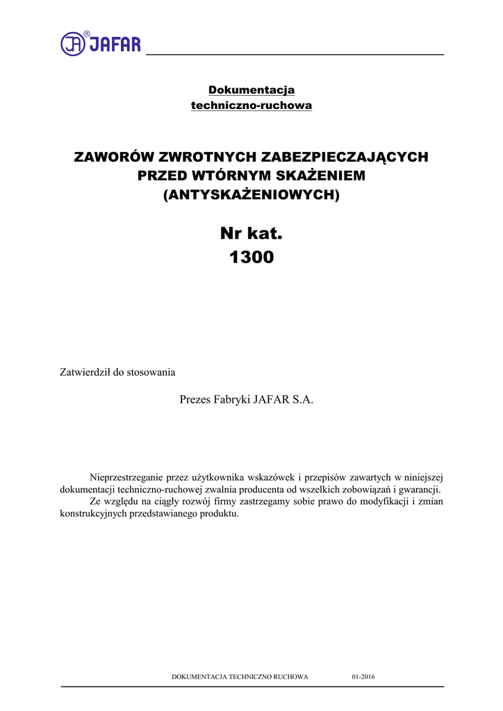 Dokumentacja techniczno-ruchowa ZAWORÓW ZWROTNYCH ZABEZPIECZAJĄCYCH PRZED WTÓRNYM SKAŻENIEM (ANTYSKAŻENIOWYCH) Nr kat. 1300 Zatwierdził do stosowania Prezes Fabryki JAFAR S.A. Nieprzestrzeganie przez użytkownika wskazówek i przepisów zawartych w niniejszej dokumentacji techniczno-ruchowej zwalnia producenta od wszelkich zobowiązań i gwarancji. Ze względu na ciągły rozwój firmy zastrzegamy sobie prawo do modyfikacji i zmian konstrukcyjnych przedstawianego produktu. DOKUMENTACJA TECHNICZNO RUCHOWA 01-2016 SPIS TREŚCI 1 OPIS TECHNICZNY ......................................................................................................................................... 3 1.1 NAZWA I CECHY WYROBU .................................................................................................................... 3 1.2 PRZEZNACZENIE ................................................................................................................................. 3 1.3 CHARAKTERYSTYKA TECHNICZNA .................................................................................................... 3 2 KONSTRUKCJA ................................................................................................................................................ 4 2.1 OPIS KONSTRUKCJI ARMATURY .......................................................................................................... 4 2.2 MATERIAŁY. .............................................................................................................................................. 5 2.3 WYMIARY ................................................................................................................................................... 6 2.4 NORMALIZACJA ........................................................................................................................................ 7 2.5 ZASADY ZAMAWIANIA ........................................................................................................................... 7 2.6 WYKONANIE I ODBIÓR ........................................................................................................................... 8 2.7 ZNAKOWANIE ........................................................................................................................................... 8 3 ZABEZPIECZANIE – MAGAZYNOWANIE – TRANSPORT ......................................................................... 8 3.1 POWŁOKI OCHRONNE ............................................................................................................................. 8 3.2 PAKOWANIE .............................................................................................................................................. 8 3.3 MAGAZYNOWANIE .................................................................................................................................. 8 3.4 TRANSPORT ............................................................................................................................................... 8 4 MONTAŻ I INSTALACJA ................................................................................................................................. 9 4.1 WYTYCZNE MONTAŻU ........................................................................................................................... 9 4.2 INSTRUKCJA MONTAŻU ......................................................................................................................... 9 4.3 EKSPLOATACJA ...................................................................................................................................... 10 4.4 PRZEPISY B.H.P ....................................................................................................................................... 10 5 WARUNKI GWARANCJI ................................................................................................................................ 10 DOKUMENTACJA TECHNICZNO RUCHOWA 01-2016 2 1 OPIS TECHNICZNY 1.1 NAZWA I CECHY WYROBU Przedmiotem niniejszej DTR są: Zawory zwrotne (antyskażeniowe) zabezpieczające przed wtórnym skażeniem typu EA z przyłączami gwintowanymi oraz kołnierzowymi. 1.2 PRZEZNACZENIE Zawory zwrotne zabezpieczające przed wtórnym skażeniem (antyskażeniowe) typu EA nr kat 1300 przeznaczone są do zabezpieczenia sieci przed skażeniem w wypadku przepływu zwrotnego podczas transportu wody w instalacjach wodociągowych w zakresie ciśnienia do 1,6MPa i temperatury do +70ºC. 1.3 CHARAKTERYSTYKA TECHNICZNA Zawory zwrotne przeznaczone są do zabezpieczenia sieci przed skażeniem płynami mogącymi zanieczyścić ją w przypadku wystąpienia przepływu zwrotnego. - zakres stosowanych średnic DN15 –DN50 - dla zaworów z kielichami gwintowanymi; DN50 –DN200 - dla zaworów kołnierzowych; - max prędkość przepływu medium: 4m/sek.; - max ciśnienie pracy (PS): 1,0MPa – dla wersji gwintowanej; 1,6MPa – dla wersji kołnierzowej; - max temperatura pracy (TS): 70ºC. Wykonane zgodnie z norma PN-EN 13959: 2005 – norma produktowa odnosząca się do zaworów zapobiegających zanieczyszczeniu wody do picia o średnicach DN6 do DN250 – rodzina E –typ A, B, C, i D. Szczególną cechą zaworów zwrotnych antyskażeniowych jest: - cicha praca, - małe straty ciśnienia, - bardzo dobra szczelność pod niskim ciśnieniem, - nie generuje uderzeń hydraulicznych, - posiada dwa otwory z zaworami kulowymi, - posiada rewizję pozwalającą odprowadzić wodę zalegającą w zaworze. Zgodnie z normą PN-EN 1717: 2003 zawory typu EA z możliwością nadzoru stosuje się do ochrony instalacji wody przeznaczonej do picia przed skażeniem płynami kategorii 2. Zawory antyskażeniowe mogą być używane jako armatura zwrotna w instalacjach wewnętrznych, między wodomierzem a odbiornikiem, zasadniczo na rurociągach ułożonych poziomo. Zawór posiada na korpusie zaznaczony strz