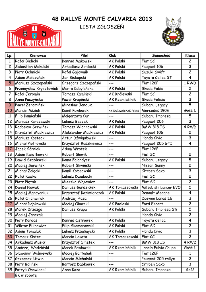 48 RALLYE MONTE CALVARIA 2013 LISTA ZGŁOSZEŃ Lp. 1 2 3 4 5 6 7 8 9 10 11 12 13 14 15 16 17 18 19 20 21 22 23 24 25 26 27 28 29 30 31 32 33 34 35 36 37 38 39 Kierowca Rafał Bielicki Sebastian Makulski Piotr Ochnicki Adam Małczyński Mariusz Szczepański Przemysław Krysztowiak Rafał Jeromin Anna Paczyńska Paweł Żeromiński Marcin Miziak Filip Kamieński Mariusz Karczewski Radosław Serwiński Krzysztof Mackiewicz Mariusz Kostecki Michał Piotrowski Jacek Górniak Adam Kwiatkowski Dawid Szablewski Maciej Serwiński Michał Załęcki Rafał Kawka Piotr Piętak Daniel Nowak Maciej Marcyaniuk Rafał Olichwiruk Michał Dąbkowski Marek Drzazga Maciej Janczak Piotr Kordos Wiktor Filipowicz Adam Tomalak Tomasz Kister Arkadiusz Musiał Andrzej Wodziński Sławomir Wiśniewski Grzegorz Litwin Piotr Boliński Patryk Osowiecki BK w sobotę Pilot Konrad Makowski Arkadiusz Sołdecki Rafał Gajownik Jan Biskupski Grzegorz Szczepański Marta Kobylańska Tomasz Kamiński Paweł Krupiński Mirosław Janduła Kamil Pawłowski Małgorzata Cur Łukasz Beczek Tomasz Wichrowski Aleksander Mackiewicz Artur Dźwigałowski Krzysztof Ruszkiewicz Adam Wrotek Robert Słowik Kama Falandysz Robert Śliwiński Kamil Kołosowski Łukasz Dziubacki Mieszko Wąsowicz Dariusz Gurdziołek Krzysztof Kazimierczak Andrzej Płaza Maciej Ołowski Dariusz Krupa Konrad Ostrowski Filip Skomorowski Łukasz Przesmycki Marcin Lasota Krzysztof Smętek Marek Pawłowski Maciej Bartosiak Marcin Michalski Bartosz Dąbkowski Anna Koza Klub AK AK AK AK --AK AK AK --- Polski Polski Polski Polski Samochód Fiat SC Peugeot 106 Suzuki Swift Toyota Celica GT Fiat 126P Polski Skoda Fabia Królewski Fiat SC Rzemieślnik Skoda Felicia Subaru Legacy AK Królewski/AK Polski Mercedes 190E --Subaru Impreza AK Polski Peugeot 206 AK Polski BMW 318 IS AK Polski Peugeot 106 --Honda Civic --Peugeot 205 GTI --Fiat 126P --Fiat SC AK Polski Subaru Legacy --Nissan Sunny --Citroen Saxo --Fiat SC --Fiat SC AK Tomaszowski Mitsubishi Lancer EVO AK Polski Renault Megane --Daewoo Lanos 1.6 AK Podlaski Ford Escort AK Polski Subaru Impreza Sti Honda Civic AK Polski Toyota Celica AK Polski Fiat SC AK Polski Honda Civic AK Tomaszowski Fiat CC --BMW 318 IS AK Rzemieślnik Lancia Fulvia Coupe --Fiat 126P --Peugeot 205 rallye --Citroen Saxo AK Rzemieślnik Subaru Impreza Klasa 2 3 2 4 1 RWD 2 2 3 5 Gość L 5 3 4 RWD 2 3 4 1 2 5 2 3 2 2 5 4 3 2 5 2 4 2 3 2 4 RWD Gość L 1 2 3 Gość 40 41 42 43 44 45 46 47 48 49 50 51 52 53 54 55 56 57 58 59 60 61 62 63 64 65 66 67 68 69 70 71 72 73 74 75 76 77 78 79 80 81 82 83 84 85 86 87 Tomasz Ryznar Aleksander Buchowicz Piotr Burski Krzysztof Łagowski Adam Bernard Maciej Chałas Jakub Kinkel Iwo Knobloch Piotr Sawicki Paweł Koda Łukasz Janisiak Marek Szcześniak Krystian Dzienisiewicz Tomasz Rutelonis Leszek Antolik Adam Wojtanka Tomasz Niewiadowski Maciej Matysiak Daniel Gęborski Tomasz Kącki Marcin Kwiatkowski Bogdan Jankowski Rafał Buczyński Jerzy Szynkiewicz Mariusz Walczak Krzysztof Sawicki Cezary Pietrzyk Piotr Włodarczyk Maciej Papis Wojciech Krawczyk Norbert Byśkiniewicz Sebastian Hamerski Krzysztof Cieślak Łukasz Lichowski Adam Piwoński Krzysztof Oracz Agnieszka Kazimierczak Grzegorz Rosłon Dominiqe Matczak Sebastian Dwornik Michał Czarnocki Arkadiusz Sztenkiel Michał Sadowski Adam Kacprzyk Grzegorz Karpiarz Jakub Groszyk Łukasz Zieliński Bartłomiej Badowski BK w sobotę Paulina Nowacka Rafał Buchowicz Krzysztof Burski Zofia Czyż Piotr Gontarczyk Romuald Chałas Sebastian Turczyn Grzegorz Janiszewski Robert Wójcik Anna Dimapilis Konrad Lech Krzysztof Klimkowski Mikołaj Markiewicz Katarzyna Jaśkowska AK ------AK AK AK --AK AK --AK ----- Polski BMW E30 4 Toyota Celica 5 Fiat SC 2 Peugeot 106 2 Polski Fiat SC 2 Polski Mitsubishi Lancer EVO 5 Polski Opel Astra GSI 4 BMW E30 IS 4 RWD Polski Renault Clio Evo 2 2 Polski Fiat SC 2 Citroen Saxo 3 Polski Toyota Celica GT 4 Citroen ZX 4 Fiat SC 2 Suzuki Swift GTI 2 Marek Wojtanka Team50 Sieradz Subaru Impreza STi 5 Marcin Napiórkowski --Peugeot 205 GTI 4 Sebastian Trzaska AK Królewski/AK Polski Citroen Saxo VTS 3 Michał Włodarczyk Peugeot 106 3 Filip Jakubowski AK Polski Mitsubishi Lancer EVO VI 5 Magdalena Kwiatkowska --Nissan Sunny 3 Marek Kaczmarek --BMW 316i Gość L Szymon Lejk --Daihatsu Cuore 1 Artur Szczepański --Fiat 126P 1 Szymon Walczak AK Bialskopodlaski Mazda 323 4 Paweł Szempliński AK Rzemieślnik Subaru Impreza GOŚĆ Jacek Woźnicki --BMW 318IS E36 4 RWD Katarzyna Karbowiak --Fiat SC 2 Robert Posytek --Peugeot 206 XS 3 Daniel Durka --Subaru Legacy 5 Michał Hutnik --Subaru Impreza 4 Remigiusz Mazek --Lancia Delta Integrale 5 Łukasz Poszepny --Fiat SC 2 Maciej Jończyk AK Polski Honda CRX 3 Piotr Gładecki AK Rzemieślnik Opel Astra 4 Marek Kwaśnik --Mitsubishi Lancer VIII Gość Tomasz Kinkel AK Polski Renault Megane 4 Katarzyna Stempkowska AK Rzemieślnik Ford Fiesta 4 Jan Pawlak --Citroen Saxo 2 Tomasz Kwiecień AMK Ziemi Tyskiej Honda Civic 3 Marek Nowowiejski AK Królewski Renault Clio Sport 4 Elżbieta Grzebielec --Fiat CC 2 Magdalena Sadowska Moto Auto Klub Peugeot 205 GTI 3 Michał Gawlik AK Polski Lancia Delta Integrale 5 Suzuki Swift GL 2 Konrad Banachowicz --Fiat SC 2 Robert Dąbkowski AK Podlaski Fiat SC Sporting 2 AK Polski Fiat 126P GOŚĆ 88 89 90 91 92 93 94 95 96 97 98 99 100 Barbara Fijałkowska Damian Oleksiak Konrad Kojda Krzysztof Maciejewski Michał Paprocki Tomasz Kijanowski Maciej Błachnio Arkadiusz Krawczyński Igor Bartold Kamil Dudziński Dariusz Sobecki Bartosz Rola Arkadiusz Robakiewicz Rafał Szostakowski Paweł Rosiak Michał Kojda Alicja Maciejewska Tomasz Stachera AK Polski --AK Polski AK Polski --- Volvo 340 Fiat SC BMW E30 Renault Clio Skoda Favorit Tomasz Szyszko Łukasz Ciechomski Paweł Wiśniewski Wojciech Białowąś Adrian Sobecki Patrycja Suszek Damian Nowak --AK Królewski --AK Polski AK Polski ----- 2 2 4 GOŚĆ 2 Mitsubishi Lancer EVO 9 5 Ford Sierra 5 Peugeot 205 Gość L BMW E30 4 RWD Fi