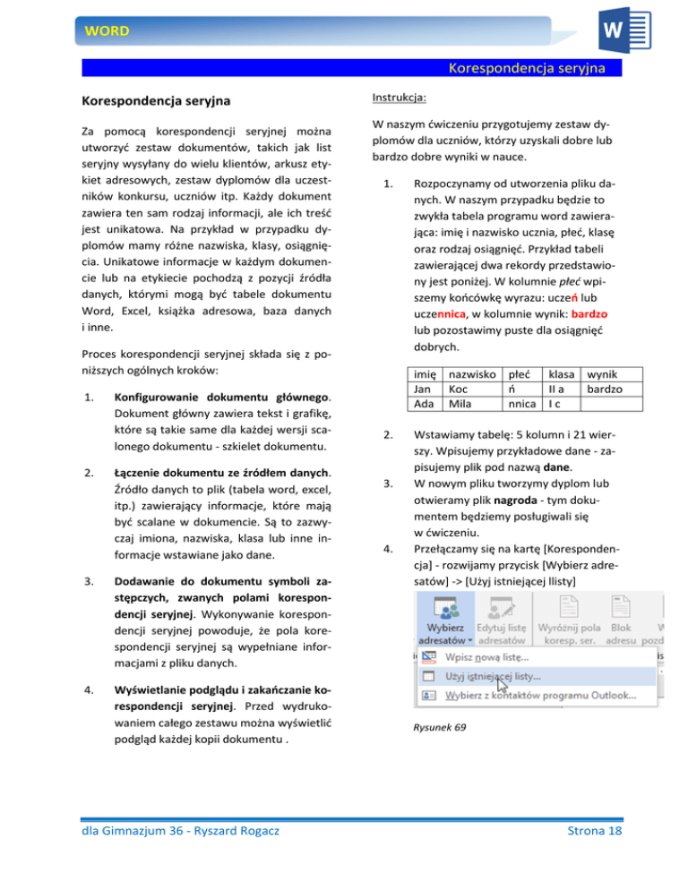WORD Korespondencja seryjna Korespondencja seryjna Za pomocą korespondencji seryjnej można utworzyć zestaw dokumentów, takich jak list seryjny wysyłany do wielu klientów, arkusz etykiet adresowych, zestaw dyplomów dla uczestników konkursu, uczniów itp. Każdy dokument zawiera ten sam rodzaj informacji, ale ich treść jest unikatowa. Na przykład w przypadku dyplomów mamy różne nazwiska, klasy, osiągnięcia. Unikatowe informacje w każdym dokumencie lub na etykiecie pochodzą z pozycji źródła danych, którymi mogą być tabele dokumentu Word, Excel, książka adresowa, baza danych i inne. Instrukcja: W naszym ćwiczeniu przygotujemy zestaw dyplomów dla uczniów, którzy uzyskali dobre lub bardzo dobre wyniki w nauce. 1. Proces korespondencji seryjnej składa się z poniższych ogólnych kroków: 1. 2. Konfigurowanie dokumentu głównego. Dokument główny zawiera tekst i grafikę, które są takie same dla każdej wersji scalonego dokumentu - szkielet dokumentu. Łączenie dokumentu ze źródłem danych. Źródło danych to plik (tabela word, excel, itp.) zawierający informacje, które mają być scalane w dokumencie. Są to zazwyczaj imiona, nazwiska, klasa lub inne informacje wstawiane jako dane. 3. Dodawanie do dokumentu symboli zastępczych, zwanych polami korespondencji seryjnej. Wykonywanie korespondencji seryjnej powoduje, że pola korespondencji seryjnej są wypełniane informacjami z pliku danych. 4. Wyświetlanie podglądu i zakańczanie korespondencji seryjnej. Przed wydrukowaniem całego zestawu można wyświetlić podgląd każdej kopii dokumentu . dla Gimnazjum 36 - Ryszard Rogacz Rozpoczynamy od utworzenia pliku danych. W naszym przypadku będzie to zwykła tabela programu word zawierająca: imię i nazwisko ucznia, płeć, klasę oraz rodzaj osiągnięć. Przykład tabeli zawierającej dwa rekordy przedstawiony jest poniżej. W kolumnie płeć wpiszemy końcówkę wyrazu: uczeń lub uczennica, w kolumnie wynik: bardzo lub pozostawimy puste dla osiągnięć dobrych. imię nazwisko płeć klasa wynik Jan Koc ń II a bardzo Ada Mila nnica I c 2. 3. 4. Wstawiamy tabelę: 5 kolumn i 21 wierszy. Wpisujemy przykładowe dane - zapisujemy plik pod nazwą dane. W nowym pliku tworzymy dyplom lub otwieramy plik nagroda - tym dokumentem będziemy posługiwali się w ćwiczeniu. Przełączamy się na kartę [Korespondencja] - rozwijamy przycisk [Wybierz adresatów] -> [Użyj istniejącej llisty] Rysunek 69 Strona 18 WORD 5. Wybieramy folder [dokumenty] i wskazujemy plik dane o nazwie [płeć]. Rysunek 74 Rysunek 70 6. 11. Kolej na dodanie klasy. Zaznaczamy I a Zaznaczamy imię JAN Rysunek 75 12. Wstawiamy pole korespondencji [klasa] Rysunek 71 7. Następnie rozwijamy przycisk [Wstaw pola korespondencji seryjnej] i klikamy pole [Imię] Rysunek 76 13. Pozostał rodzaj osiągnięć. Zaznaczamy słowo bardzo i zamieniamy je na pole korespondencji [wynik] Rysunek 72 8. Następuje wstawienie pola korespondencji: Rysunek 77 14. Klikamy przycisk [Wyróżnij pola korespondencji] Rysunek 73 9. 10. Podobnie zamieniamy nazwisko KOWALSKI na pole korespondencji [nazwisko] Kolejny krok to właściwe określenie płci. W słowie uczeń zaznaczamy literę ń i zamieniamy ją na pole korespondencji dla Gimnazjum 36 - Ryszard Rogacz Rysunek 78 15. Następuje "podświetlenie" wstawionych pól korespondencji seryjnej przed- Strona 19 WORD stawionych na rysunku: 20. 21. Po sprawdzeniu poprawności danych pozostaje wygenerowanie dokumentu zawierającego wszystkie dyplomy. Wybieramy przycisk [Zakończ i scal] klikamy [Edytuj poszczególne dokumenty] Rysunek 79 16. 17. Dokument jest praktycznie gotowy. Sprawdzamy poprawność pobierania danych z naszej "bazy danych" zawartej w pliku dane. Klikamy na przycisku [Podgląd wyników] Rysunek 83 22. W okienku scalania wybieramy [Wszystko] - [OK] - czekamy na wygenerowanie dokumentu. Rysunek 80 18. Nasze pola korespondencji "wypełniają się" danymi pierwszego rekordu: Rysunek 84 23. Wygenerowany dokument zapisujemy pod nazwą nagrody. Rysunek 81 19. Klikamy na przyciskach zmiany rekordu Rysunek 82 powoduje to wprowadzenie następnych danych. dla Gimnazjum 36 - Ryszard Rogacz Strona 20