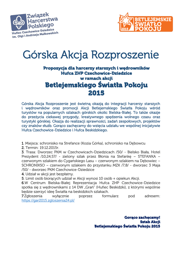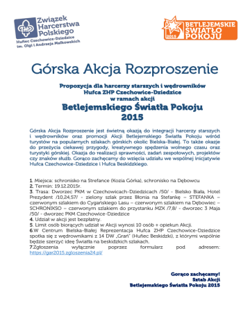 Górska Akcja Rozproszenie Propozycja dla harcerzy starszych i wędrowników Hufca ZHP Czechowice-Dziedzice w ramach akcji Betlejemskiego Światła Pokoju 2015 Górska Akcja Rozproszenie jest świetną okazją do integracji harcerzy starszych i wędrowników oraz promocji Akcji Betlejemskiego Światła Pokoju wśród turystów na popularnych szlakach górskich okolic Bielska-Białej. To także okazje do przeżycia ciekawej przygody, kreatywnego spędzenia wolnego czasu oraz turystyki górskiej. Okazja do realizacji sprawności, zadań zespołowych, projektów czy znaków służb. Gorąco zachęcamy do wzięcia udziału we wspólnej inicjatywie Hufca Czechowice-Dziedzice i Hufca Beskidzkiego. 1. Miejsca: schronisko na Strefance (Kozia Górka), schronisko na Dębowcu 2. Termin: 19.12.2015r. 3. Trasa: Dworzec PKM w Czechowicach-Dziedzicach /50/ - Bielsko Biała, Hotel Prezydent /10,24,57/ - zielony szlak przez Błonia na Stefankę – STEFANKA – czerwonym szlakiem do Cygańskiego Lasu – czerwonym szlakiem na Dębowiec – SCHRONIKSO – czerwonym szlakiem do przystanku MZK /7,8/ - dworzec 3 Maja /50/ - dworzec PKM Czechowice-Dziedzice 4. Udział w akcji jest bezpłatny. 5. Limit osób biorących udział w Akcji wynosi 10 osób + opiekun Akcji. 6.W Centrum Bielska-Białej Reprezentacja Hufca ZHP Czechowice-Dziedzice spotka się z wędrownikami z 14 DW „Grań” (Hufiec Beskidzki), z którymi wspólnie będzie szerzyć ideę Światła na beskidzkich szlakach. 7.Zgłoszenia wyłącznie poprzez formularz pod adresem: https://gar2015.zgloszenia24.pl/ Gorąco zachęcamy! Sztab Akcji Betlejemskiego Światła Pokoju 2015