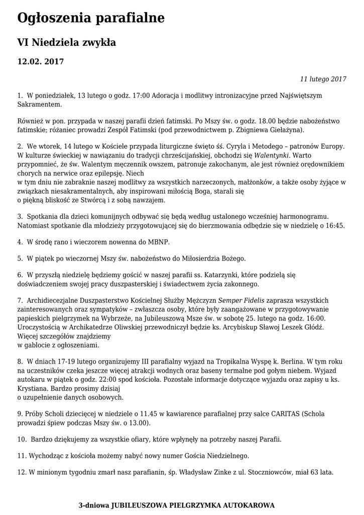 Ogłoszenia parafialne VI Niedziela zwykła 12.02. 2017 11 lutego 2017 1. W poniedziałek, 13 lutego o godz. 17:00 Adoracja i modlitwy intronizacyjne przed Najświętszym Sakramentem. Również w pon. przypada w naszej parafii dzień fatimski. Po Mszy św. o godz. 18.00 będzie nabożeństwo fatimskie; różaniec prowadzi Zespół Fatimski (pod przewodnictwem p. Zbigniewa Giełażyna). 2. We wtorek, 14 lutego w Kościele przypada liturgiczne święto śś. Cyryla i Metodego – patronów Europy. W kulturze świeckiej w nawiązaniu do tradycji chrześcijańskiej, obchodzi się Walentynki. Warto przypomnieć, że św. Walentym męczennik owszem, patronuje zakochanym, ale jest również orędownikiem chorych na nerwice oraz epilepsję. Niech w tym dniu nie zabraknie naszej modlitwy za wszystkich narzeczonych, małżonków, a także osoby żyjące w związkach niesakramentalnych, aby inspirowani miłością Boga, starali się o piękną bliskość ze Stwórcą i z sobą nawzajem. 3. Spotkania dla dzieci komunijnych odbywać się będą według ustalonego wcześniej harmonogramu. Natomiast spotkanie dla młodzieży przygotowującej się do bierzmowania odbędzie się w niedzielę o 16:45. 4. W środę rano i wieczorem nowenna do MBNP. 5. W piątek po wieczornej Mszy św. nabożeństwo do Miłosierdzia Bożego. 6. W przyszłą niedzielę będziemy gościć w naszej parafii ss. Katarzynki, które podzielą się doświadczeniem swojej pracy duszpasterskiej i świadectwem życia zakonnego. 7. Archidiecezjalne Duszpasterstwo Kościelnej Służby Mężczyzn Semper Fidelis zaprasza wszystkich zainteresowanych oraz sympatyków – zwłaszcza osoby, które były zaangażowane w przygotowywanie papieskich pielgrzymek na Wybrzeże, na Jubileuszową Msze św. w sobotę 25. lutego na godz. 16:00. Uroczystością w Archikatedrze Oliwskiej przewodniczył będzie ks. Arcybiskup Sławoj Leszek Głódź. Więcej szczegółów znajdziemy w gablocie z ogłoszeniami. 8. W dniach 17-19 lutego organizujemy III parafialny wyjazd na Tropikalna Wyspę k. Berlina. W tym roku na uczestników czeka jeszcze więcej atrakcji wodnych oraz baseny termalne pod gołym niebem. Wyjazd autokaru w piątek o godz. 22:00 spod kościoła. Pozostałe informacje dotyczące wyjazdu oraz zapisy u ks. Krystiana. Bardzo prosimy dzisiaj o uzupełnienie danych osobowych. 9. Próby Scholi dziecięcej w niedziele o 11.45 w kawiarence parafialnej przy salce CARITAS (Schola prowadzi śpiew podczas Mszy św. o 13.00). 10. Bardzo dziękujemy za wszystkie ofiary, które wpłynęły na potrzeby naszej Parafii. 11. Wychodząc z kościoła możemy nabyć nowy numer Gościa Niedzielnego. 12. W minionym tygodniu zmarł nasz parafianin, śp. Władysław Zinke z ul. Stoczniowców, miał 63 lata. 3-dniowa JUBILEUSZOWA PIELGRZYMKA AUTOKAROWA w dniach 30.04-02.05.2017 r. na trasie: Rumia Janowo – CZĘSTOCHOWA – KALISZ – LICHEŃ - TORUŃ- Rumia DZIEŃ I – wyjazd spod parafii o godz. 13:00 (parking przy DOMU KULTURY-JANOWO) przejazd do Częstochowy na godz. 20:00, zakwaterowanie w Domu Pielgrzyma i uczestnictwo w Apelu Jasnogórskim o godz. 21:00. DZIEŃ II – śniadanie, uczestnictwo we Mszy Św. o godz. 9.30, czas indywidualny na zwiedzanie Jasnej Góry i około 12:30 obiad, następnie przejazd do Kalisza, zwiedzanie Bazyliki Św. Józefa, następnie przejazd do Lichenia, zakwaterowanie w Domu Pielgrzyma, kolacja, czas wolny. DZIEŃ III – Msza Św. o godz. 07:30, śniadanie, czas wolny na indywidualne zwiedzanie Sanktuarium w Licheniu do godz. 12:30, obiad, następnie przejazd do Torunia i zwiedzanie Sanktuarium NMP Gwiazdy Nowej Ewangelizacji i Św. Jana Pawła II, następnie przejazd na starówkę Torunia, czas wolny do własnej dyspozycji, powrót do Rumii około 22:00. KOSZT JEDNEGO UCZESTNIKA 290 ZŁ. W koszta wliczono: - autobus, nocleg + śniadanie + obiad w Częstochowie, - nocleg w Licheniu + kolacja + śniadanie + obiad, - plus ofiary dla przewodników w Kaliszu i Toruniu. Zapisy: Grażyna i Ryszard Pieżgalscy (Grupa Modlitewna O.Pio) tel.: 691696835 lub 601321021 e-mail: [email protected] lub podczas spotkań grupy (po wieczornej Mszy św. w I-szy czw. m-ca lub 23 m-ca; Spotkanie organizacyjne (dla uczestników): 23 kwietnia (ndz.) godz. 18.45 w kościele uwaga: o kolejności zajmowanych miejsc decyduje miejsce na liście (po wpłaceniu całej sumy).
