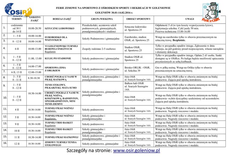 FERIE ZIMOWE NA SPORTOWO Z OŚRODKIEM SPORTU I REKREACJI W GOLENIOWIE GOLENIÓW 30.01-14.02.2016 r. TERMIN GODZINY ZAJĘĆ 1. codziennie od 30 I do 14 II 10.00-20.50 2. 1 - 5 II 10.00-14.00 3. 8 - 12 II 10.00-14.00 4. 6 II 5. 6. RODZAJ ZAJĘĆ GRUPA WIEKOWA OBIEKT SPORTOWY UWAGI SZTUCZNE LODOWISKO Przedszkolaki, uczniowie szkół podstawowych, gimnazjalnych, ponadgimnazjalnych i studenci Sztuczne lodowisko ul. Sportowa 25 Odpłatność 5 zł (w tym koszty wypożyczenia łyżew), legitymacja szkolna. Cykl jazdy 50 min. Przerwa techniczna 15.00-16.00 EUROBOISKO DLA WSZYSTKICH Szkoły Podstawowe i gimnazjalne Euroboisko, stadion OSiR, ul. Sportowa 25 Wstęp na euroboisko tylko w obuwiu przeznaczonym na sztuczną trawę. Bezpłatnie. 10.00-13.00 VI GOLENIOWSKI TURNIEJ BUDOWLI ŚNIEŻNYCH Regulamin Zespoły rodzinne 2-5 osobowe Stadion OSiR, ul. Sportowa 25 1 - 5 II 8 - 12 II 11.00, 13.00 KULIG PO STADIONIE Szkoły podstawowe i gimnazjalne Stadion OSiR ul. Sportowa 25 1 - 5 II 8 - 12 II 14.00-17.00 7. Szkoły podstawowe i gimnazjalne 6 II, 13 II 12.00-15.00 SPORTOWA ZIMA Z ORLIKIEM Boisko ORLIK - OSiR, ul. Szkolna 39 Gra w piłkę nożną. Wstęp na Orlika tylko w obuwiu przeznaczonym na sztuczną trawę. 8. 3 - 5 II 8 - 11 II 8.30-10.30 CHODŹ POGRAJ Z NAMI W PIŁKĘ SIATKOWĄ Szkoły podstawowe, gimnazjalne i ponadgimnazjalne Hala OSiR ul. Szarych Szeregów 14A Wstęp na Halę OSiR tylko w obuwiu zmiennym na białej podeszwie. Zajęcia pod opieką instruktora. 9. 1 - 5 II 8 - 12 II Balkon hali OSiR ul. Szarych Szeregów 14A Wstęp na Halę OSiR tylko w obuwiu zmiennym na białej podeszwie. Zajęcia pod opieką instruktora. Hala OSiR ul. Szarych Szeregów 14A Wstęp na Halę OSiR tylko w obuwiu zmiennym na białej podeszwie- wybór dyscypliny uzależniony od uczestników. Zajęcia pod opieką instruktora. TENIS STOŁOWY, PIŁKARZYKI, MATA SUMO 10.30-14.00 CHODŹ I POGRAJ Z NAMI W: PIŁKĘ NOŻNĄ, KOSZYKOWĄ, BADMINTON, SPEEDBADMINTON, MINI TENIS ZIEMNY Szkoły podstawowe, gimnazjalne i ponadgimnazjalne Tylko w przypadku opadów śniegu. Zgłoszenia w dniu turnieju, na pół godziny przed rozpoczęciem, własne narzędzia i elementy dekoracji. Tylko w przypadku opadów śniegu. Opłata 2 zł/ osoba. Sanki dostępne są w OSiRze. Po kuligu będzie możliwość upieczenia przyniesionych ze sobą kiełbasek. 10. 1 - 5 II 8 - 12 II 11. 4 II 10.30-14.00 TURNIEJ PIŁKI NOŻNEJ Regulamin. Szkoły podstawowe Hala OSiR ul. Szarych Szeregów 14A Wstęp na Halę OSiR tylko w obuwiu zmiennym na białej podeszwie. Nagrody rzeczowe i medale. 12. 5 II 10.30-14.00 TURNIEJ PIŁKI NOŻNEJ Regulamin. Szkoły gimnazjalne i ponadgimnazjalne Hala OSiR ul. Szarych Szeregów 14A 13. 9 II 10.30-14.00 TURNIEJ TRIO BASKET Regulamin Szkoły podstawowe Hala OSiR ul. Szarych Szeregów 14A 14. 10 II 10.30-14.00 TURNIEJ TRIO BASKET Regulamin 15. 11 II 10.30-14.00 TURNIEJ PIŁKI SIATKOWEJ 16. 12 II 10.30-14.00 ZIMOWY TURNIEJ TENISA STOŁOWEGO Wstęp na Halę OSiR tylko w obuwiu zmiennym na białej podeszwie. Nagrody rzeczowe i medale. Wstęp na Halę OSiR tylko w obuwiu zmiennym na białej podeszwie. Nagrody rzeczowe i medale. Wstęp na Halę OSiR tylko w obuwiu zmiennym na białej podeszwie. Nagrody rzeczowe i medale. Wstęp na Halę OSiR tylko w obuwiu zmiennym na białej podeszwie. Nagrody rzeczowe i medale. Wstęp na Halę OSiR tylko w obuwiu zmiennym na białej podeszwie. Nagrody rzeczowe i medale. Szkoły gimnazjalne i ponadgimnazjalne Szkoły podstawowe, gimnazjalne i ponadgimnazjalne Szkoły podstawowe, gimnazjalne Hala OSiR ul. Szarych Szeregów 14A Hala OSiR ul. Szarych Szeregów 14A Hala OSiR ul. Szarych Szeregów 14A Szczegóły na stronie: www.osir.goleniow.pl