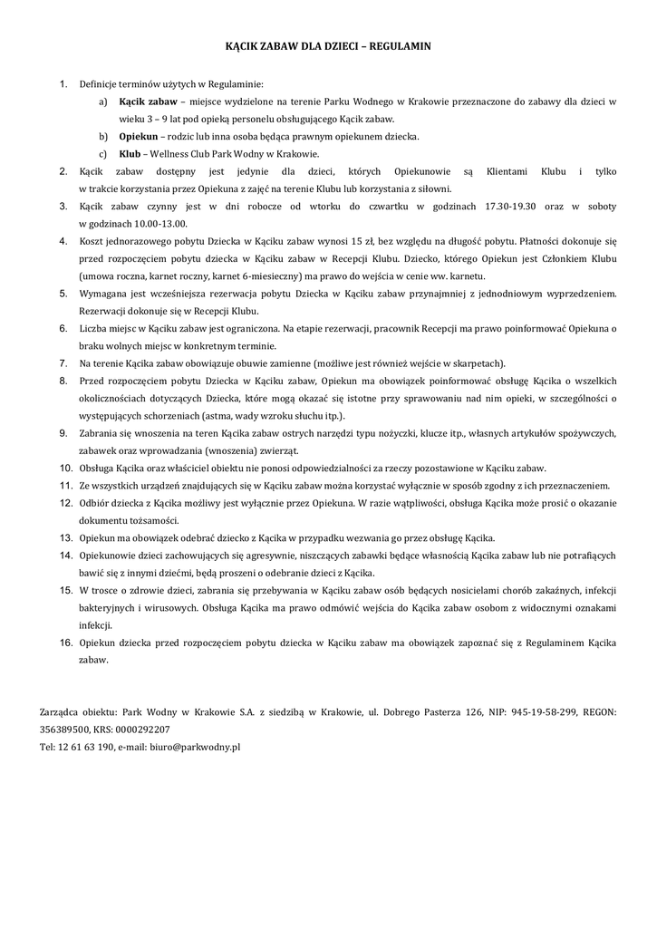 KĄCIK ZABAW DLA DZIECI – REGULAMIN 1. Definicje terminów użytych w Regulaminie: a) Kącik zabaw – miejsce wydzielone na terenie Parku Wodnego w Krakowie przeznaczone do zabawy dla dzieci w wieku 3 – 9 lat pod opieką personelu obsługującego Kącik zabaw. 2. b) Opiekun – rodzic lub inna osoba będąca prawnym opiekunem dziecka. c) Klub – Wellness Club Park Wodny w Krakowie. Kącik zabaw dostępny jest jedynie dla dzieci, których Opiekunowie są Klientami Klubu i tylko w trakcie korzystania przez Opiekuna z zajęć na terenie Klubu lub korzystania z siłowni. 3. Kącik zabaw czynny jest w dni robocze od wtorku do czwartku w godzinach 17.30-19.30 oraz w soboty w godzinach 10.00-13.00. 4. Koszt jednorazowego pobytu Dziecka w Kąciku zabaw wynosi 15 zł, bez względu na długość pobytu. Płatności dokonuje się przed rozpoczęciem pobytu dziecka w Kąciku zabaw w Recepcji Klubu. Dziecko, którego Opiekun jest Członkiem Klubu (umowa roczna, karnet roczny, karnet 6-miesieczny) ma prawo do wejścia w cenie ww. karnetu. 5. Wymagana jest wcześniejsza rezerwacja pobytu Dziecka w Kąciku zabaw przynajmniej z jednodniowym wyprzedzeniem. Rezerwacji dokonuje się w Recepcji Klubu. 6. Liczba miejsc w Kąciku zabaw jest ograniczona. Na etapie rezerwacji, pracownik Recepcji ma prawo poinformować Opiekuna o braku wolnych miejsc w konkretnym terminie. 7. Na terenie Kącika zabaw obowiązuje obuwie zamienne (możliwe jest również wejście w skarpetach). 8. Przed rozpoczęciem pobytu Dziecka w Kąciku zabaw, Opiekun ma obowiązek poinformować obsługę Kącika o wszelkich okolicznościach dotyczących Dziecka, które mogą okazać się istotne przy sprawowaniu nad nim opieki, w szczególności o występujących schorzeniach (astma, wady wzroku słuchu itp.). 9. Zabrania się wnoszenia na teren Kącika zabaw ostrych narzędzi typu nożyczki, klucze itp., własnych artykułów spożywczych, zabawek oraz wprowadzania (wnoszenia) zwierząt. 10. Obsługa Kącika oraz właściciel obiektu nie ponosi odpowiedzialności za rzeczy pozostawione w Kąciku zabaw. 11. Ze wszystkich urządzeń znajdujących się w Kąciku zabaw można korzystać wyłącznie w sposób zgodny z ich przeznaczeniem. 12. Odbiór dziecka z Kącika możliwy jest wyłącznie przez Opiekuna. W razie wątpliwości, obsługa Kącika może prosić o okazanie dokumentu tożsamości. 13. Opiekun ma obowiązek odebrać dziecko z Kącika w przypadku wezwania go przez obsługę Kącika. 14. Opiekunowie dzieci zachowujących się agresywnie, niszczących zabawki będące własnością Kącika zabaw lub nie potrafiących bawić się z innymi dziećmi, będą proszeni o odebranie dzieci z Kącika. 15. W trosce o zdrowie dzieci, zabrania się przebywania w Kąciku zabaw osób będących nosicielami chorób zakaźnych, infekcji bakteryjnych i wirusowych. Obsługa Kącika ma prawo odmówić wejścia do Kącika zabaw osobom z widocznymi oznakami infekcji. 16. Opiekun dziecka przed rozpoczęciem pobytu dziecka w Kąciku zabaw ma obowiązek zapoznać się z Regulaminem Kącika zabaw. Zarządca obiektu: Park Wodny w Krakowie S.A. z siedzibą w Krakowie, ul. Dobrego Pasterza 126, NIP: 945-19-58-299, REGON: 356389500, KRS: 0000292207 Tel: 12 61 63 190, e-mail: [email protected]
