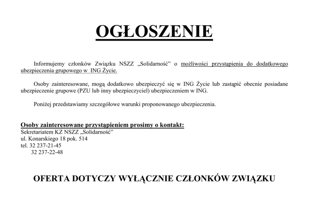 OGŁOSZENIE Informujemy członków Związku NSZZ „Solidarność” o możliwości przystąpienia do dodatkowego ubezpieczenia grupowego w ING Życie. Osoby zainteresowane, mogą dodatkowo ubezpieczyć się w ING Życie lub zastąpić obecnie posiadane ubezpieczenie grupowe (PZU lub inny ubezpieczyciel) ubezpieczeniem w ING. Poniżej przedstawiamy szczegółowe warunki proponowanego ubezpieczenia. Osoby zainteresowane przystąpieniem prosimy o kontakt: Sekretariatem KZ NSZZ „Solidarność” ul. Konarskiego 18 pok. 514 tel. 32 237-21-45 32 237-22-48 OFERTA DOTYCZY WYŁĄCZNIE CZŁONKÓW ZWIĄZKU Oferta Ubezpieczenia Grupowego na Życie (TRM6/2/2011) dla:NSZZ „S” przy Politechnice Śl. w Gliwicach Oferta ważna do 2012-07-16 Propozycja ochrony ubezpieczeniowej Wariant 1 Wysokość Świadczenia Zdarzenie Ubezpieczeniowe Śmierć Ubezpieczonego (MAIN) Śmierć Ubezpieczonego wskutek NW (ADR) Śmierć Ubezpieczonego wskutek Wypadku komunikacyjnego (ADT) Śmierć Ubezpieczonego wskutek Wypadku przy pracy (WADR) 55 000,00 zł 110 000,00 zł 140 000,00 zł 120 000,00 zł Śmierć Ubezpieczonego wskutek Wypadku przy pracy w Wypadku komunikacyjnym 150 000,00 zł Śmierć Ubezpieczonego spowodowaną zawałem serca lub udarem mózgu (HSDR) Stały lub długotrwały uszczerbek na zdrowiu Ubezpieczonego spowodowany NW (LHB) za 1% uszczerbku Stały lub długotrwały uszczerbek na zdrowiu Ubezpieczonego spowodowany zawałem serca lub udarem mózgu (LHS) za 1% uszczerbku Poważne zachorowanie Ubezpieczonego - wariant rozszerzony (CIB_B)** Pobyt Ubezpieczonego w szpitalu (HDB)** spowodowany NW od 1 do 14 dnia spowodowany NW powyżej 14 dni pobyt na OIOM spowodowany chorobą od 1 do 14 dnia spowodowany chorobą powyżej 14 dni Śmierć Małżonka (DSB) Śmierć Małżonka wskutek NW (SADR) Śmierć Małżonka wskutek wypadku komunikacyjnego (SADT) Śmierć rodzica lub śmierć rodzica Małżonka (DPB) Śmierć rodzica lub śmierć rodzica Małżonka wskutek NW (ADPB) Narodziny Dziecka (BCB) Osierocenie Dziecka (OCB) Śmierć Dziecka (DCB) Narodziny martwego Dziecka (SBB) Składka za osobę: *Dla umów obejmujących zakresem pobyt w szpitalu - dzienne świadczenie szpitalne **Mają zastosowanie karencje w dacie rozpoczęcia odpowiedzialności Nie jest wymagana ocena medyczna W razie pytań prosimy o kontakt z: nr tel.: Suma Ubezpieczenia* 55 000,00 zł 55 000,00 zł 30 000,00 zł 10 000,00 zł Wariant 2 Wysokość Świadczenia 50 000,00 zł 100 000,00 zł 130 000,00 zł 110 000,00 zł Suma Ubezpieczenia* 50 000,00 zł 50 000,00 zł 30 000,00 zł 10 000,00 zł 140 000,00 zł Wariant 3 Wysokość Świadczenia 50 000,00 zł 100 000,00 zł 130 000,00 zł 110 000,00 zł Suma Ubezpieczenia* 50 000,00 zł 50 000,00 zł 30 000,00 zł 10 000,00 zł 140 000,00 zł 70 000,00 zł 15 000,00 zł 65 000,00 zł 15 000,00 zł 65 000,00 zł 15 000,00 zł 42 000,00 zł 420,00 zł 42 000,00 zł 38 000,00 zł 380,00 zł 38 000,00 zł 38 000,00 zł 380,00 zł 38 000,00 zł 42 000,00 zł 420,00 zł 3 500,00 zł 42 000,00 zł 38 000,00 zł 380,00 zł 3 000,00 zł 38 000,00 zł 38 000,00 zł 380,00 zł 3 000,00 zł 38 000,00 zł 110,00 zł 110,00 zł 110,00 zł 55,00 zł 55,00 zł 15 000,00 zł 27 000,00 zł 27 000,00 zł - zł - zł - zł 4 000,00 zł 3 000,00 zł - zł 49,46 zł ....................... ....................... 3 500,00 zł 55,00 zł 15 000,00 zł 12 000,00 zł - zł - zł - zł - zł 4 000,00 zł 3 000,00 zł - zł 100,00 zł 100,00 zł 100,00 zł 50,00 zł 50,00 zł 12 000,00 zł 22 000,00 zł 22 000,00 zł 2 200,00 zł 2 200,00 zł - zł 4 000,00 zł 3 000,00 zł - zł 59,82 zł 3 000,00 zł 50,00 zł 12 000,00 zł 10 000,00 zł - zł 2 200,00 zł - zł - zł 4 000,00 zł 3 000,00 zł - zł 100,00 zł 100,00 zł 100,00 zł 50,00 zł 50,00 zł 12 000,00 zł 22 000,00 zł 22 000,00 zł 2 000,00 zł 2 000,00 zł 1 500,00 zł 4 000,00 zł 3 000,00 zł 3 000,00 zł 61,76 zł 3 000,00 zł 50,00 zł 12 000,00 zł 10 000,00 zł - zł 2 000,00 zł - zł 1 500,00 zł 4 000,00 zł 3 000,00 zł 3 000,00 zł Oferta Ubezpieczenia Grupowego na Życie (TRM6/2/2011) dla:NSZZ „S” przy Politechnice Śl. w Gliwicach Oferta ważna do 2012-07-16 Propozycja ochrony ubezpieczeniowej Wariant 1 Wysokość Świadczenia Zdarzenie Ubezpieczeniowe Śmierć Ubezpieczonego (MAIN) Śmierć Ubezpieczonego wskutek NW (ADR) Śmierć Ubezpieczonego wskutek Wypadku komunikacyjnego (ADT) Śmierć Ubezpieczonego wskutek Wypadku przy pracy (WADR) 1 000,00 zł 2 000,00 zł 3 000,00 zł 3 000,00 zł Śmierć Ubezpieczonego wskutek Wypadku przy pracy w Wypadku komunikacyjnym 4 000,00 zł Śmierć Ubezpieczonego spowodowaną zawałem serca lub udarem mózgu (HSDR) Śmierć Małżonka (DSB) Śmierć Małżonka wskutek NW (SADR) Śmierć Małżonka wskutek wypadku komunikacyjnego (SADT) Śmierć rodzica lub śmierć rodzica Małżonka (DPB) Śmierć rodzica lub śmierć rodzica Małżonka wskutek NW (ADPB) Narodziny Dziecka (BCB) Osierocenie Dziecka (OCB) Śmierć Dziecka (DCB) 1 000,00 zł 250,00 zł 500,00 zł 500,00 zł 500,00 zł 500,00 zł 700,00 zł 1 000,00 zł 250,00 zł Składka za osobę: 4,26 zł *Dla umów obejmujących zakresem pobyt w szpitalu - dzienne świadczenie szpitalne Nie jest wymagana ocena medyczna W razie pytań prosimy o kontakt z: ....................... nr tel.: ....................... Suma Ubezpieczenia* 1 000,00 zł 1 000,00 zł 1 000,00 zł 1 000,00 zł - zł 250,00 zł 250,00 zł - zł 500,00 zł - zł 700,00 zł 1 000,00 zł 250,00 zł