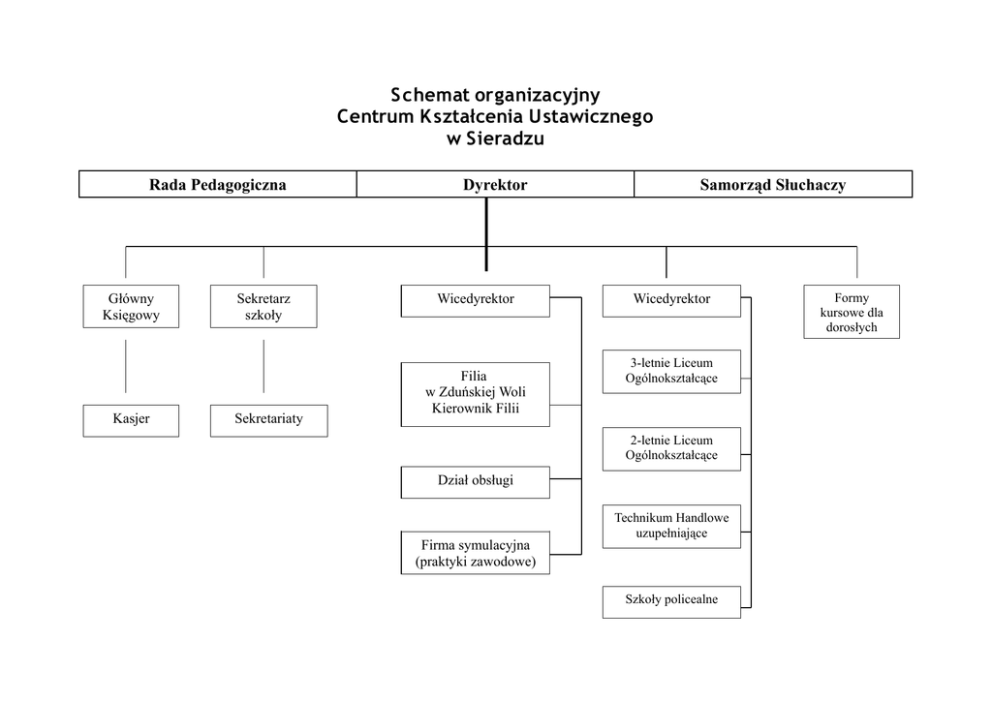 S chemat organizacyjny Centrum K ształcenia Ustawicznego w Sieradzu Rada Pedagogiczna Główny Księgowy Kasjer Sekretarz szkoły Sekretariaty Dyrektor Wicedyrektor Filia w Zduńskiej Woli Kierownik Filii Samorząd Słuchaczy Wicedyrektor 3-letnie Liceum Ogólnokształcące 2-letnie Liceum Ogólnokształcące Dział obsługi Firma symulacyjna (praktyki zawodowe) Technikum Handlowe uzupełniające Szkoły policealne Formy kursowe dla dorosłych
