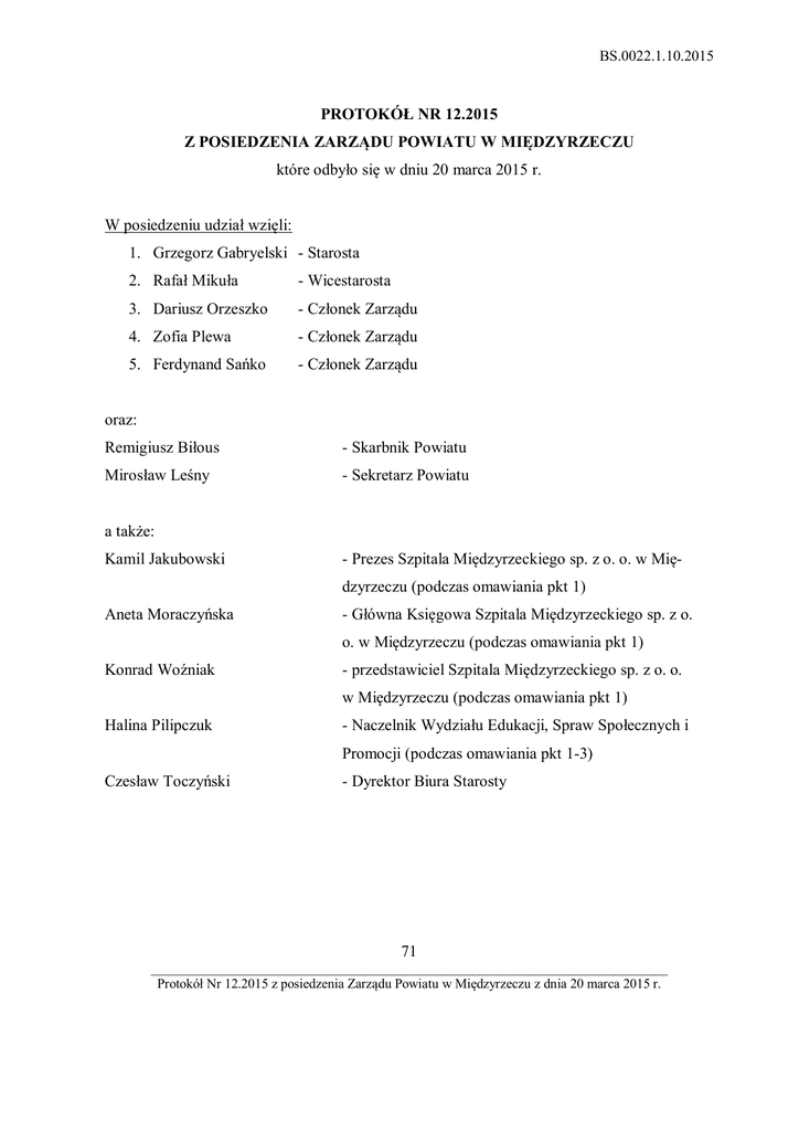 71 PROTOKÓŁ NR 12.2015 Z POSIEDZENIA ZARZĄDU POWIATU