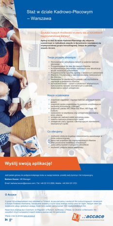 Staż w dziale Kadrowo-Płacowym – Warszawa Szukasz nowych możliwości w pięciu się po szczeblach międzynarodowej kariery? Aplikuj na staż do działu Kadrowo-Płacowego aby aktywnie uczestniczyć w rozbudowie zespołu w dynamicznie rozwijającej się międzynarodowej grupie konsultingowej. Dołącz do polskiego zespołu Accace. Twoje przyszłe obowiązki: Wprowadzanie i aktualizacja danych w systemie kadrowopłacowego Przygotowywanie list płac dla naszych Klientów Komplementacja dokumentów osobowych oraz aktualizacja teczek osobowych pracowników Przygotowywanie raportów zgodnie z określonymi założeniami Wsparcie merytoryczne w zakresie procesów realizowanych dla Klientów Nastawienie na współpracę w zespole oraz wychodzenie naprzeciw oczekiwaniom Klientów. Samodoskonalenie – udział w szkoleniach wewnętrznych, wykorzystanie narzędzi wewnętrznych w zakresie doskonalenia swoich umiejętności Nasze oczekiwania: znajomość zagadnień i regulacji kadrowo-płacowych będzie atutem znajomość języka angielskiego na poziomie umożliwiającym swobodną komunikację z Klientem znajomość pakietu MS Office (MS Word, MS Excel, MS Outlook) nastawienie na współpracę oraz umiejętność planowania pracy własnej umiejętność realizacji zadań pod presją czasu rzetelna realizacja powierzonych zadań umiejętność pracy zgodnie z obowiązującymi standardami wewnętrznymi spółki Co oferujemy: możliwość zdobycia bogatego doświadczenia zawodowego w firmie outsourcingowej praca nad projektami dla międzynarodowych Klientów stałe poszerzanie kwalifikacji zawodowych pracę pełną wyzwań w przyjaznej atmosferze możliwość podjęcia dalszej współpracy Wyślij swoją aplikację! Jeśli jesteś gotowy do podjęcia kolejnego kroku w swojej karierze, prześlij swój życiorys i list motywacyjny. Barbara Kaczor, HR Manager Email: [email protected] | Tel: +48 22 313 2950, Mobile: +48 504 021 372I O Accace Z ponad 330 profesjonalistami oraz oddziałami w 7 krajach, Accace jest jedną z wiodących firm outsourcingowych i doradczych w Europie Środkowo-Wschodniej. Sukcesywnie wcielamy w życie naszą strategię rozwoju poza ten region. Naszym celem jest świadczenie usług o globalnym zasięgu. Dzięki temu zaufało nam już ponad 1400 międzynarodowych firm. Nasze biura znajdują się w Czechach, na Węgrzech, w Rumunii, na Słowacji, w Polsce, na Ukrainie i w Niemczech. We wszystkich innych europejskich krajach działamy poprzez sieć firm partnerskich. Więcej o nas na stronie www.accace.pl