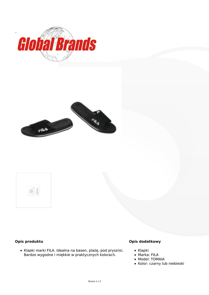 Opis produktu Opis dodatkowy Klapki marki FILA. Idealna na basen, plażę, pod prysznic. Bardzo wygodne i miękkie w praktycznych kolorach. Strona 1 z 2 Klapki Marka: FILA Model: TOMAIA Kolor: czarny lub niebieski Materiał: pianka Rozmiary: od 8 do 11,5 Cena za komplet 20 par (cena jednostkowa netto: 14 zł) Strona 2 z 2