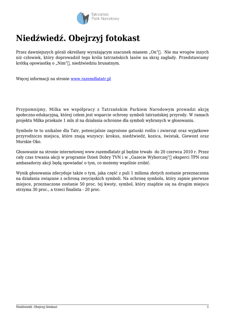 Niedźwiedź. Obejrzyj fotokast Przez dawniejszych górali określany wyrażającym szacunek mianem „On”. Nie ma wrogów innych niż człowiek, który doprowadził tego króla tatrzańskich lasów na skraj zagłady. Przedstawiamy krótką opowiastkę o „Nim”, niedźwiedziu brunatnym. Więcej informacji na stronie www.razemdlatatr.pl Przypomnijmy, Milka we współpracy z Tatrzańskim Parkiem Narodowym prowadzi akcję społeczno-edukacyjną, której celem jest wsparcie ochrony symboli tatrzańskiej przyrody. W ramach projektu Milka przekaże 1 mln zł na działania ochronne dla symboli wybranych w głosowaniu. Symbole te to unikalne dla Tatr, potencjalnie zagrożone gatunki roślin i zwierząt oraz wyjątkowe przyrodniczo miejsca, które znają wszyscy: krokus, niedźwiedź, kozica, świstak, Giewont oraz Morskie Oko. Głosowanie na stronie internetowej www.razemdlatatr.pl będzie trwało do 20 czerwca 2010 r. Przez cały czas trwania akcji w programie Dzień Dobry TVN i w „Gazecie Wyborczej” eksperci TPN oraz ambasadorzy akcji będą opowiadać o tym, co możemy wspólnie zrobić. Wynik głosowania zdecyduje także o tym, jaka część z puli 1 miliona złotych zostanie przeznaczona na działania związane z ochroną zwycięskich symboli. Na ochronę symbolu, który zajmie pierwsze miejsce, przeznaczone zostanie 50 proc. tej kwoty, symbol, który znajdzie się na drugim miejscu otrzyma 30 proc., a trzeci finalista - 20 proc. Niedźwiedź. Obejrzyj fotokast 1