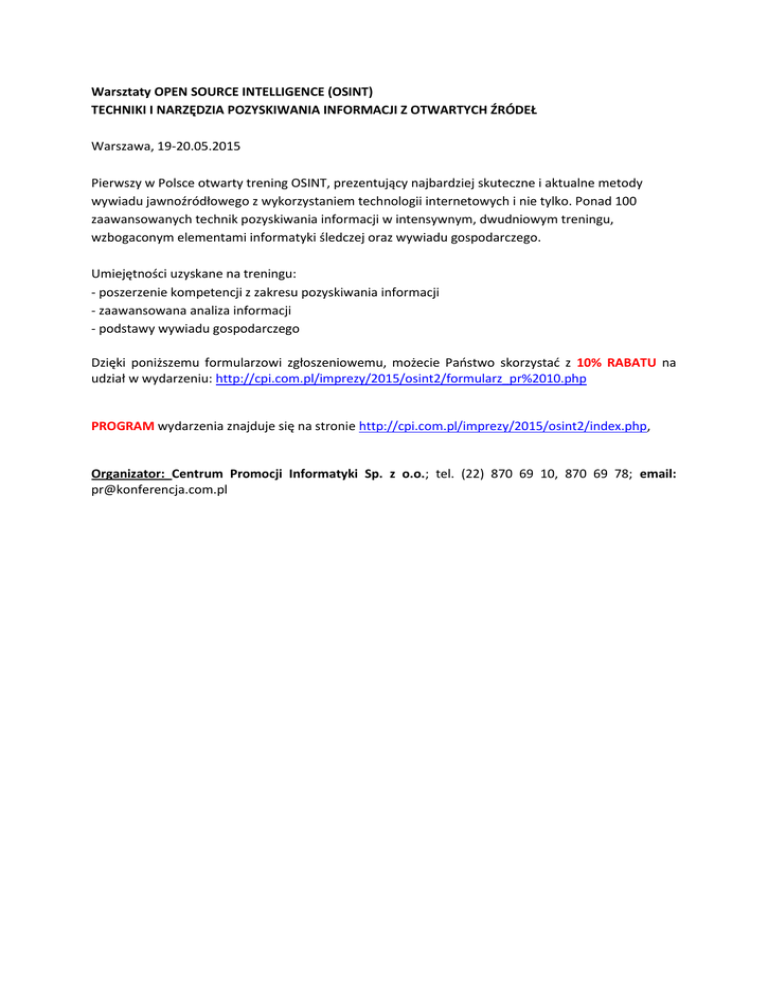 Warsztaty OPEN SOURCE INTELLIGENCE (OSINT) TECHNIKI I NARZĘDZIA POZYSKIWANIA INFORMACJI Z OTWARTYCH ŹRÓDEŁ Warszawa, 19-20.05.2015 Pierwszy w Polsce otwarty trening OSINT, prezentujący najbardziej skuteczne i aktualne metody wywiadu jawnoźródłowego z wykorzystaniem technologii internetowych i nie tylko. Ponad 100 zaawansowanych technik pozyskiwania informacji w intensywnym, dwudniowym treningu, wzbogaconym elementami informatyki śledczej oraz wywiadu gospodarczego. Umiejętności uzyskane na treningu: - poszerzenie kompetencji z zakresu pozyskiwania informacji - zaawansowana analiza informacji - podstawy wywiadu gospodarczego Dzięki poniższemu formularzowi zgłoszeniowemu, możecie Państwo skorzystać z 10% RABATU na udział w wydarzeniu: http://cpi.com.pl/imprezy/2015/osint2/formularz_pr%2010.php PROGRAM wydarzenia znajduje się na stronie http://cpi.com.pl/imprezy/2015/osint2/index.php, Organizator: Centrum Promocji Informatyki Sp. z o.o.; tel. (22) 870 69 10, 870 69 78; email: [email protected]