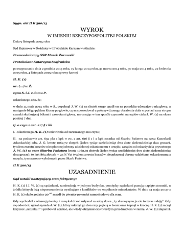 Sygn. akt II K 390/13 WYROK W IMIENIU RZECZYPOSPOLITEJ POLSKIEJ Dnia 9 listopada 2015 roku Sąd Rejonowy w Świdnicy w II Wydziale Karnym w składzie: Przewodniczący SSR Marek Żurawski Protokolant Katarzyna Szafrańska po rozpoznaniu dnia 2 grudnia 2013 roku, 19 lutego 2014 roku, 31 marca 2014 roku, 30 maja 2014 roku, 22 kwietnia 2015 roku, 4 listopada 2015 roku sprawy karnej H. K. (1) ur. (...) w Ż. syna S. i J. z domu P. oskarżonego o to, że: w dniu 15 maja 2013 roku w Ś., popchnął J. W. (1) na skutek czego upadł on na posadzkę uderzając o nią głową, a następnie bił go pękiem kluczy po głowie, czym spowodował u pokrzywdzonego obrażenia ciała w postaci rany stropu czaszki skutkującej bólami i zawrotami głowy, naruszając w ten sposób czynności narządów ciała J. W. (1) na okres poniżej 7 dni, tj. o czyn z art. 217 § 1 kk I. oskarżonego H. K. (1) uniewinnia od zarzucanego mu czynu; II. na podstawie art. 632 pkt 1 kpk w zw. z art. 616 § 1 i 2 kpk zasadza od Skarbu Państwa na rzecz Kancelarii Adwokackiej adw. J. G. kwotę 1062,72 złotych (jeden tysiąc sześćdziesiąt dwa złote siedemdziesiąt dwa grosze), tytułem zwrotu kosztów nieopłaconej obrony udzielonej oskarżonemu z urzędu; zasądza od oskarżyciela prywatnego J. W. (1) na rzecz Skarbu Państwa kwotę 1062,72 złotych (jeden tysiąc sześćdziesiąt dwa złote siedemdziesiąt dwa grosze), to jest 864 złotych + 23 % Vat tytułem zwrotu kosztów nieopłaconej obrony udzielonej oskarżonemu z urzędu, tymczasowo wyłożonych przez Skarb Państwa. II K 390/13 UZASADNIENIE Sąd ustalił następujący stan faktyczny: H. K. (1) i J. W. (1) są sąsiadami, zamieszkują w jednym budynku, pomiędzy sąsiadami panują napięte stosunki, u źródła których leżą nieporozumienia wynikające z konfliktów we wspólnocie mieszkańców. W dniu 13 maja 2013r z H. K. (1) około godziny 20 00 zszedł do piwnicy po części samochodowe dla syna. Gdy wychodził z własnej piwnicy i zamykał drzwi usłyszał za sobą słowa „ ty skurwysynu ja cie tu teraz zabiję”. Gdy się odwrócił, ujrzał sąsiada J. W. (1), który uderzył go dwa razy pięścią w twarz oraz kopnął w kroczę. H. K. (1) zaczął krzyczeć „ratunku !” i próbował uciekać, ale wtedy otrzymał cios twardym przedmiotem w ramię. J. W. (1) złapał H. K. (1) i przewrócił się plecami na ziemię pociągając za sobą H. K. (1). Gdy obaj leżeli, J. W. (1) usiłował wykręcać rękę H. K. (1), a H. K. (1) wołał o pomoc i uderzał drugą ręką tj. pięścią - w głowę J. W. (1). Wtedy do piwnicy weszła żona J. W. (1) Z. W. (1) i zaczęła uderzać H. K. (1) po głowie i plecach. H. K. (1) udało się uwolnić, po czym uciekł do swojej piwnicy. J. W. (1) zaczął skarżyć się żonie, że napadł go H. K. (1). Z. W. (1) podniosła leżący na ziemi pęk kluczy i zaczęła oskarżać H. K. (1) o to, że bił jej męża tymi kluczami. Wezwane na miejsce pogotowie zabrało J. W. (1) do szpitala. Po zdarzeniu u J. W. (1) stwierdzono ranę stropu czaszki w ilości dwóch, biegnące poprzecznie do osi długiej ciała wielkości około 3 cm. J. W. (1) skarżył się na bóle i zawroty głowy, naruszających czynności narządu ciała na okres poniżej dni siedmiu. Na skutek zdarzenia H. K. (1) doznał obrażeń ciała w postaci: nieregularnego podbiegnięcia krwawego okolicy podoczodołowej prawej, niewielkiego obrzęku, bolesności uciskowej, ograniczenia ruchomości czynnej lewego barku, naruszenie zęba prawej górnej 5, niewielkiego obrzęku moszny. Dowody: Zaświadczenie lekarskie J. W. k; 5, Karta informacyjna k; 6 Opinia lekarska dot. H. K. k; 31, Wyjaśnienia H. K. k; 38, Zeznania J. W. / częściowo / k; 38,4-5, Zeznania Z. W. / częściowo / k; 39, Dowody: Oskarżony H. K. (1) pierwotni nie przyznał się do zarzucanego mu czynu i skorzystał z przysługującego mu prawa do odmowy składania wyjaśnień. Następnie kontynuując składanie wyjaśnień przed sądem H. K. wyjaśnił zgodnie z ustalonym stanem faktycznym. H. K. (1) nie był dotychczas karany. Dowody: Wyjaśnienia H. K. k; 38, Informacja z KRK k; 189, Sąd zważył, co następuje: Sąd nie miał wątpliwości, iż oskarżyciel prywatny J. W. (1) nie udowodnił, H. K. (1) sprawstwa i winy odnośnie zarzucanego mu czynu, co w konsekwencji oznaczało konieczność uniewinnienia oskarżonego H. K. (1). Jak wynika z ustalonego stanu faktycznego, nie było bezpośrednich i obiektywnych świadków zdarzenia, którzy obserwowaliby je od samego początku. Od pewnego momentu zdarzenie obserwowała Z. W. (1), sama będąc zainteresowana wynikiem postępowania. Oczywistym więc było dla sądu, iż koniecznym jest dokonanie oceny wiarygodności oskarżyciela prywatnego i oskarżonego w oparciu o dostępny dla sądu materiał dowodowy. Sad oparł się m.in. na własnych obserwacjach poczynionych w trakcie szeregu rozpraw, oraz na dokumentacjach lekarskich znajdujących się w aktach sprawy. I tak, obrażenia ciała jakie stwierdzono u J. W. (1) w pełni odpowiadają przebiegowi zdarzenia relacjonowanemu przez oskarżonego. Istotnie obrażenia na głowie pokrzywdzonego mogły powstać w wyniku uderzania go pięścią po głowie, bądź upadku na podłogę i szarpaniny na niej. Bóle i zawroty głowy sa wrażeniami subiektywnymi i trudno orzekać o ich prawdziwości. Innych obrażeń J. W. (1) nie doznał. Natomiast jak stwierdził biegły, w opinii z dnia 14.05.2013 r. w trakcie zdarzenia H. K. (1) doznał obrażeń ciała w postaci: nieregularnego podbiegnięcia krwawego okolicy podoczodołowej prawej, niewielkiego obrzęku, bolesności uciskowej, ograniczenia ruchomości czynnej lewego barku, naruszenie zęba prawej górnej 5, niewielkiego obrzęku moszny / k - 31 /. J. W. (1) jednocześnie zaprzeczył jednak aby uderzał oskarżonego, przyznał jedynie, że go od siebie odpychał. Rodzi się więc pytanie skąd wzięły się u H. K. (1) obrażenia okolicy podoczodołow
