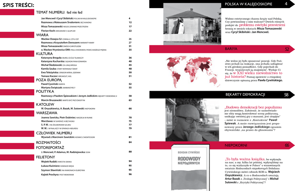 63,675(Æ&, POLSKA W KALEJDOSKOPIE TEMAT NUMERU: ład nie ład Jan Mencwel i Cyryl Skibiński: POLSKA W KALEJDOSKOPIE 4 Rozmowa z Mateuszem Środoniem: BEZ KANONU 12 Misza Tomaszewski: NEGOCJOWANIE PRZESTRZENI 17 Florian Koch: MIESZKAŃCY, GŁUPCZE! 22 WIARA Wacław Oszajca SJ: CHWAŁA, CZYLI CO? Rozmowa z Krzysztofem Doroszem: WARIANTY WIARY Misza Tomaszewski: DWÓCH CHRYSTUSÓW o. Wacław Hryniewicz OMI: PAUL EVDOKIMOV, PIEWCA BOŻEGO PIĘKNA 26 27 31 35 PRAWIE JAK W KONFESJONALE Widmo estetycznego chaosu krąży nad Polską. Czy powinniśmy z nim walczyć? Dwóch różnych podejść do problemu estetyki przestrzeni bronią w swoich tekstach Misza Tomaszewski oraz Cyryl Skibiński i Jan Mencwel. bARIYA KULTURA Katarzyna Breguła: BIURO, CO ŹLE TŁUMACZY Katarzyna Kucharska: SĄSIADKI PANA EDWARDA Michał Śledziewski: ZA LINIĄ WROGA Kamila Szuba: STARY WSPANIAŁY ŚWIAT Ewa Teleżyńska: SÁNDOR MÁRAI, DZIENNIK Tomasz Kaczor: BREAKOUT, NOL 36 40 45 48 50 51 POZA EUROPĄ Paweł Cywiński: BARIYA Martyna Świątczak: BARBARZYŃCY Rozmowy z Pawłem Śpiewakiem i Jerzym Jedlickim: BĘKARTY DEMOKRACJI 58 Marcin Bruszewski: WARTO BYĆ PRZYZWOITYM 63 KATOLEW 66 WARSZAWA Joanna Sawicka, Piotr Dubiniec: NADZIEJA W RUINIE WarsSawa: W SUKIENCE A BEZ KASKU S. P. W. : NA ŹOLIBORSKIM SZLAKU W. W. : WYNALAZCY W OPARACH ABSURDU 70 75 77 79 CZŁOWIEK NUMERU Wywiad z Marcinem Sawickim: KOSMICI Z MONTESSORI ROZMAITOŚCI FOTOREPORTAż J. Mencwel, P. Adamus, M. Radziejowska: DOM 52 „Nie wolno jej było opuszczać posesji. Gdy Państwo jechali na wakacje, ona jechała usługiwać w ich górskiej posiadłości. Gdy pojechali do Francji, wypożyczyli ją znajomym”. Wydaje Ci się, że w XXI wieku niewolnictwo to już historia? Poznaj opowieść o etiopskiej dziewczynie opisaną przez Pawła Cywińskiego. 52 55 POLITYKA W. Onyszkiewicz, A. Bazak, M. Sutowski: NIEPOKORNI 4 bęKARTY DEMOKRACJI 58 „Budowa demokracji bez populizmu jest niemożliwa. Założenie, że samoświadome elity mogą kontrolować scenę polityczną, unikając swoistej gry z masami, jest utopijne” – mówi w rozmowie z „Kontaktem” Paweł Śpiewak . A może rozwiązaniem jest proponowany przez Jerzego Jedlickiego egzamin obywatelski „na prawo do głosowania”? 81 84 NIEPOKORNI 88 FELIETONY Wojtek Rudzki: KWESTIA SMAKU 94 Łukasz Kuśmierz: KAWAŁEK MIĘSA 95 Szymon Sławiński: NA RAMIONACH OLBRZYMA 95 Kajtek Prochyra: POST MEMORIAM 96 „To była ważna książka, bo wpłynęła na nas, a my, kilka lat później, wpłynęliśmy na to, co się wydarzyło w Polsce” o wznowionych ostatnio Rodowodach niepokornych Bohdana Cywińskiego mówi członek KOR-u, Wojciech Onyszkiewicz. A co o Rodowodach uważają Artur Bazak z „Teologii Politycznej” i Michał Sutowski z „Krytyki Politycznej”? 66