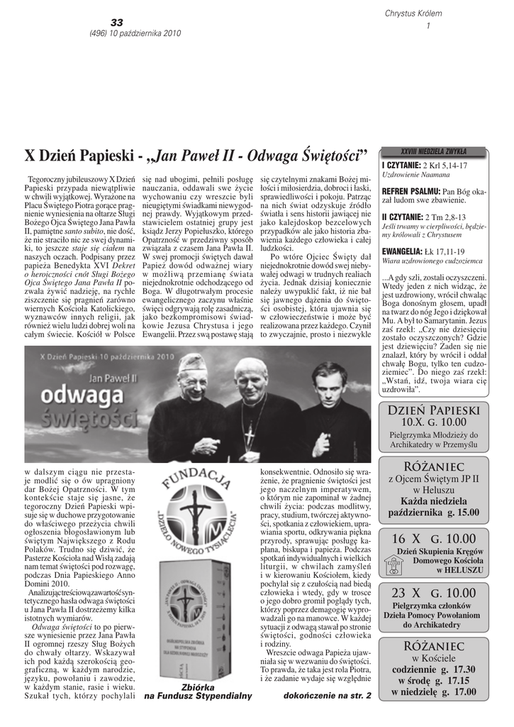 Chrystus Królem 1 33 (496) 10 października 2010 X Dzień Papieski - „Jan Paweł II - Odwaga Świętości” Tegoroczny jubileuszowy X Dzień Papieski przypada niewątpliwie w chwili wyjątkowej. Wyrażone na Placu Świętego Piotra gorące pragnienie wyniesienia na ołtarze Sługi Bożego Ojca Świętego Jana Pawła II, pamiętne santo subito, nie dość, że nie straciło nic ze swej dynamiki, to jeszcze staje się ciałem na naszych oczach. Podpisany przez papieża Benedykta XVI Dekret o heroiczności cnót Sługi Bożego Ojca Świętego Jana Pawła II pozwala żywić nadzieję, na rychłe ziszczenie się pragnień zarówno wiernych Kościoła Katolickiego, wyznawców innych religii, jak również wielu ludzi dobrej woli na całym świecie. Kościół w Polsce się nad ubogimi, pełnili posługę nauczania, oddawali swe życie wychowaniu czy wreszcie byli nieugiętymi świadkami niewygodnej prawdy. Wyjątkowym przedstawicielem ostatniej grupy jest ksiądz Jerzy Popiełuszko, którego Opatrzność w przedziwny sposób związała z czasem Jana Pawła II. W swej promocji świętych dawał Papież dowód odważnej wiary w możliwą przemianę świata niejednokrotnie odchodzącego od Boga. W długotrwałym procesie ewangelicznego zaczynu właśnie święci odgrywają rolę zasadniczą, jako bezkompromisowi świadkowie Jezusa Chrystusa i jego Ewangelii. Przez swą postawę stają się czytelnymi znakami Bożej miłości i miłosierdzia, dobroci i łaski, sprawiedliwości i pokoju. Patrząc na nich świat odzyskuje źródło światła i sens historii jawiącej nie jako kalejdoskop bezcelowych przypadków ale jako historia zbawienia każdego człowieka i całej ludzkości. Po wtóre Ojciec Święty dał niejednokrotnie dowód swej niebywałej odwagi w trudnych realiach życia. Jednak dzisiaj koniecznie należy uwypuklić fakt, iż nie bał się jawnego dążenia do świętości osobistej, która ujawnia się w człowieczeństwie i może być realizowana przez każdego. Czynił to zwyczajnie, prosto i niezwykle XXVIII NIEDZIELA ZWYKŁA I CZYTANIE: 2 Krl 5,14-17 Uzdrowienie Naamana REFREN PSALMU: Pan Bóg okazał ludom swe zbawienie. II CZYTANIE: 2 Tm 2,8-13 Jeśli trwamy w cierpliwości, będziemy królowali z Chrystusem EWANGELIA: Łk 17,11-19 Wiara uzdrowionego cudzoziemca ...A gdy szli, zostali oczyszczeni. Wtedy jeden z nich widząc, że jest uzdrowiony, wrócił chwaląc Boga donośnym głosem, upadł na twarz do nóg Jego i dziękował Mu. A był to Samarytanin. Jezus zaś rzekł: „Czy nie dziesięciu zostało oczyszczonych? Gdzie jest dziewięciu? Żaden się nie znalazł, który by wrócił i oddał chwałę Bogu, tylko ten cudzoziemiec”. Do niego zaś rzekł: „Wstań, idź, twoja wiara cię uzdrowiła”. Dzień Papieski 10.X. g. 10.00 Pielgrzymka Młodzieży do Archikatedry w Przemyślu w dalszym ciągu nie przestaje modlić się o ów upragniony dar Bożej Opatrzności. W tym kontekście staje się jasne, że tegoroczny Dzień Papieski wpisuje się w duchowe przygotowanie do właściwego przeżycia chwili ogłoszenia błogosławionym lub świętym Największego z Rodu Polaków. Trudno się dziwić, że Pasterze Kościoła nad Wisłą zadają nam temat świętości pod rozwagę, podczas Dnia Papieskiego Anno Domini 2010. Analizując treściową zawartość syntetycznego hasła odwaga świętości u Jana Pawła II dostrzeżemy kilka istotnych wymiarów. Odwaga świętości to po pierwsze wyniesienie przez Jana Pawła II ogromnej rzeszy Sług Bożych do chwały ołtarzy. Wskazywał ich pod każdą szerokością geograficzną, w każdym narodzie, języku, powołaniu i zawodzie, w każdym stanie, rasie i wieku. Szukał tych, którzy pochylali Zbiórka na Fundusz Stypendialny konsekwentnie. Odnosiło się wrażenie, że pragnienie świętości jest jego naczelnym imperatywem, o którym nie zapominał w żadnej chwili życia: podczas modlitwy, pracy, studium, twórczej aktywności, spotkania z człowiekiem, uprawiania sportu, odkrywania piękna przyrody, sprawując posługę kapłana, biskupa i papieża. Podczas spotkań indywidualnych i wielkich liturgii, w chwilach zamyśleń i w kierowaniu Kościołem, kiedy pochylał się z czułością nad biedą człowieka i wtedy, gdy w trosce o jego dobro gromił poglądy tych, którzy poprzez demagogię wyprowadzali go na manowce. W każdej sytuacji z odwagą stawał po stronie świętości, godności człowieka i rodziny. Wreszcie odwaga Papieża ujawniała się w wezwaniu do świętości. To prawda, że taka jest rola Piotra, i że zadanie wydaje się względnie dokończenie na str. 2 Różaniec z Ojcem Świętym JP II w Heluszu Każda niedziela października g. 15.00 16 X g. 10.00 Dzień Skupienia Kręgów Domowego Kościoła w HELUSZU 23 X g. 10.00 Pielgrzymka członków Dzieła Pomocy Powołaniom do Archikatedry Różaniec w Kościele codziennie g. 17.30 w środę g. 17.15 w niedzielę g. 17.00 Chrystus Królem X Dzień Papieski - „Jan Pa- prawdziwym. Akcentował przy weł II - Odwaga Świętości” tym nie tylko wysiłek człowieka II Przemyski Marsz za życiem i rodziną Życie ludzkie jest święte i nienaruszalne… Człowiek już w łonie matki należy do Boga. (EV, Jan Paweł II). Tymczasem we współczesnym świecie brak szacunku dla życia najsłabszych, a zwłaszcza nienarodzonych, owocuje różnymi formami niszczenia lub instrumentalnego traktowania istot ludzkich. Jednocześnie w różny sposób osłabia się pozycję rodziny, która jest jedynym środowiskiem prawidłowego wzrostu i rozwoju człowieka. Marsz za życiem i rodziną jest organizowany w celu podjęcia wspólnej modlitwy i promocji dzieł służących obronie życia i rodziny. Marsz z założenia jest apolityczny i modlitewny. dokończenie ze str. 1 proste wobec poszukujących Boga w pokorze. Niemniej jednak w czasach ukrytej lub wręcz jawnej kpiny ze świętości trzeba było być niezwykle odważnym, aby nieprzekonanym ukazywać sens świętości. Jan Pa
