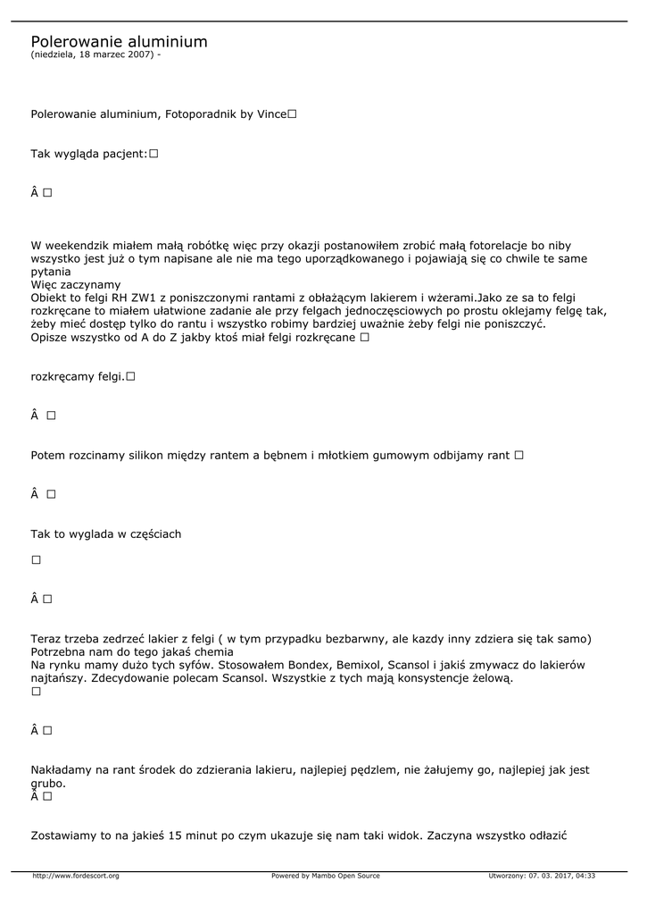 Polerowanie aluminium (niedziela, 18 marzec 2007) - Polerowanie aluminium, Fotoporadnik by Vince Tak wygląda pacjent:  W weekendzik miałem małą robótkę więc przy okazji postanowiłem zrobić małą fotorelacje bo niby wszystko jest już o tym napisane ale nie ma tego uporządkowanego i pojawiają się co chwile te same pytania Więc zaczynamy Obiekt to felgi RH ZW1 z poniszczonymi rantami z obłażącym lakierem i wżerami.Jako ze sa to felgi rozkręcane to miałem ułatwione zadanie ale przy felgach jednoczęsciowych po prostu oklejamy felgę tak, żeby mieć dostęp tylko do rantu i wszystko robimy bardziej uważnie żeby felgi nie poniszczyć. Opisze wszystko od A do Z jakby ktoś miał felgi rozkręcane rozkręcamy felgi.  Potem rozcinamy silikon między rantem a bębnem i młotkiem gumowym odbijamy rant  Tak to wyglada w częściach  Teraz trzeba zedrzeć lakier z felgi ( w tym przypadku bezbarwny, ale kazdy inny zdziera się tak samo) Potrzebna nam do tego jakaś chemia Na rynku mamy dużo tych syfów. Stosowałem Bondex, Bemixol, Scansol i jakiś zmywacz do lakierów najtańszy. Zdecydowanie polecam Scansol. Wszystkie z tych mają konsystencje żelową.  Nakładamy na rant środek do zdzierania lakieru, najlepiej pędzlem, nie żałujemy go, najlepiej jak jest grubo.  Zostawiamy to na jakieś 15 minut po czym ukazuje się nam taki widok. Zaczyna wszystko odłazić http://www.fordescort.org Powered by Mambo Open Source Utworzony: 07. 03. 2017, 04:33 Bierzemy jakiś kawałek drewienka żeby nie porysować alu i zdzieramy to co zeszło  Płuczemy wodą (najlepiej ciepłą) i patrzymy co nam zeszło a gdzie należy nałożyć powtórnie środek Czynność powtarzamy aż zejdzie wszystko do gołego aluminum. Teraz czas na usunięcie wszelkich zanieszyczeń, rys, wżerów i wszystkiego innego. W zależności od stanu powierzchni zaczynamy od odpowiedniego papieru ściernego.Ważne zeby były to papiery wodne !. Ja zaczynałem od 240 bo były spore wżery. I tak stopniowo poprzez papier 600, 1200, 2000,2500 doprowadzamy powierzchnie do idealnej gładzi bez rys i wszelkich innych niechcianych rzeczy. Oczywiscie jak będzie potrzeba to używamy innych papierów Tak to wyglądało po papierze 2000  Teraz czas na wykończenie naszej pracy, czyli własnie polerke Potrzbne są: Krązek polerski:może być filc, może być szmaciany ( na zdjeciu), wiertarka bo ręcznie nie polecam, no i pasta. Polecam Autosol albo Automax nakładamy paste na rant, włączamy wiertare z uprzednio założonym krążkiem i do pracy Po kilku minutach wygląda to tak: No i to cała filozofia polerki. Trzeba mieć cierpliowść i mocne palce do machania papierem Tak szybciutko jeszcze dokończymy składanie felgi Silikon na felge zeby skleić i uszczelnić rant akladamy delikatnie rant i przykręcamy po przekątnej na 4 śruby żeby równo doszedł do bębna potem wkręcamy wszystkie śrubki.Jak już wszystko jest skręcone felge stawiamy i po wewnętrznej stronie uszczelniamy silikonem Felga w tym momencie jest gotowa. Oczywiście silikon musi wyschnąc więc nie zakładać od razu opon na to Cieszymy się odnowioną felgą  a tak wygląda zrobiony cały komplecik To by było na tyle. Dokładnie tak samo możemy wypolerować sobie wszystko co z aluminium mamy. Oczywiście im bardziej skomplikowane kształty i więcej zakamarków tym więcej roboty. Mam nadzieje ze http://www.fordescort.org Powered by Mambo Open Source Utworzony: 07. 03. 2017, 04:33 komuś się przyda i nie bedzie kolejnych wątków o polerke. W razie pytań, pisać. Postaram się pomóc. Porada i fotorelacja by Vince publikacja masterostry http://www.fordescort.org Powered by Mambo Open Source Utworzony: 07. 03. 2017, 04:33
