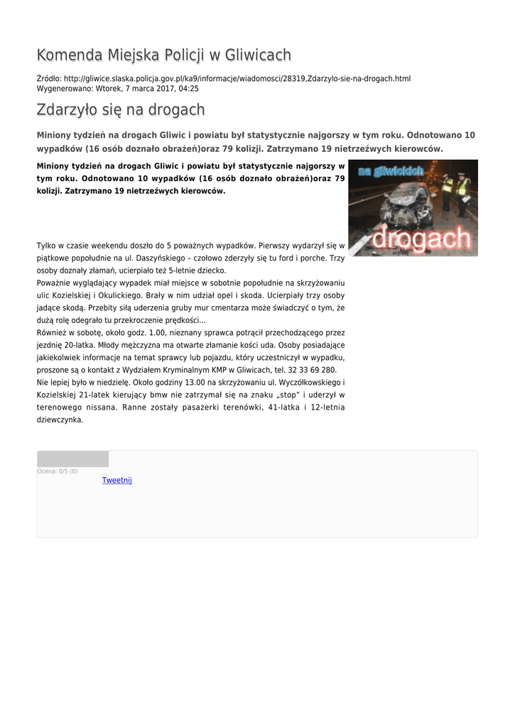 Komenda Miejska Policji w Gliwicach Źródło: http://gliwice.slaska.policja.gov.pl/ka9/informacje/wiadomosci/28319,Zdarzylo-sie-na-drogach.html Wygenerowano: Wtorek, 7 marca 2017, 04:25 Zdarzyło się na drogach Miniony tydzień na drogach Gliwic i powiatu był statystycznie najgorszy w tym roku. Odnotowano 10 wypadków (16 osób doznało obrażeń)oraz 79 kolizji. Zatrzymano 19 nietrzeźwych kierowców. Miniony tydzień na drogach Gliwic i powiatu był statystycznie najgorszy w tym roku. Odnotowano 10 wypadków (16 osób doznało obrażeń)oraz 79 kolizji. Zatrzymano 19 nietrzeźwych kierowców. Tylko w czasie weekendu doszło do 5 poważnych wypadków. Pierwszy wydarzył się w piątkowe popołudnie na ul. Daszyńskiego – czołowo zderzyły się tu ford i porche. Trzy osoby doznały złamań, ucierpiało też 5-letnie dziecko. Poważnie wyglądający wypadek miał miejsce w sobotnie popołudnie na skrzyżowaniu ulic Kozielskiej i Okulickiego. Brały w nim udział opel i skoda. Ucierpiały trzy osoby jadące skodą. Przebity siłą uderzenia gruby mur cmentarza może świadczyć o tym, że dużą rolę odegrało tu przekroczenie prędkości... Również w sobotę, około godz. 1.00, nieznany sprawca potrącił przechodzącego przez jezdnię 20-latka. Młody mężczyzna ma otwarte złamanie kości uda. Osoby posiadające jakiekolwiek informacje na temat sprawcy lub pojazdu, który uczestniczył w wypadku, proszone są o kontakt z Wydziałem Kryminalnym KMP w Gliwicach, tel. 32 33 69 280. Nie lepiej było w niedzielę. Około godziny 13.00 na skrzyżowaniu ul. Wyczółkowskiego i Kozielskiej 21-latek kierujący bmw nie zatrzymał się na znaku „stop” i uderzył w terenowego nissana. Ranne zostały pasażerki terenówki, 41-latka i 12-letnia dziewczynka. Ocena: 0/5 (0) Tweetnij
