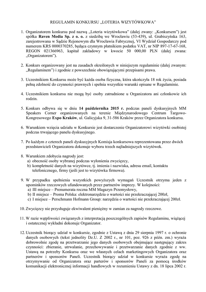 REGULAMIN KONKURSU „LOTERIA WIZYTÓWKOWA” 1. Organizatorem konkursu pod nazwą „Loteria wizytówkowa” (dalej zwany: „Konkursem”) jest spółka Raven Media Sp. z o. o. z siedzibą we Wrocławiu (53-439), ul. Grabiszyńska 163, zarejestrowana w Sądzie Rejonowym dla Wrocławia Fabrycznej, VI Wydział Gospodarczy pod numerem KRS 0000370285, będąca czynnym płatnikiem podatku VAT, nr NIP 897-17-67-168, REGON 021366963, kapitał zakładowy w kwocie 50 000,00 PLN (dalej zwana: „Organizatorem”). 2. Konkurs organizowany jest na zasadach określonych w niniejszym regulaminie (dalej zwanym: „Regulaminem”) i zgodnie z powszechnie obowiązującymi przepisami prawa. 3. Uczestnikiem Konkursu może być każda osoba fizyczna, która ukończyła 18 rok życia, posiada pełną zdolność do czynności prawnych i spełnia wszystkie warunki opisane w Regulaminie. 4. Uczestnikiem konkursu nie mogą być osoby zatrudnione u Organizatora ani członkowie ich rodzin. 5. Konkurs odbywa się w dniu 14 października 2015 r. podczas paneli dyskusyjnych MM Speakers Corner organizowanych na terenie Międzynarodowego Centrum TargowoKongresowego Expo Kraków, ul. Galicyjska 9, 31-586 Kraków przez Organizatora konkursu. 6. Warunkiem wzięcia udziału w Konkursie jest dostarczenie Organizatorowi wizytówki osobistej podczas trwającego panelu dyskusyjnego. 7. Po każdym z czterech paneli dyskusyjnych Komisja konkursowa reprezentowana przez dwóch przedstawicieli Organizatora dokonuje wyboru trzech najładniejszych wizytówek. 8. Warunkiem zdobycia nagrody jest: a) obecność osoby wybranej podczas wyłonienia zwycięzcy, b) kompletność danych na wizytówce, tj. imienia i nazwiska, adresu email, kontaktu telefonicznego, firmy (jeśli jest to wizytówka firmowa). 9. W przypadku spełnienia wszystkich powyższych wymagań Uczestnik otrzyma jeden z upominków rzeczowych ufundowanych przez partnerów imprezy. W kolejności: a) III miejsce – Prenumerata roczna MM Magazyn Przemysłowy, b) II miejsce – Proma Polska: elektronarzędzia o wartości nie przekraczającej 200zł, c) I miejsce – Perschmann Hofmann Group: narzędzia o wartości nie przekraczającej 200zł. 10. Zwycięzcy nie przysługuje ekwiwalent pieniężny w zamian za nagrody rzeczowe. 11. W razie wątpliwości związanych z interpretacją poszczególnych zapisów Regulaminu, wiążącej i ostatecznej wykładni dokonuje Organizator. 12. Uczestnik biorący udział w konkursie, zgodnie z Ustawą z dnia 29 sierpnia 1997 r. o ochronie danych osobowych (tekst jednolity Dz.U. Z 2002 r., nr 101, poz. 926 z późn. zm.) wyraża dobrowolnie zgodę na przetwarzanie jego danych osobowych obejmujące następujący zakres czynności: zbieranie, utrwalanie, przechowywanie i przetwarzanie danych zgodnie z ww. Ustawą na potrzeby Konkursu oraz we własnych celach marketingowych Organizatora oraz partnerów i sponsorów Paneli. Uczestnik biorący udział w konkursie wyraża zgodę na otrzymywanie od Organizatora oraz parterów i sponsorów Paneli za pomocą środków komunikacji elektronicznej informacji handlowych w rozumieniu Ustawy z dn. 18 lipca 2002 r. o świadczeniu usług drogą elektroniczną (Dz. U. nr 144, poz. 1204) przesyłanych na adres poczty elektronicznej wskazany na wizytówce. Dane osobowe uczestnika biorącego udział w konkursie podlegają ochronie przewidzianej w Ustawie z dnia 29 sierpnia 1997 r. o ochronie danych osobowych (tekst jednolity Dz.U. z 2002, Nr 101, poz. 926 z późn. zm.). 13. Organizator zastrzega, że nie ponosi odpowiedzialności za: a) zdarzenia uniemożliwiające prawidłowe przeprowadzenie Konkursu, których nie był w stanie przewidzieć lub którym nie mógł zapobiec, w szczególności w przypadku zaistnienia zdarzeń losowych w tym siły wyższej; b) niedoręczenie Uczestnikowi nagrody spowodowane brakiem obecności podczas wyboru zwycięzcy; c) przerwy w funkcjonowaniu akcji zaistniałe z przyczyn technicznych (np. konserwacja, przegląd, wymiana sprzętu) lub niezależnych od Organizatora. 14. Organizator zastrzega sobie prawo zmiany postanowień niniejszego Regulaminu w przypadku zmian przepisów prawnych lub innych istotnych zdarzeń mających wpływ na organizowanie Konkursu. 15. Regulamin dostępny jest w siedzibie Organizatora oraz na stronie internetowej Organizatora www.magazynprzemyslowy.pl.