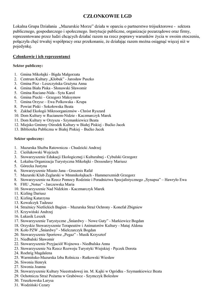 CZŁONKOWIE LGD Lokalna Grupa Działania „Mazurskie Morze” działa w oparciu o partnerstwo trójsektorowe - sektora publicznego, gospodarczego i społecznego. Instytucje publiczne, organizacje pozarządowe oraz firmy, reprezentowane przez ludzi chcących działać razem na rzecz poprawy warunków życia w swoim otoczeniu, połączyła chęć trwałej współpracy oraz przekonanie, że działając razem można osiągnąć więcej niż w pojedynkę. Członkowie i ich reprezentanci Sektor publiczny: 1. 2. 3. 4. 5. 6. 7. 8. 9. 10. 11. 12. 13. Gmina Mikołajki - Bigda Małgorzata Centrum Kultury „Kłobuk” - Jarosław Puszko Gmina Pisz - Leszczyńska Grażyna Anna Gmina Biała Piska - Słonawski Sławomir Gmina Ruciane-Nida - Syta Karol Gmina Piecki – Grzegorz Maksymow Gmina Orzysz – Ewa Polkowska - Krupa Powiat Piski - Sokołowska Beata Zakład Ekologii Mikroorganizmów - Chróst Ryszard Dom Kultury w Rucianem-Nidzie - Kaczmarczyk Marek Dom Kultury w Orzyszu - Szymankiewicz Beata Miejsko Gminny Ośrodek Kultury w Białej Piskiej - Bućko Jacek Biblioteka Publiczna w Białej Piskiej – Bućko Jacek Sektor społeczny: 1. 2. 3. 4. 5. 6. 7. 8. 9. 10. 11. 12. 13. 14. 15. 16. 17. 18. 19. 20. 21. 22. 23. 24. 25. 26. 27. 28. 29. 30. 31. Mazurska Służba Ratownicza - Chudzicki Andrzej Cieślukowski Wojciech Stowarzyszenie Edukacji Ekologicznej i Kulturalnej - Cybulski Grzegorz Lokalna Organizacja Turystyczna Mikołajki - Dessoulavy Mariusz Górecka Justyna Stowarzyszenie Miasto Jana - Grusznis Rafał Mazurski Klub Żeglarski w Mmmikołajkach - Hammerszmidt Grzegorz Stowarzyszenie na Rzecz Pomocy Rodzinie i Poradnictwa Specjalistycznego „Synapsa” – Hawryło Ewa FHU „Notus” - Jarczewska Maria Stowarzyszenie Nad Nidzkim - Kaczmarczyk Marek Kizling Dariusz Kizling Katarzyna Kowalczyk Tadeusz Strażnicy Nietlickich Bagien – Mazurska Straż Ochrony - Konefał Zbigniew Krzywiński Andrzej Łukasik Leszek Stowarzyszenie Turystyczne „Śniardwy – Nowe Guty” - Markiewicz Bogdan Orzyskie Stowarzyszenie Terapeutów i Animatorów Kultury - Mataj Aldona Koło PZW „Śniardwy” - Mielczarczyk Bogdan Stowarzyszenie Sportowe „Pegaz” - Musik Krzysztof Niedbalski Sławomir Stowarzyszenie Przyjaciół Wojnowa - Niedbalska Anna Stowarzyszenie Na Rzecz Rozwoju Turystyki Wiejskiej - Pęczek Dorota Roehrig Magdalena Warmińsko-Mazurska Izba Rolnicza - Rutkowski Wiesław Siwonia Henryk Siwonia Joanna Stowarzyszenie Kultury Nieestradowej im. M. Kajki w Ogródku - Szymankiewicz Beata Ochotnicza Straż Pożarna w Grabówce - Szymczyk Bolesław Truszkowska Larysa Wodziński Cezary 32. 33. 34. 35. 36. 37. 38. 39. 40. 41. 42. 43. 44. 45. 46. 47. 48. 49. 50. 51. 52. 53. 54. 55. Stowarzyszenie Oświatowo Kulturalne Zełwągi - Wróbel Joanna Lokalna Organizacja Turystyczna „Mazury Południowe” - Ciukszo Kinga Zęgota Zbigniew FHU „DANET” - Bućko Jacek Stowarzyszenie Miłośników Kultury „Nasza Biała” – Bućko Jacek Rybak - Sawa Władysław Rybak - Aścik Adam Rybak - Czeraniuk Józef Witkowski Zbigniew Witkiewicz Adam Tymiński Piotr Uczniowski Klub Sportowy „Hetman” - Kiśluk Jacek Parafia Ewangelicko-Augsburska Św. Trójcy - Ks. Juroszek Bogusław Adamiec Józef Stowarzyszenie Właścicieli Domków Rekreacyjnych - Marcinkiewicz Romuald Kobus Mariola Stowarzyszenie Rozwoju i Integracji Środowisk Wiejskich w Gminie Biała Piska Kulik Andrzej Piwowarska Dorota Truszkowski Marek Grajko Dariusz Kozłowska Magdalena Panas – Żyszkowska Hanna Gajewscy Małgorzata i Henryk Sektor gospodarczy: 1. 2. 3. 4. 5. 6. 7. 8. 9. 10. 11. 12. 13. 14. 15. 16. 17. 18. 19. 20. 21. 22. 23. 24. 25. Barma Robert FHU „Notus” - Hawryło Marcin Biuro Rachunkowe - Kubicka Walentyna Leszczyński Jan Warmińsko-Mazurski Bank Spółdzielczy - Małecka Katarzyna S.C. „Koliberek” - Małecki Marek Potocki Alexander „Przygoda” Usługi Turystyczne dla Dzieci i Młodzieży - Siwonia Wanda Wieczorek Stanisław Gospodarstwo Rybackie „Śniardwy” - Kragiel Marek Gospodarstwo Rybackie „Mikołajki” - Wiszowaty Cezary Gospodarstwo Agroturystyczne - Gworek Mirosław Gospodarstwo Rybackie PZW w Suwałkach - Lisowski Karol Puzio Edmund F.H.U. „Juka” - Żebrowska Ewa Gospodarstwo Ekologiczne - Konefał Witold Konefał Anna Hotel „Na Skarpie” - Brzostek Halina Swat Katarzyna Campin Wejsunek - Zakrzewska Wiesława Aleszczyk Jan Tumiński Jakub Aleszczyk Krystyna PHU „Grot” Jacek Olszewski Gminna Spółka Wodna – Konefał Witold