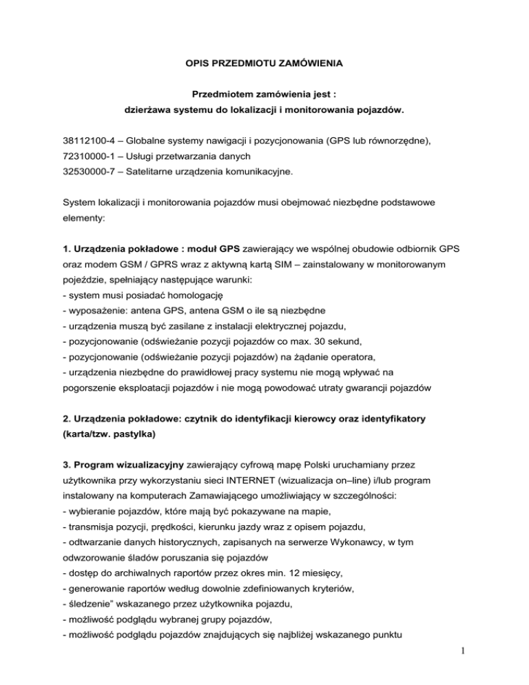 OPIS PRZEDMIOTU ZAMÓWIENIA Przedmiotem zamówienia jest : dzierżawa systemu do lokalizacji i monitorowania pojazdów. 38112100-4 – Globalne systemy nawigacji i pozycjonowania (GPS lub równorzędne), 72310000-1 – Usługi przetwarzania danych 32530000-7 – Satelitarne urządzenia komunikacyjne. System lokalizacji i monitorowania pojazdów musi obejmować niezbędne podstawowe elementy: 1. Urządzenia pokładowe : moduł GPS zawierający we wspólnej obudowie odbiornik GPS oraz modem GSM / GPRS wraz z aktywną kartą SIM – zainstalowany w monitorowanym pojeździe, spełniający następujące warunki: - system musi posiadać homologację - wyposażenie: antena GPS, antena GSM o ile są niezbędne - urządzenia muszą być zasilane z instalacji elektrycznej pojazdu, - pozycjonowanie (odświeżanie pozycji pojazdów co max. 30 sekund, - pozycjonowanie (odświeżanie pozycji pojazdów) na żądanie operatora, - urządzenia niezbędne do prawidłowej pracy systemu nie mogą wpływać na pogorszenie eksploatacji pojazdów i nie mogą powodować utraty gwarancji pojazdów 2. Urządzenia pokładowe: czytnik do identyfikacji kierowcy oraz identyfikatory (karta/tzw. pastylka) 3. Program wizualizacyjny zawierający cyfrową mapę Polski uruchamiany przez użytkownika przy wykorzystaniu sieci INTERNET (wizualizacja on–line) i/lub program instalowany na komputerach Zamawiającego umożliwiający w szczególności: - wybieranie pojazdów, które mają być pokazywane na mapie, - transmisja pozycji, prędkości, kierunku jazdy wraz z opisem pojazdu, - odtwarzanie danych historycznych, zapisanych na serwerze Wykonawcy, w tym odwzorowanie śladów poruszania się pojazdów - dostęp do archiwalnych raportów przez okres min. 12 miesięcy, - generowanie raportów według dowolnie zdefiniowanych kryteriów, - śledzenie” wskazanego przez użytkownika pojazdu, - możliwość podglądu wybranej grupy pojazdów, - możliwość podglądu pojazdów znajdujących się najbliżej wskazanego punktu 1 - możliwość jednoczesnej pracy na kilku stanowiskach – nieograniczona ilość użytkowników, - interfejs, wszystkie komunikaty i pliki pomocy w całości w języku polskim, - możliwość wprowadzenia/zaimportowania do systemu faktur zakupu/dokumentów WZ paliwa, skojarzenia ich z faktycznym tankowaniem ( ilością zatankowanego paliwa, miejscem i czasem tankowania), - możliwość sporządzania raportów z pojazdu w okresach dziennych, godzinowych i minutowych, - możliwość eksportu raportów do plików tekstowych, - system powinien zawierać elektroniczny podręcznik użytkownika oraz szczegółową instrukcję obsługi w języku polskim. 4. Serwer – funkcjonujący w systemie informatycznym Wykonawcy, przetwarzający i udostępniający dane Zamawiającemu. Podstawowe dane rejestrowane za pośrednictwem systemu: - lokalizacja pojazdu na mapie w czasie rzeczywistym oraz danych historycznych - prędkość pojazdu z GPS (km/h) - długość całkowitej trasy z GPS - długość poszczególnych odcinków - początek i koniec trasy - punkty przebytej trasy - stan zapłonu ON/OFF - informacje o przebiegu dziennym - informacja o postoju - łączne zużycie paliwa - chwilowe zużycie paliwa - poziom paliwa z magistrali CAN - zużycie paliwa na postoju - obroty silnika - łączny przebieg z zegarów - czas jazdy - czas pracy silnika na postoju - prędkość pojazdu z prędkościomierza Zamawiający posiada pięć pojazdów uprzywilejowanych. Zamawiający wymaga gromadzenia danych o uruchomieniu sygnałów dźwiękowo – świetlnych dla pojazdów wskazanych w pozycjach 1-5. 2 Zamawiający posiada następujące pojazdy : Lp. Marka pojazdu Model Rok produkcji Moc Silnika w kW Pojemność silnika 1 Volkswagen Crafter 2011 120 1968 2 Renault Trafic 2011 84 1995 3 Renault Trafic 2011 84 1995 4 Renault Trafic 2011 84 1995 5 Renault Trafic 2009 84 1995 6 Renault Trafic 2009 84 1995 7 Opel Vivaro 2014 84 1995 8 Opel Vivaro 2012 84 1995 9 Citroen Jumpy 2008 66,2 1560 10 Fiat Ducato 2013 96 2287 11 Dacia Logan 2015 55 1149 12 Dacia Lodgy 2013 85 1197 13 Dacia Duster 2013 77 1598 14 Renault Master 2001 58 2499 15 Daewoo Lublin 1997 2417 Formularz cenowy Ilość 1 Abonament miesięczny za dzierżawę przedmiotu umowy w tym : dzierżawa systemu pierwsza instalacja urządzeń, demontaż urządzeń, czytnik identyfikujący kierowcę, karta lub tzw. pastylka do czytnika identyfikującego kierowcę Cena jednostkowa netto VAT Wartość netto Wartość netto (48 miesięcy) Wartość brutto (48 miesięcy) 15 25 RAZEM Ceny sprzętu 3 1 Instalacja urządzeń 1 2 Demontaż urządzeń 1 3 Czytnik identyfikujący kierowcę Karta lub tzw. pastylka do czytnika identyfikującego kierowcę 4 1 1 1. Wszystkie urządzenia systemu do monitoringu oraz oprogramowanie pozostaje własnością Wykonawcy przez cały okres trwania umowy. 2. Urządzenia zostaną zamontowane przez Wykonawcę w pojazdach wskazanych przez Zamawiającego. 3. Instalacja urządzeń i uruchomienie systemu musi zostać dokonana w terminie 10 dni od podpisania umowy. 4. Zamawiający wskaże proponowane terminy instalacji urządzeń dla poszczególnych pojazdów które zostaną potwierdzone przez Wykonawcę. 5. Zamawiający wymaga, aby Wykonawca dokonywał instalacji w godz. 8.00-18.00 w siedzibie Zamawiającego. 6. Każda instalacja musi zostać potwierdzona protokółem z dokonanej instalacji. 7. Przeprowadzenie instalacji nie może powodować utraty gwarancji pojazdu oraz jego nieprawidłowego funkcjonowania. 8. Zainstalowane urządzenia muszą posiadać świadectwa homologacji. 9. Montowane urządzenia muszą być fabrycznie nowe. 10. Wykonawca zapewni bezpłatny serwis urządzeń oraz oprogramowania przez okres trwania umowy. 11. Wykonawca zapewni możliwość zgłaszania usterek sprzętu i oprogramowania w dni robocze od 8.00 do 16.00 12. Wykonawca jest zobowiązany do usuwania awarii sprzętu i oprogramowania w ciągu 48 godzin od zgłoszenia. 13. Wykonawca zobowią