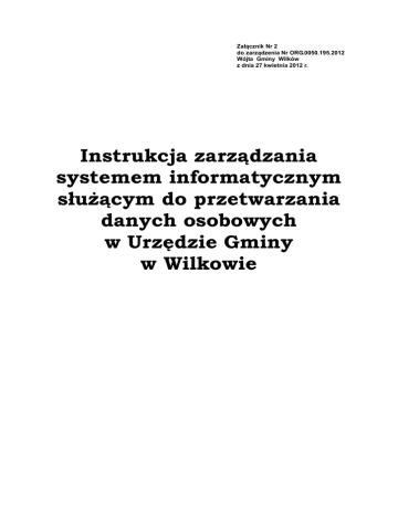 Załącznik Nr 2 do zarządzenia Nr ORG.0050.195.2012 Wójta Gminy Wilków z dnia 27 kwietnia 2012 r. Instrukcja zarządzania systemem informatycznym służącym do przetwarzania danych osobowych w Urzędzie Gminy w Wilkowie Wprowadzenie. Niniejszy dokument opisuje reguły dotyczące bezpieczeństwa danych osobowych zawartych w systemach informatycznych w Urzędzie Gminy w Wilkowie. Opisane reguły określają granice dopuszczalnego zachowania wszystkich użytkowników systemów informatycznych wspomagających pracę Urzędu oraz sposoby nadawania uprawnień użytkownikom, określa sposób pracy w systemie informatycznym, procedury zarządzania oraz czynności mające wpływ na zapewnienie bezpieczeństwa systemu informatycznego. Odpowiednie zabezpieczenia, ochrona przetwarzanych danych oraz niezawodność funkcjonowania są podstawowymi wymogami stawianymi współczesnym systemom informatycznym. Definicje. Ilekroć w niniejszym dokumencie jest mowa o: Administratorze Danych Osobowych – zadania administratora w Urzędzie Gminy w Wilkowie wykonuje Wójt Gminy Wilków. Administratorze Bezpieczeństwa Informacji - osoba wyznaczona przez administratora danych osobowych, odpowiedzialna za bezpieczeństwo danych osobowych przetwarzanych we wskazanych systemach informatycznych. Administratorze Bezpieczeństwa Systemu Informatycznego – osoba odpowiedzialna za sprawność, konserwację oraz wdrażanie technicznych zabezpieczeń systemu do przetwarzania danych osobowych (może to być administrator sieci lokalnej, systemu operacyjnego, bazy danych itp.) Systemie informatycznym – zespół współpracujących ze sobą urządzeń, programów, procedur przetwarzania informacji i narzędzi programowych zastosowanych w celu przetwarzania danych; Bezpieczeństwie systemu informatycznego – wdrożenie środków organizacyjnych i technicznych w celu zabezpieczenia oraz ochrony danych przed dostępem, modyfikacją, ujawnieniem, pozyskaniem lub zniszczeniem. Przetwarzaniu danych osobowych – wykonywanie jakichkolwiek operacji na danych osobowych, takich jak zbieranie, utrwalanie, przechowywanie, opracowywanie, zmienianie, udostępnianie i ich usuwanie a zwłaszcza operacji wykonywanych w systemach informatycznych. Osobie upoważnionej – osoba posiadająca upoważnienie wydane przez administratora danych osobowych i dopuszczona jako użytkownik do przetwarzania danych osobowych w systemie informatycznym danej komórki organizacyjnej w zakresie wskazanym w upoważnieniu; Użytkowniku systemu – osoba posiadająca uprawnienia do przetwarzania danych osobowych w systemie informatycznym; Sieci Internet – należy przez to rozumieć publiczną sieć telekomunikacyjną w rozumieniu ustawy - Prawo telekomunikacyjne Procedury nadawania i zmiany uprawnień do przetwarzania danych i rejestrowania tych uprawnień w systemie informatycznym oraz wskazanie osoby odpowiedzialnej za te czynności. 1. Każdy użytkownik systemu przed przystąpieniem do przetwarzania danych osobowych jest z obowiązany zapoznać się z: ustawą z dnia 29 sierpnia 1997 r. o ochronie danych osobowych (Dz.U. z 2002 r. Nr 101, poz. 926 z późn.zm.), rozporządzeniem Ministra Spraw Wewnętrznych i Administracji z dnia 29 kwietnia 2004r. w sprawie dokumentacji przetwarzania danych osobowych oraz warunków technicznych i organizacyjnych, jakim powinny odpowiadać urządzenia i systemy informatyczne służące do przetwarzania danych osobowych (Dz.U. Nr 100, poz. 1024), polityką bezpieczeństwa przetwarzania danych osobowych w Urzędzie Gminy w Wilkowie, niniejszym dokumentem. 2. Zapoznanie się z powyższymi regulacjami pracownik potwierdza własnoręcznym podpisem na oświadczeniu, którego wzór stanowi załącznik Nr 1 do niniejszej instrukcji. 3. Administrator Bezpieczeństwa Systemu Informatycznego przyznaje uprawnienia w zakresie dostępu do systemu informatycznego na podstawie pisemnego wniosku określającego zakres uprawnień pracownika, którego wzór stanowi załącznik Nr 2 do instrukcji, 4. Przyznanie uprawnień w zakresie dostępu do systemu informatycznego polega na wprowadzeniu do systemu dla każdego użytkownika unikalnego identyfikatora, hasła oraz zakresu dostępnych danych i operacji; 5. Pracownik ma prawo do wykonywania tylko tych czynności, do których został upoważniony. 6. Pracownik ponosi odpowiedzialność za wszystkie operacje wykonane przy użyciu jego identyfikatora i hasła dostępu; 7. W systemie informatycznym stosuje się uwierzytelnianie dwustopniowe na poziomie dostępu do systemu operacyjnego i sieci lokalnej oraz dostępu do aplikacji; 8. Odebranie uprawnień pracownikowi następuje na pisemny wniosek administratora danych z podaniem daty oraz przyczyny odebrania uprawnień; 9. Administrator danych zobowiązany jest pisemnie informować Administratora Bezpieczeństwa Informacji o każdej zmianie dotyczącej pracowników mającej wpływ na zakres posiadanych uprawnień w systemie informatycznym; 10. Identyfikator osoby, która utraciła uprawnienia do dostępu do danych osobowych należy niezwłocznie zablokować w systemie informatycznym oraz unieważnić hasło; 11. Administrator Bezpieczeństwa Systemu Informatycznego zobowiązany jest do prowadzenia i ochrony rejestru użytkowników i ich uprawnień w systemie informatycznym, którego wzór stanowi załącznik Nr 3 do instrukcji. Stosowane metody i środki uwierzytelnienia oraz procedury związane z ich zarządzaniem i użytkowaniem. 1. Dostęp do danych osobowych przetwarzanych w systemie informatycznym może mieć miejsce wyłącznie po podaniu identyfikatora i właściwego hasła. 2. Identyfikator jest w sposób jednoznaczny przypisany użytkownikowi. Użytkownik odpowiedzialny jest za wszystkie czynności wykonane przy użyciu identyfikatora, którym posługuje się lub posługiwał: identyfikator składa się minimalnie z 8 znaków. Znaki identyfikatora nie są rozdzielone spacjami ani znakami interpunkcyjnymi, nie zawiera polskich liter