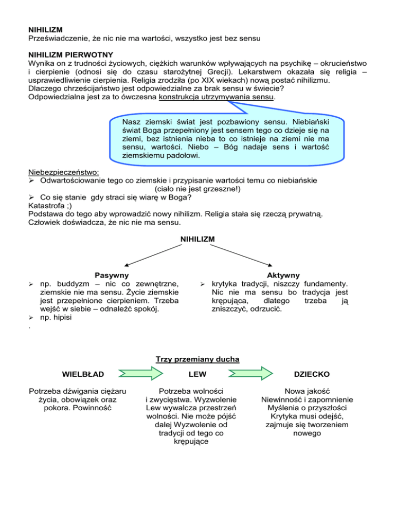 NIHILIZM Przeświadczenie, Ŝe nic nie ma wartości, wszystko jest bez sensu NIHILIZM PIERWOTNY Wynika on z trudności Ŝyciowych, cięŜkich warunków wpływających na psychikę – okrucieństwo i cierpienie (odnosi się do czasu staroŜytnej Grecji). Lekarstwem okazała się religia – usprawiedliwienie cierpienia. Religia zrodziła (po XIX wiekach) nową postać nihilizmu. Dlaczego chrześcijaństwo jest odpowiedzialne za brak sensu w świecie? Odpowiedzialna jest za to ówczesna konstrukcja utrzymywania sensu. Nasz ziemski świat jest pozbawiony sensu. Niebiański świat Boga przepełniony jest sensem tego co dzieje się na ziemi, bez istnienia nieba to co istnieje na ziemi nie ma sensu, wartości. Niebo – Bóg nadaje sens i wartość ziemskiemu padołowi. Niebezpieczeństwo: Odwartościowanie tego co ziemskie i przypisanie wartości temu co niebiańskie (ciało nie jest grzeszne!) Co się stanie gdy straci się wiarę w Boga? Katastrofa ;) Podstawa do tego aby wprowadzić nowy nihilizm. Religia stała się rzeczą prywatną. Człowiek doświadcza, Ŝe nic nie ma sensu. NIHILIZM Pasywny np. buddyzm – nic co zewnętrzne, ziemskie nie ma sensu. śycie ziemskie jest przepełnione cierpieniem. Trzeba wejść w siebie – odnaleźć spokój. np. hipisi . Aktywny krytyka tradycji, niszczy fundamenty. Nic nie ma sensu bo tradycja jest krępująca, dlatego trzeba ją zniszczyć, odrzucić. Trzy przemiany ducha WIELBŁAD Potrzeba dźwigania cięŜaru Ŝycia, obowiązek oraz pokora. Powinność LEW Potrzeba wolności i zwycięstwa. Wyzwolenie Lew wywalcza przestrzeń wolności. Nie moŜe pójść dalej Wyzwolenie od tradycji od tego co krępujące DZIECKO Nowa jakość Niewinność i zapomnienie Myślenia o przyszłości Krytyka musi odejść, zajmuje się tworzeniem nowego F. Nietzsche Kwestionuje zarówno racjonalizm i irracjonalizm (krytyka filozofii i chrześcijaństwa). Radykalna krytyka, z której wynika, Ŝe musi istnieć coś jeszcze – 3 element oprócz rozumu i wiary. Nietzsche wykorzystuje styl pisania ewangelii (biblijny) do przekazania wiedzy – nauki. Nietzsche twierdzi, Ŝe posiadł całą mądrość. Jest nauczyciele – głosi naukę (jak Jezus). Religia stała się sprawą osobistą. Ludzi sami „zabili” Boga tracąc wiarę. „Zaklinam was bracia moi, dochowajcie wierności ziemi i nie dawajcie wiary tym, którzy mówią wam o nieziemskich nadziejach! Truciciele to są, czy wiedzą o tym, czy nie.” Nietzsche wskazuje na trzeci element oprócz rozumu i wiary – śYCIE / WOLA Nietzsche szuka swoich korzeni. Odnajduje je w polskiej szlachcie – Nicki. Zaczyna myśleć o sobie jak o Polaku z krwi i kości ;) W kulturze szlachty polskiej szuka powiązań z arystokracją grecką. Powraca on do koncepcji szlachetności. „Człowiek jest liną, zawieszoną miedzy zwierzęciem a nadczłowiekiem – liną ponad przepaścią.” człowiek zwierze humanizm kultura filozofia (racjonalizm) nadczłowiek religia (irracjonalizm) trzeba zaprzeczyć tym wartościom! Istnieje niebezpieczeństwo, Ŝe zamiast w kierunku do nadczłowieka skierujemy się w kierunku zwierzęcia – barbarzyństwa. Następuje odrzucenie humanizmu. Zostało zasiane ziarno zwątpienia. Zburzyło ono sens. W XX wieku następuje próba odbudowy sensu. Co się stało z etyką i moralnością? Nietzsche dokonał radykalnej krytyki chrześcijaństwa i racjonalizmu. Pozostaje wola, która ma się rozwijać w atmosferze szlachetności.