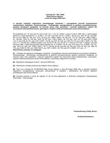 Uchwała Nr / 190 / 2009 Rady Gminy Kętrzyn z dnia 25 lutego 2009 roku w sprawie ustalenia regulaminu określającego wysokość i szczegółowe warunki przyznawania nauczycielom dodatków :motywacyjnego , funkcyjnego, wynagrodzenia za godziny ponadwymiarowe, godziny doraźnych zastępstw, za warunki pracy oraz wysokość i warunki wypłacania nagród dla nauczycieli szkół podstawowych, gimnazjum, zespołu szkół prowadzonych przez Gminę Kętrzyn. Na podstawie art. 18 ust.2 pkt.15 oraz art.40 ust.1 i art. 42 ustawy z dnia 8 marca 1990 roku o samorządzie gminnym ( tekst jednolity Dz. U. Z 2001 r. Nr 142, poz.1591 ze zm. z 2002 r. Nr.23, poz. 220, Nr. 62, poz.558, Nr.113, poz. 984, Nr. 153, poz. 1271, Nr.214, poz. 1806 z 2003 r. Nr. 80, poz. 717, Nr. 162, poz. 1568 z 2004 r. Nr. 102 poz. 1055, Nr 116, poz. 1203, Nr.167, poz. 1759 z 2005 r. Nr 172, poz. 1441, Nr 175, poz.1457 z 2006 r.Nr 17, poz.128, Nr 181, poz.1337 z 2007 r. Nr 48, poz.327, Nr.138, poz. 974, Nr 173, poz.1281 z 2008 r. Nr 180, poz.1111 , Nr 223 poz. 1458)w związku z art. 30 ust. 6 i 6a i art. 54 ust. 3 i 7 oraz art. 91 d pkt. 1 ustawy z dnia 26 stycznia 1982 r. Karta Nauczyciela ( tekst jednolity Dz. U. Z 2006 r. Nr 97, poz. 674 wraz z zm. Z 2006 r. Nr 170, poz. 1218, Nr. 220, poz. 1600 z 2007 r. Nr 17, poz.95, Nr 80, poz.542, Nr 158, poz.1103, Nr 102, poz. 689, Nr 176, poz.1238, Nr 191, poz.1369, Nr247, poz.1821 z 2008 r. Nr 145, poz.917 z 2009 r. Nr 1 poz. 1) Rada Gminy uchwala, co następuje: §1. Uchwala się regulamin określający wysokość i szczegółowe warunki przyznawania nauczycielom dodatków: motywacyjnego , funkcyjnego, wynagrodzenia za godziny ponadwymiarowe, godziny doraźnych zastępstw, za warunki pracy oraz wysokość i warunki wypłacania nagród dla nauczycieli szkół podstawowych, gimnazjum, zespołu szkół prowadzonych przez Gminę Kętrzyn, stanowiący załącznik do uchwały. §2. Regulamin obowiązuje od dnia 1 stycznia 2009 roku. §3. Wykonanie uchwały powierza się Wójtowi Gminy Kętrzyn. §4. Traci moc uchwała Nr XVI/85/2008 Rady Gminy Kętrzyn z dnia 06 lutego 2008 roku w sprawie ustalenia regulaminu wynagradzania nauczycieli zatrudnionych w szkołach i placówkach, dla których organem prowadzącym jest Gmina Kętrzyn. §5. Uchwała wchodzi w życie po upływie 14 dni od dnia ogłoszenia w Dzienniku Urzędowym Województwa Warmińsko – Mazurskiego . Przewodniczący Rady Gminy Andrzej Sienkiewicz REGULAMIN określający wysokość i szczegółowe warunki przyznawania nauczycielom dodatków :motywacyjnego , funkcyjnego, wynagrodzenia za godziny ponadwymiarowe, godziny doraźnych zastępstw, za warunki pracy oraz wysokość i warunki wypłacania nagród dla nauczycieli szkół podstawowych, gimnazjum, zespołu szkół prowadzonych przez Gminę Kętrzyn. Rozdział I Postanowienia wstępne § 1. Regulamin wynagradzania i przyznawania dodatków nauczycielom zatrudnionym w placówkach oświatowych Gminy Kętrzyn, zwany dalej regulaminem, określa: 1) wysokość stawek dodatków: motywacyjnego, funkcyjnego i za warunki pracy oraz szczegółowe warunki przyznawania tych dodatków, 2) sposób obliczania wynagradzania za godziny ponadwymiarowe oraz godziny zastępstw doraźnych, 3) wysokość i warunki przyznawania nagród, 4) wysokość i warunki wypłacania innych świadczeń wynikających ze stosunku pracy. § 2. Ilekroć w regulaminie jest mowa o: 1) 2) 3) szkole- rozumieć należy przez to szkołę lub placówkę oświatową prowadzoną przez Gminę Kętrzyn pracodawcy- rozumie się przez to dyrektora szkoły, który jest pracodawcą dla nauczycieli zatrudnionych w kierowanej przez niego szkole lub Wójta Gminy, który jest pracodawcą dla dyrektorów gminnych szkół nauczycielu- rozumie się przez to nauczycieli zatrudnionych przez danego pracodawcę. § 3. 1. Regulamin dotyczy wszystkich nauczycieli zatrudnionych w szkołach prowadzonych przez Gminę Kętrzyn 2. Regulaminu nie stosuje się do pracowników nie będących nauczycielami. Rozdział II Dodatek motywacyjny § 4. 1. Podstawę obliczenia wysokości dodatku motywacyjnego stanowi wynagrodzenie zasadnicze nauczyciela, jako średnia za okres trzech ostatnich miesięcy. 2. Środki na dodatki motywacyjne dla nauczycieli stanowi 2 % kwoty przypadającej na wynagrodzenia zasadnicze nauczycieli. 3. Środki na dodatki motywacyjne dla dyrektorów szkół stanowią od 0% do 7% kwoty wynagrodzenia zasadniczego dyrektorów. 4. Dodatek motywacyjny dla nauczycieli nie może być wyższy niż 30 % jego wynagrodzenia zasadniczego. 5. Dodatek motywacyjny dla dyrektora nie może przekroczyć 50 % jego wynagrodzenia zasadniczego. 6. Dodatek motywacyjny przyznaje się na czas określony, nie krótszy niż 2 miesiące i nie dłuższy niż 6 miesięcy. 7. Prawo do dodatku motywacyjnego nabywa nauczyciel po przepracowaniu przynajmniej jednego roku szkolnego. 8. Nauczycielowi nie posiadającemu stopnia awansu zawodowego, w okresie stażu dodatek motywacyjny nie przysługuje. 9. Nauczycielowi przeniesionemu do pracy w innej szkole, zgodnie z art. 18 K.N., dodatek motywacyjny ustala dyrektor szkoły, do której nauczyciel został przeniesiony, po zasięgnięciu opinii dyrektora szkoły poprzedniej. 10. Nauczycielowi dodatek motywacyjny przyznaje dyrektor szkoły, a dyrektorowi szkoły dodatek motywacyjny przyznaje Wójt Gminy. 11. Dodatek motywacyjny wypłaca się w terminie wypłaty wynagrodzenia, z góry. § 5 Warunkiem przyznania nauczycielowi dodatku motywacyjnego jest: 1.uzyskanie szczególnych osiągnięć dydaktycznych, wychowawczych i opiekuńczych, z uwzględnieniem zadań, związanych z zapewnieniem bezpieczeństwa uczniom w czasie zajęć organizowanych przez szkołę ,a w szczególności: a) uzyskiwanie przez uczniów, z uwzględnieniem ich możliwości oraz warunków pracy nauczyciela, dobrych osiągnięć dydaktyczno- wychowawczych, potwierdzonych wynikami klasyfikacji lub promocji, efektami egzaminów zewnętrznych, sprawdzianów alb
