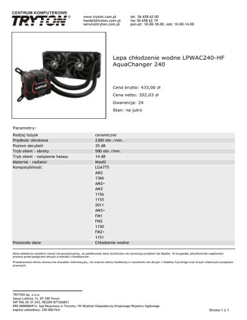 www.tryton.com.pl [email protected] [email protected] tel. 56 658 62 00 fax 56 658 62 19 pon-pt: 10.00-18.00, sob: 10.00-14.00 Lepa chłodzenie wodne LPWAC240-HF AquaChanger 240 Cena brutto: 433,00 zł Cena netto: 352,03 zł Gwarancja: 24 Stan: na jutro Parametry: Rodzaj łożysk Prędkość obrotowa Poziom decybeli Tryb silent - obroty Tryb silent - natężenie halasu Materiał - radiator Kompatybilność Pozostałe dane ceramiczne 2300 obr./min. 35 dB 500 obr./min. 14 dB Miedź LGA775 AM2 1366 AM2+ AM3 1156 1155 2011 AM3+ FM1 FM2 1150 FM2+ 1151 Chłodzenie wodne Mimo dołożenia wszelkich starań nie gwarantujemy, że publikowane dane techniczne nie zawierają uchybień lub błędów. W przypadku jakichkolwiek wątpliwości prosimy przed podjęciem decyzji o kontakt z handlowcem. Przedstawiona oferta cenowa ma charakter informacyjny, nie stanowi oferty handlowej w rozumieniu Art.66 par.1 Kodeksu Cywilnego oraz innych właściwych przepisów prawnych. TRYTON Sp. z o.o. Szosa Lubicka 13, 87-100 Toruń NIP 956-20-37-243, REGON 871526851 KRS 0000006913, Sąd Rejonowy w Toruniu, VII Wydział Gospodarczy Krajowego Rejestru Sądowego kapitał zakładowy: 250 000 PLN Strona 1 z 1