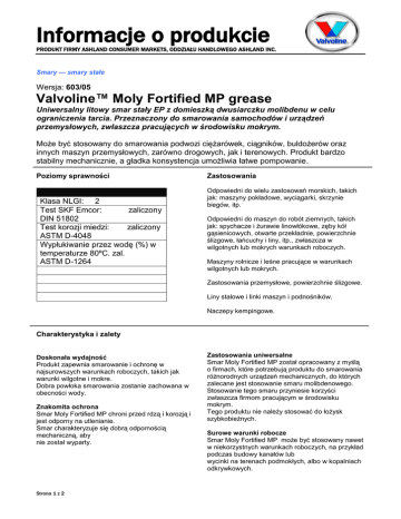 Informacje o produkcie PRODUKT FIRMY ASHLAND CONSUMER MARKETS, ODDZIAŁU HANDLOWEGO ASHLAND INC. Smary — smary stałe Wersja: 603/05 Valvoline™ Moly Fortified MP grease Uniwersalny litowy smar stały EP z domieszką dwusiarczku molibdenu w celu ograniczenia tarcia. Przeznaczony do smarowania samochodów i urządzeń przemysłowych, zwłaszcza pracujących w środowisku mokrym. Może być stosowany do smarowania podwozi ciężarówek, ciągników, buldożerów oraz innych maszyn przemysłowych, zarówno drogowych, jak i terenowych. Produkt bardzo stabilny mechanicznie, a gładka konsystencja umożliwia łatwe pompowanie. Poziomy sprawności Klasa NLGI: 2 Test SKF Emcor: zaliczony DIN 51802 Test korozji miedzi: zaliczony ASTM D-4048 Wypłukiwanie przez wodę (%) w temperaturze 80ºC. zal. ASTM D-1264 Zastosowania Odpowiedni do wielu zastosowań morskich, takich jak: maszyny pokładowe, wyciągarki, skrzynie biegów, itp. Odpowiedni do maszyn do robót ziemnych, takich jak: spychacze i żurawie linowłókowe, zęby kół gąsienicowych, otwarte przekładnie, powierzchnie ślizgowe, łańcuchy i liny, itp., zwłaszcza w wilgotnych lub mokrych warunkach roboczych. Maszyny rolnicze i leśne pracujące w warunkach wilgotnych lub mokrych. Zastosowania przemysłowe, powierzchnie ślizgowe. Liny stalowe i linki maszyn i podnośników. Naczepy kempingowe. Charakterystyka i zalety Doskonała wydajność Produkt zapewnia smarowanie i ochronę w najsurowszych warunkach roboczych, takich jak warunki wilgotne i mokre. Dobra powłoka smarowania zostanie zachowana w obecności wody. Znakomita ochrona Smar Moly Fortified MP chroni przed rdzą i korozją i jest odporny na utlenianie. Smar charakteryzuje się dobrą odpornością mechaniczną, aby nie został wyparty. Strona 1 z 2 Zastosowania uniwersalne Smar Moly Fortified MP został opracowany z myślą o firmach, które potrzebują produktu do smarowania różnorodnych urządzeń mechanicznych, do których zalecane jest stosowanie smaru molibdenowego. Stosowanie tego smaru przyniesie korzyści zwłaszcza firmom pracującym w środowisku mokrym. Tego produktu nie należy stosować do łożysk szybkobieżnych. Surowe warunki robocze Smar Moly Fortified MP może być stosowany nawet w niekorzystnych warunkach roboczych, na przykład podczas budowy kanałów lub wycinki na terenach podmokłych, albo w kopalniach odkrywkowych. Informacje o produkcie PRODUKT FIRMY ASHLAND CONSUMER MARKETS, ODDZIAŁU HANDLOWEGO ASHLAND INC. Bezpieczeństwo People Who Know, Use Valvoline™ Niniejszy produkt prawdopodobnie nie stwarza znaczącego zagrożenia dla zdrowia lub bezpieczeństwa, o ile jest używany prawidłowo w odpowiednim zastosowaniu. Kartę charakterystyki (MSDS) można uzyskać na życzenie od lokalnego dystrybutora lub pobrać ją z witryny pod adresem http://msds.ashland.com Działając w ponad 100 krajach na całym świecie, firma Valvoline to wiodący sprzedawca, dystrybutor i producent wysokiej jakości produktów i usług samochodowych i przemysłowych. Do produktów tej firmy należą smary samochodowe, m. in. MaxLife™ — pierwszy olej silnikowy o formule przeznaczonej specjalnie do pojazdów o wyższym przebiegu; płyny przekładniowe, oleje przekładniowe, smary hydrauliczne, chemikalia motoryzacyjne, produkty specjalne; smary oraz produkty do układu chłodzenia. Ochrona środowiska Zużyty olej i smar należy oddawać do odpowiedniego punktu zbiórki. Nie spuszczać do ścieków, gleby lub cieków wodnych. Aby uzyskać więcej informacji na temat produktów i usług firmy Valvoline, odwiedź www.valvolineeurope.com Charakterystyczne właściwości Charakterystyka typowych właściwości jest oparta na aktualnie produkowanym preparacie. W przyszłości produkcja będzie zgodna ze specyfikacjami Valvoline™, natomiast mogą wystąpić zmiany tej charakterystyki. Autor: AdG Zastępuje - 603/04 Smar Moly Fortified MP Klasa NLGI Mydlany Penetracja po ugniataniu, 25ºC. ASTM D-217 2 Lepkość oleju, mm /s w temperaturze 40ºC. ASTM D-445 2 Lepkość oleju, mm /s w temperaturze 100ºC. ASTM D-445 Temperatura kroplenia ºC ASTM D-566 Temperatura nanoszenia ºC. Kolor Konsystencja Ciężar właściwy w temperaturze 15.6°C. 2 Litowy 265-295 152 14.1 195 -15 do + 120 Szary/czarny Gładka 0.950 Niniejsze informacje dotyczą wyłącznie produktów wytwarzanych w następujących lokalizacjach: Europa *Znak towarowy będący własnością osoby trzeciej ™ Znak towarowy Ashland lub przedsiębiorstw zależnych, zarejestrowany w różnych krajach © 2011, Ashland Uważa się, że wszelkie informacje oraz dane przedstawione w niniejszym dokumencie są dokładne i wiarygodne, ale nie mogą być traktowane jako gwarancja, gwarancja wyraźna lub dorozumiana, gwarancja przydatności handlowej lub przydatności do określonego celu, lub reprezentacja, wyraźna lub dorozumiana, za którą Ashland Inc. i jej spółki zależne ponoszą odpowiedzialność prawną. Strona 2 z 2