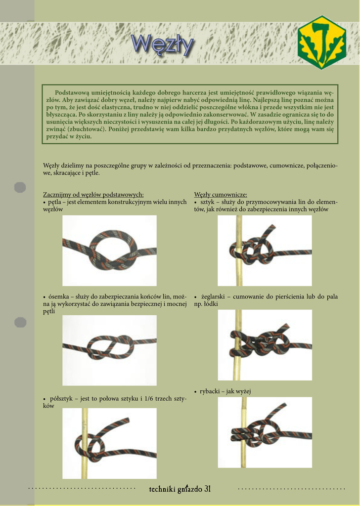 Węzły Podstawową umiejętnością każdego dobrego harcerza jest umiejętność prawidłowego wiązania węzłów. Aby zawiązać dobry węzeł, należy najpierw nabyć odpowiednią linę. Najlepszą linę poznać można po tym, że jest dość elastyczna, trudno w niej oddzielić poszczególne włókna i przede wszystkim nie jest błyszcząca. Po skorzystaniu z liny należy ją odpowiednio zakonserwować. W zasadzie ogranicza się to do usunięcia większych nieczystości i wysuszenia na całej jej długości. Po każdorazowym użyciu, linę należy zwinąć (zbuchtować). Poniżej przedstawię wam kilka bardzo przydatnych węzłów, które mogą wam się przydać w życiu. Węzły dzielimy na poszczególne grupy w zależności od przeznaczenia: podstawowe, cumownicze, połączeniowe, skracające i pętle. Zacznijmy od węzłów podstawowych: • pętla – jest elementem konstrukcyjnym wielu innych węzłów Węzły cumownicze: • sztyk – służy do przymocowywania lin do elementów, jak również do zabezpieczenia innych węzłów • ósemka – służy do zabezpieczania końców lin, można ją wykorzystać do zawiązania bezpiecznej i mocnej pętli • żeglarski – cumowanie do pierścienia lub do pala np. łódki • półsztyk – jest to połowa sztyku i 1/6 trzech sztyków • • • • • • • • • • • • • • • • • • • • • • • • • • • • • • • • rybacki – jak wyżej techniki gniazdo 31 • • • • • • • • • • • • • • • • • • • • • • • • • • • • • • • Węzły połączeniowe: • płaski – służy do łączenia dwóch lin o zbliżonych średnicach, uwaga nie mylić z babskim • szotowy i bramszotowy – tymi węzłami połączymy dwie niezbyt obciążone liny o podobnej grubości • zderzakowy – służy do mocnego połączenia lin o jednakowej średnicy, w miarę łatwy do rozwiązania. Węzły skracające: • łańcuszkowy – skracanie liny w wybranym miejscu, stosować raczej na linach cienkich lub średnich • beczułka – służy do skracania liny, jeden z końców musi być wolny Pętle: • kluczka i kluczka nie zaciskająca – wykorzystanie według inwencji własnej • ratowniczy – do wykorzystania jako węzeł uniwersalny np. jako pętla, jako węzeł ratowniczy na linie rzucanej ratowanemu itp. • wyblinka – możliwa do wiązania w powietrzu lub bezpośrednio na elemencie, wykorzystanie jest wszechstronne wg uznania • koci – wykorzystanie jak wyżej, z tym że na grubych i mało elastycznych linach Bartek Pytka wyw. – młody wędrownik z Lubelskiego Kręgu św. Pawła, uczeń 2. klasy XII LO w Lublinie. • • • • • • • • • • • • • • • • • • • • • • • • • • • • • • • techniki gniazdo 31 • • • • • • • • • • • • • • • • • • • • • • • • • • • • • • •