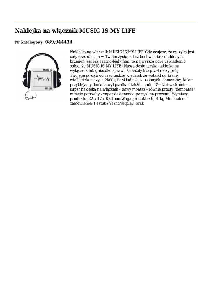 Naklejka na włącznik MUSIC IS MY LIFE Nr katalogowy: 089,044434 Naklejka na włącznik MUSIC IS MY LIFE Gdy czujesz, że muzyka jest cały czas obecna w Twoim życiu, a każda chwila bez ulubionych brzmień jest jak czarno-biały film, to najwyższa pora uświadomić sobie, że MUSIC IS MY LIFE! Nasza designerska naklejka na wyłącznik lub gniazdko sprawi, że każdy kto przekroczy próg Twojego pokoju od razu będzie wiedział, że wstąpił do krainy wielbiciela muzyki. Naklejka składa się z osobnych elementów, które przyklejamy dookoła wyłącznika i także na nim. Gadżet w skrócie: super naklejka na włącznik - łatwy montaż - równie prosty "demontaż" w razie potrzeby - super designerski pomysł na prezent Wymiary produktu: 22 x 17 x 0,01 cm Waga produktu: 0,01 kg Minimalne zamówienie: 1 sztuka Stand/display: brak