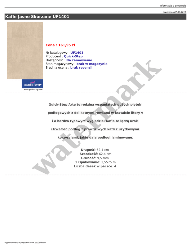 Informacje o produkcie Utworzono 07-03-2017 Kafle Jasne Skórzane UF1401 Cena : 161,95 zł er m ar k Nr katalogowy : UF1401 Producent : Quick-Step Dostępność : Na zamówienie Stan magazynowy : brak w magazynie Średnia ocena : brak recenzji Quick-Step Arte to rodzina wspaniałych dużych płytek podłogowych z delikatnymi rowkami w kształcie litery v i o bardzo typowym wyglądzie. Kafle te łączą urok i trwałość podłóg z prawdziwych kafli z użytkowymi w at korzyściami, jakie dają podłogi laminowane. Wygenerowano w programie www.oscGold.com Długość: 62,4 cm Szerokość: 62,4 cm Grubość: 9,5 mm 1 Opakowanie: 1,5575 m Liczba desek w paczce: 4