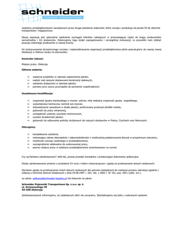 Jesteśmy przedsiębiorstwem zarzadzanym przez drugie pokolenie wlaścicieli, które rozwija i produkuje od ponad 50 lat zbiorniki transportowe i magazynowe. Naszą aspiracją jest optymalne spełnianie wymagań klientów należących w przeważającej części do kręgu producentów samochodów i ich dostawców. Dokonujemy tego dzięki zaangażowaniu i szczególnej motywacji, co pozwoliło nam zdobyć pozycję czołowego producenta w naszej branży. Do kontynuowania dynamicznego wzrostu i zoptymalizowania organizacji przedsiębiorstwa pilnie poszukujemy do naszej nowej lokalizacji w Złotoryi osoby na stanowisko: Kontroler Jakosci Miejsce pracy: Złotoryja Główne zadania: • • • • wsparcie projektów w zakresie zapewnienia jakości, nadzór nad naszymi dostawcami konstrukcji stalowych, szkolenie dostawców w zakresie jakości, pomiary przy użyciu przyrządów do pomiarów współrzędnych. Oczekiwane kwalifikacje: • • • • • • • znajomość języka niemieckiego w mowie i piśmie, mile widziana znajomość języka angielskiego, wykształcenie techniczne, technik lub inżynier, doświadczenie zawodowe w dziale jakości, preferowany przemysł obróbki metalu, gotowość do pracy zmianowej, umiejętność czytania rysunków technicznych, wysoka świadomość jakości, gotowość do odbywania podróży służbowych do naszych dostawców w Polsce, Czechach oraz Niemczech. Oferujemy: • • • • • kompleksowe szkolenie, interesujący zakres obowiązków i odpowiedzialności z możliwością podejmowania decyzji w przyjemnym otoczeniu, możliwość rozwoju osobistego w przedsiębiorstwie, wynagrodzenie adekwatne do wykonywanej pracy, pewne miejsce pracy w solidnym przedsiębiorstwie zorientowanym na wzrost. Czy są Państwo zainteresowani? Jeśli tak, proszę przesłać kompletne i przekonujące dokumenty aplikacyjne. Osoby zainteresowane prosimy o przesłanie CV wraz z listem motywacyjnym i zgodą na przetwarzanie danych osobowych: Wyrażam zgodę na przetwarzanie moich danych osobowych dla potrzeb niezbędnych do realizacji procesu rekrutacji zgodnie z Ustawą o Ochronie Danych Osobowych z dnia 29.08.1997 r. (Dz. Ust. z 2002 r. Nr 101, poz. 926 z późn. zm.). na adres: [email protected] lub listownie na adres: Schneider Pojemniki Transportowe Sp. z o.o. sp. k ul. Krzywoustego 39 59-500 Złotoryja Zainteresowanych informujemy, że nadesłanych ofert nie zwracamy. Skontaktujemy się tylko z wybranymi osobami.
