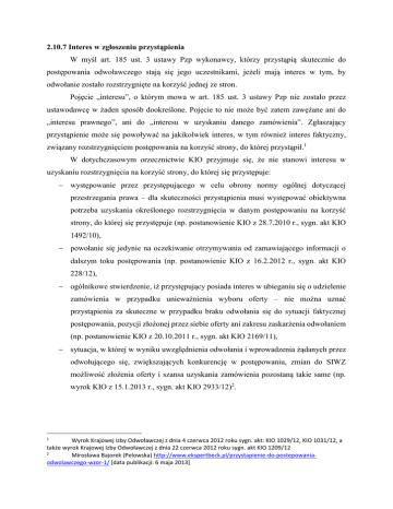 2.10.7 Interes w zgłoszeniu przystąpienia W myśl art. 185 ust. 3 ustawy Pzp wykonawcy, którzy przystąpią skutecznie do postępowania odwoławczego stają się jego uczestnikami, jeżeli mają interes w tym, by odwołanie zostało rozstrzygnięte na korzyść jednej ze stron. Pojęcie „interesu”, o którym mowa w art. 185 ust. 3 ustawy Pzp nie zostało przez ustawodawcę w żaden sposób dookreślone. Pojęcie to nie może być zatem zawężane ani do „interesu prawnego”, ani do „interesu w uzyskaniu danego zamówienia”. Zgłaszający przystąpienie może się powoływać na jakikolwiek interes, w tym również interes faktyczny, związany rozstrzygnięciem postępowania na korzyść strony, do której przystąpił.1 W dotychczasowym orzecznictwie KIO przyjmuje się, że nie stanowi interesu w uzyskaniu rozstrzygnięcia na korzyść strony, do której się przystępuje: występowanie przez przystępującego w celu obrony normy ogólnej dotyczącej przestrzegania prawa – dla skuteczności przystąpienia musi występować obiektywna potrzeba uzyskania określonego rozstrzygnięcia w danym postępowaniu na korzyść strony, do której się przystępuje (np. postanowienie KIO z 28.7.2010 r., sygn. akt KIO 1492/10), powołanie się jedynie na oczekiwanie otrzymywania od zamawiającego informacji o dalszym toku postępowania (np. postanowienie KIO z 16.2.2012 r., sygn. akt KIO 228/12), ogólnikowe stwierdzenie, iż przystępujący posiada interes w ubieganiu się o udzielenie zamówienia w przypadku unieważnienia wyboru oferty – nie można uznać przystąpienia za skuteczne w przypadku braku odwołania się do sytuacji faktycznej postępowania, pozycji złożonej przez siebie oferty ani zakresu zaskarżenia odwołaniem (np. postanowienie KIO z 20.10.2011 r., sygn. akt KIO 2169/11), sytuacja, w której w wyniku uwzględnienia odwołania i wprowadzenia żądanych przez odwołującego się, zwiększających konkurencję w postępowaniu, zmian do SIWZ możliwość złożenia oferty i szansa uzyskania zamówienia pozostaną takie same (np. wyrok KIO z 15.1.2013 r., sygn. akt KIO 2933/12)2. 1 Wyrok Krajowej Izby Odwoławczej z dnia 4 czerwca 2012 roku sygn. akt: KIO 1029/12, KIO 1031/12, a także wyrok Krajowej Izby Odwoławczej z dnia 22 czerwca 2012 roku sygn. akt KIO 1209/12 2 Mirosława Bajorek (Pelowska) http://www.ekspertbeck.pl/przystapienie-do-postepowaniaodwolawczego-wzor-1/ [data publikacji: 6 maja 2013] Orzeczenie: Wskazać należy, żeby przystępujący uzyskał status uczestnika postępowania odwoławczego, musi mieć interes w rozstrzygnięciu odwołania na korzyść jednej ze stron. Ustawa nie wymaga jednak, aby był to wyłącznie interes prawny. Uznać należy za wystarczający interes faktyczny, musi on jednak pozostawać w adekwatnym związku z odwołaniem strony, do której interwenient przystępuje. Zdaniem Sądu Okręgowego, w niniejszej sprawie nie sposób uznać, żeby przystępujący miał interes w rozstrzygnięciu sprawy zgodnie z wnioskiem odwołującego. Za takim stanowiskiem przemawia fakt, że przystąpienie wykonawcy do niniejszego postępowania i podejmowane przez niego w toku postępowania czynności, w szczególności składanie oświadczeń podważających prawidłowość sporządzenia własnej oferty skutkowało występowaniem przez tego wykonawcę w postępowaniu odwoławczym przeciwko własnej ofercie. Zaakcentować należy, że interes, o którym mowa w art. 185 nie może być rozumiany jako możliwość występowania przeciwko własnej ofercie, tak jak to miało miejsce w przedmiotowym postępowaniu (wyrok Sądu Okręgowego w Poznaniu z dnia 8 stycznia 2014 roku, sygn. akt: X Ga 652/13). Przystąpienie do postępowania odwoławczego może być zgłoszone przez wykonawcę jedynie w zakresie zarzutów odwołania. Jeżeli wykonawca chciałby podnieść inne zarzuty, nie ujęte w odwołaniu, musi złożyć samodzielnie osobne odwołanie i uiścić od niego wpis. Nie ma przeszkód, by powtórzyć w nim również zarzuty odwołania, do którego wykonawca zgłosił przystąpienie, ale też nie ma takiej potrzeby. Problemy w zgłoszeniu przystąpienia pojawiają się w sytuacji, gdy wykonawca ma interes w tym, by część zarzutów odwołania została rozstrzygnięta na korzyść odwołującego, a część na korzyść zamawiającego. Sytuacje takie zdarzają się często w postępowaniach odwoławczych i wynikają z tego, że odwołania w większości przypadków są wielozarzutowe i dotyczą różnych czynności zamawiającego. Przykłady: 1) zarzuty odwołania dotyczą zaniechania przez zamawiającego odrzucenia ofert dwóch innych wykonawców (A i B). Wykonawca A ma interes w tym, by została odrzucona oferta wykonawcy B, ale nie ma interesu w odrzuceniu własnej oferty. Stąd też zależy mu na oddaleniu zarzutów wobec jego oferty i uwzględnieniu zarzutów względem oferty wykonawcy B; 2) odwołanie złożone przez wykonawcę C dotyczy treści ogłoszenia o zamówieniu i specyfikacji istotnych warunków zamówienia w zakresie warunków udziału w postępowaniu. Wykonawca C nie spełnia dwóch warunków w zakresie doświadczenia i domaga się ich złagodzenia. Wykonawca D spełnia jeden z postawionych warunków, ale nie spełnia drugiego. Zależy mu zatem na utrzymaniu warunku, który spełnia i na zmianie drugiego. Ustawa Pzp nie dopuszcza możliwości zgłoszenia przystąpienia przez jednego wykonawcę jednocześnie po obu stronach sporu. Nie jest to możliwe nawet w sytuacji, gdy wykonawca zgłaszający przystąpienie precyzuje, że w zakresie jednego zarzutu przystępuje do postępowania po stronie odwołującego, a w zakresie drugiego – po stronie zamawiającego. Krajowa Izba Odwoławcza w wyroku z dnia 7 grudnia 2012 roku sygn. akt: KIO 2597/12 stwierdziła: „Przystąpienie jako czynność wywołująca skutki procesowe w postaci uzyskania statusu uczestnika postępowania odwoławczego wymaga ścisłego wypełnienia przesłanek us