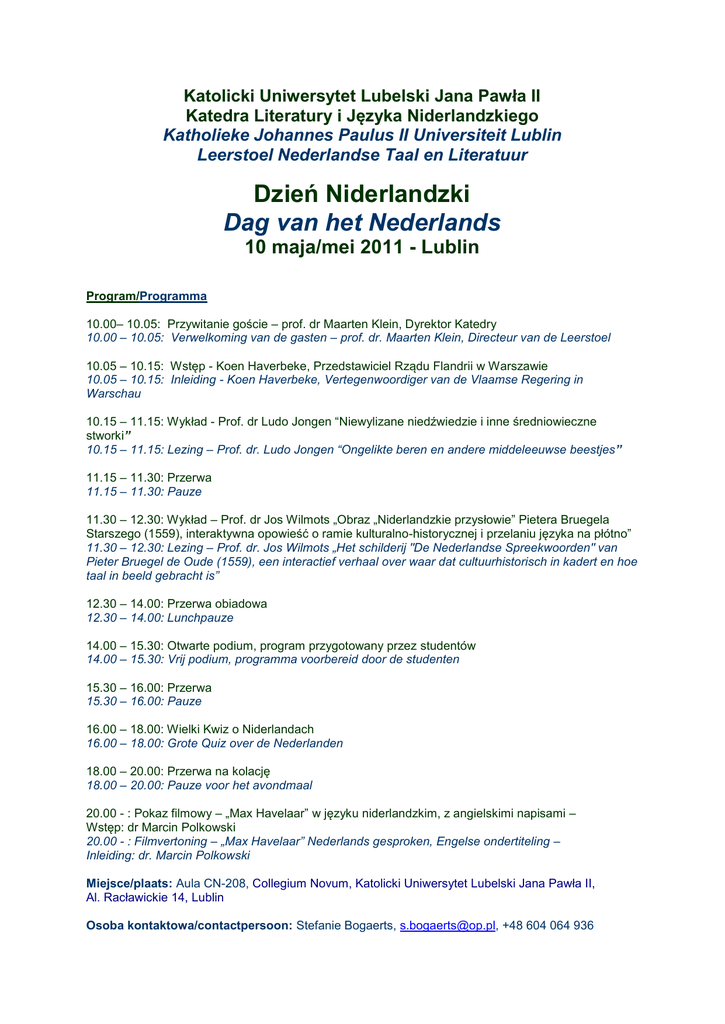 Katolicki Uniwersytet Lubelski Jana Pawła II Katedra Literatury i Języka Niderlandzkiego Katholieke Johannes Paulus II Universiteit Lublin Leerstoel Nederlandse Taal en Literatuur Dzień Niderlandzki Dag van het Nederlands 10 maja/mei 2011 - Lublin Program/Programma 10.00– 10.05: Przywitanie goście – prof. dr Maarten Klein, Dyrektor Katedry 10.00 – 10.05: Verwelkoming van de gasten – prof. dr. Maarten Klein, Directeur van de Leerstoel 10.05 – 10.15: Wstęp - Koen Haverbeke, Przedstawiciel Rządu Flandrii w Warszawie 10.05 – 10.15: Inleiding - Koen Haverbeke, Vertegenwoordiger van de Vlaamse Regering in Warschau 10.15 – 11.15: Wykład - Prof. dr Ludo Jongen “Niewylizane niedźwiedzie i inne średniowieczne stworki” 10.15 – 11.15: Lezing – Prof. dr. Ludo Jongen “Ongelikte beren en andere middeleeuwse beestjes” 11.15 – 11.30: Przerwa 11.15 – 11.30: Pauze 11.30 – 12.30: Wykład – Prof. dr Jos Wilmots „Obraz „Niderlandzkie przysłowie” Pietera Bruegela Starszego (1559), interaktywna opowieść o ramie kulturalno-historycznej i przelaniu języka na płótno” 11.30 – 12.30: Lezing – Prof. dr. Jos Wilmots „Het schilderij "De Nederlandse Spreekwoorden" van Pieter Bruegel de Oude (1559), een interactief verhaal over waar dat cultuurhistorisch in kadert en hoe taal in beeld gebracht is” 12.30 – 14.00: Przerwa obiadowa 12.30 – 14.00: Lunchpauze 14.00 – 15.30: Otwarte podium, program przygotowany przez studentów 14.00 – 15.30: Vrij podium, programma voorbereid door de studenten 15.30 – 16.00: Przerwa 15.30 – 16.00: Pauze 16.00 – 18.00: Wielki Kwiz o Niderlandach 16.00 – 18.00: Grote Quiz over de Nederlanden 18.00 – 20.00: Przerwa na kolację 18.00 – 20.00: Pauze voor het avondmaal 20.00 - : Pokaz filmowy – „Max Havelaar” w języku niderlandzkim, z angielskimi napisami – Wstęp: dr Marcin Polkowski 20.00 - : Filmvertoning – „Max Havelaar” Nederlands gesproken, Engelse ondertiteling – Inleiding: dr. Marcin Polkowski Miejsce/plaats: Aula CN-208, Collegium Novum, Katolicki Uniwersytet Lubelski Jana Pawła II, Al. Racławickie 14, Lublin Osoba kontaktowa/contactpersoon: Stefanie Bogaerts, [email protected], +48 604 064 936