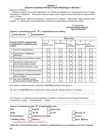 Ankieta II „Badanie satysfakcji klientów Urzędu Miejskiego w Bielawie.” Szanowni Państwo, Niniejsza ankieta ma na celu zapoznanie się z Państwa poglądami na temat jakości pracy Urzędu Miejskiego w Bielawie. Wszystkie Państwa odpowiedzi i sugestie przyczynią się do usprawnienia pracy Urzędu. Zapewniamy całkowitą poufność i anonimowość badania - odpowiedzi będą prezentowane jedynie w zbiorczych zestawieniach bez możliwości identyfikacji z konkretną osobą. Z poważaniem, Burmistrz Miasta Bielawy Ryszard Dźwiniel Prosimy o umieszczenie znaku „X” w odpowiednim polu ankiety. osoba fizyczna przedsiębiorca Skala oceny Czy jest Pan/Pani zadowolony/a z następujących aspektów pracy Urzędu: 1 warunki obsługi klientów 2 zapewnienie i dostępność informacji 3 kompetencje pracowników Urzędu 4 uprzejmość i chęć pomocy ze strony pracowników Urzędu 5 terminowość wykonania usługi 6 uzyskany wynik załatwianej sprawy 7 oznakowanie i łatwość poruszania się po Urzędzie 8 jak ocenia Pan/Pani ogólnie funkcjonowanie Urzędu Miasta? 1 2 Bardzo niezadowolony Niezadowolony 9.W jakim wydziale/referacie załatwiał/a 3 4 5 Trudno Zadowolony Bardzo powiedzieć zadowolony Pan/Pani dzisiaj swoje sprawy: …………………………….... 10. Jakie ma Pan/Pani inne oczekiwania wobec sposobu obsługi klienta w Urzędzie:…………………. …………………………………………………………………………………………………………………………….... …………………………………………………………………………………………………........................................ Prosimy o wskazanie dwóch najsłabszych punktów funkcjonowania Urzędu Miejskiego w Bielawie w relacji Przedsiębiorca - Urząd :................................................................................... *11. ............................................................................................................................................................................. ............................................................................................................................................................................. Prosimy o postawienie znaku „X” w odpowiednim polu: Płeć: Wiek: Wykształcenie: kobieta mężczyzna do 30 31-50 podstawowe/średnie Bielawa * Siedziba firmy: * - wypełniają tylko podmioty gospodarcze powyżej 51 wyższe poza Bielawą DZIĘKUJEMY ZA WYPEŁNIENIE ANKIETY I PROSIMY O DOSTARCZENIE JEJ DO 30 WRZEŚNIA 2010 R. DO UM BIELAWA INT