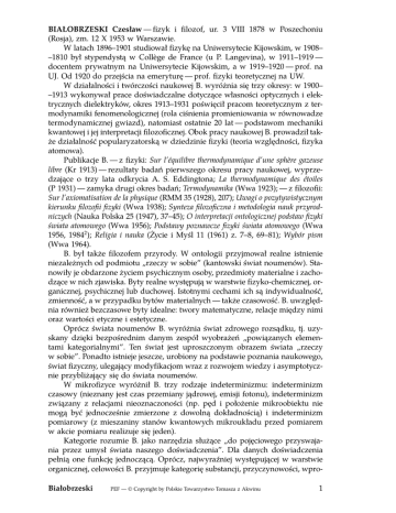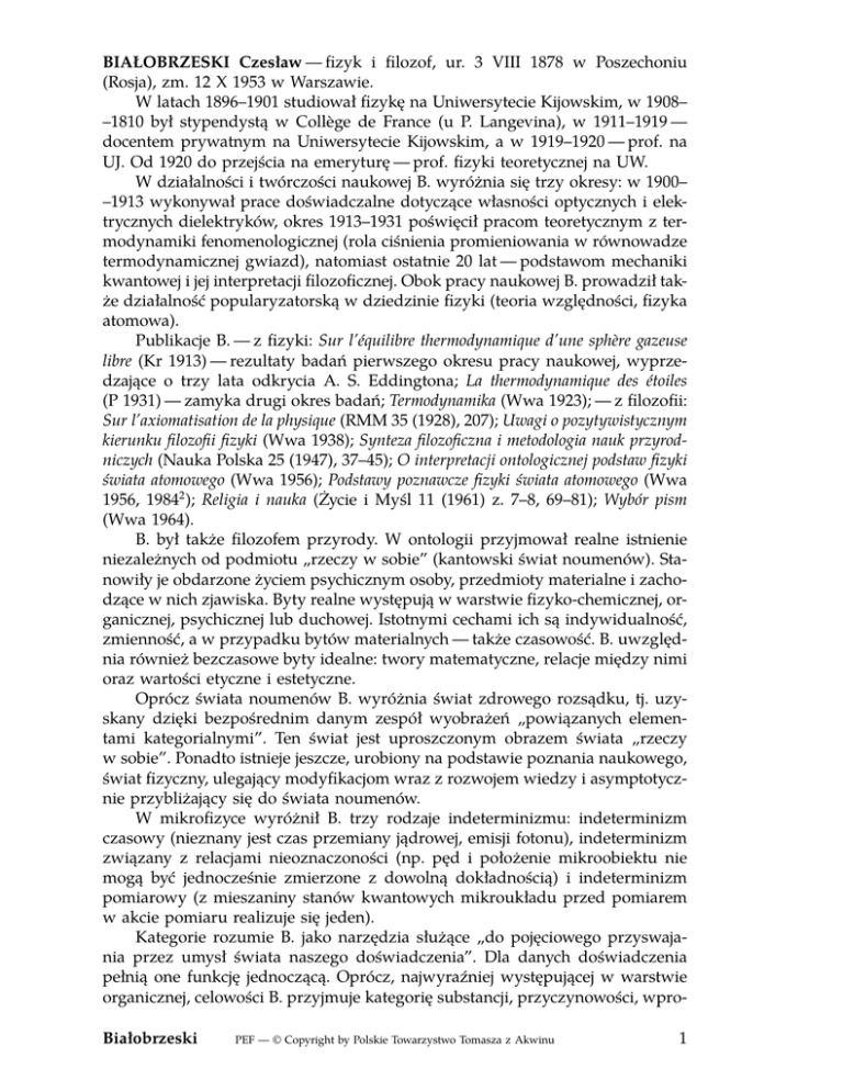 BIAŁOBRZESKI Czesław — fizyk i filozof, ur. 3 VIII 1878 w Poszechoniu (Rosja), zm. 12 X 1953 w Warszawie. W latach 1896–1901 studiował fizykę na Uniwersytecie Kijowskim, w 1908– –1810 był stypendystą w Collège de France (u P. Langevina), w 1911–1919 — docentem prywatnym na Uniwersytecie Kijowskim, a w 1919–1920 — prof. na UJ. Od 1920 do przejścia na emeryturę — prof. fizyki teoretycznej na UW. W działalności i twórczości naukowej B. wyróżnia się trzy okresy: w 1900– –1913 wykonywał prace doświadczalne dotyczące własności optycznych i elektrycznych dielektryków, okres 1913–1931 poświęcił pracom teoretycznym z termodynamiki fenomenologicznej (rola ciśnienia promieniowania w równowadze termodynamicznej gwiazd), natomiast ostatnie 20 lat — podstawom mechaniki kwantowej i jej interpretacji filozoficznej. Obok pracy naukowej B. prowadził także działalność popularyzatorską w dziedzinie fizyki (teoria względności, fizyka atomowa). Publikacje B. — z fizyki: Sur l’équilibre thermodynamique d’une sphère gazeuse libre (Kr 1913) — rezultaty badań pierwszego okresu pracy naukowej, wyprzedzające o trzy lata odkrycia A. S. Eddingtona; La thermodynamique des étoiles (P 1931) — zamyka drugi okres badań; Termodynamika (Wwa 1923); — z filozofii: Sur l’axiomatisation de la physique (RMM 35 (1928), 207); Uwagi o pozytywistycznym kierunku filozofii fizyki (Wwa 1938); Synteza filozoficzna i metodologia nauk przyrodniczych (Nauka Polska 25 (1947), 37–45); O interpretacji ontologicznej podstaw fizyki świata atomowego (Wwa 1956); Podstawy poznawcze fizyki świata atomowego (Wwa 1956, 19842 ); Religia i nauka (Życie i Myśl 11 (1961) z. 7–8, 69–81); Wybór pism (Wwa 1964). B. był także filozofem przyrody. W ontologii przyjmował realne istnienie niezależnych od podmiotu „rzeczy w sobie” (kantowski świat noumenów). Stanowiły je obdarzone życiem psychicznym osoby, przedmioty materialne i zachodzące w nich zjawiska. Byty realne występują w warstwie fizyko-chemicznej, organicznej, psychicznej lub duchowej. Istotnymi cechami ich są indywidualność, zmienność, a w przypadku bytów materialnych — także czasowość. B. uwzględnia również bezczasowe byty idealne: twory matematyczne, relacje między nimi oraz wartości etyczne i estetyczne. Oprócz świata noumenów B. wyróżnia świat zdrowego rozsądku, tj. uzyskany dzięki bezpośrednim danym zespół wyobrażeń „powiązanych elementami kategorialnymi”. Ten świat jest uproszczonym obrazem świata „rzeczy w sobie”. Ponadto istnieje jeszcze, urobiony na podstawie poznania naukowego, świat fizyczny, ulegający modyfikacjom wraz z rozwojem wiedzy i asymptotycznie przybliżający się do świata noumenów. W mikrofizyce wyróżnił B. trzy rodzaje indeterminizmu: indeterminizm czasowy (nieznany jest czas przemiany jądrowej, emisji fotonu), indeterminizm związany z relacjami nieoznaczoności (np. pęd i położenie mikroobiektu nie mogą być jednocześnie zmierzone z dowolną dokładnością) i indeterminizm pomiarowy (z mieszaniny stanów kwantowych mikroukładu przed pomiarem w akcie pomiaru realizuje się jeden). Kategorie rozumie B. jako narzędzia służące „do pojęciowego przyswajania przez umysł świata naszego doświadczenia”. Dla danych doświadczenia pełnią one funkcję jednoczącą. Oprócz, najwyraźniej występującej w warstwie organicznej, celowości B. przyjmuje kategorię substancji, przyczynowości, wproBiałobrzeski PEF — © Copyright by Polskie Towarzystwo Tomasza z Akwinu 1 wadzonej przez siebie ustrojowości oraz przestrzeń i czas. Kategoriom tym nie przysługuje cecha niezmienności i konieczności; z rozwojem nauki ich cechy mogą się zmieniać. Substancjalność w fizyce klasycznej przypisuje masie ciała, w mikrofizyce — cząstkom elementarnym. Cząstki elementarne posiadają ograniczoną samodzielność (elektrony w atomie, nukleony w nuklidzie) i niezmienność (anihilacja pozytonu i negatonu w fotony). Przyczynowość B. pojmuje fizykalnie jako relację między kolejnymi stanami procesu fizycznego. Wyróżnia przyczynowość deterministyczną (jednoznaczną), typową dla zjawisk w makroświecie, i przyczynowość indeterministyczną (wieloznaczną), występującą w mikroświecie. Przyczynowość deterministyczna jest jednoznaczną relacją między stanem obecnym i późniejszym układu, przyczynowość wieloznaczna jest relacją niejednoznaczną. Ustrojowość jest dążnością do tworzenia z elementów hierarchicznie uporządkowanych struktur złożonych: atomów z nuklidów, molekuł z atomów i jonów, galaktyk z gwiazd. Osnową ustrojowości jest potencjalność, rozumiana jako realnie istniejący czynnik, powodujący tworzenie z elementów struktur oraz oddziaływanie między elementami. Potencjalność ma charakter aktywny. W fizyce klasycznej uobecnia się ona dzięki siłom, w mikrofizyce — w falowym aspekcie materii, opisywanym funkcją falową. Istnieje mnogość hierarchicznie podporządkowanych potencjalności: np. potencjalność elektronów i nuklidów podporządkowana potencjalności atomu. Pojęcie potencjalności B. uogólnił na inne (zwł. ożywione) warstwy rzeczywistości. Ze względu na cechę aktywności porównuje potencjalność z formą substancjalną w rozumieniu arystotelesowsko-tomistycznym, ze względu na cechę „tworzenia wielkości” — w rozumieniu Dunsa Szkota. W teorii poznania B. dopuszcza poznanie za pomocą zmysłów i umysłu. Ze względu na brak odpowiednich władz zmysłowych (np. do badania fal radiowych lub ultradźwiękowych) poznanie zmysłowe ma ograniczony zakres stosowania. Uzyskane dzięki poznaniu zmysłowemu, umiejscowione w przestrzeni i w czasie wyobrażenia stanowią surowy materiał wiedzy przyrodniczej. Dzięki „twórczej pracy umysłu” materiał ten zostaje przetransformowany w zbiór pojęć i twierdzeń, stanowiących składniki wiedzy nau