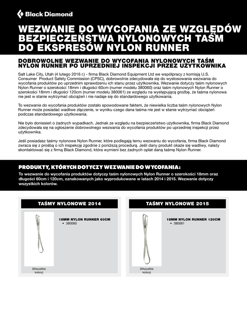 WEZWANIE DO WYCOFANIA ZE WZGLĘDÓW BEZPIECZEŃSTWA NYLONOWYCH TAŚM DO EKSPRESÓW NYLON RUNNER DOBROWOLNE WEZWANIE DO WYCOFANIA NYLONOWYCH TAŚM NYLON RUNNER PO UPRZEDNIEJ INSPEKCJI PRZEZ UŻYTKOWNIKA Salt Lake City, Utah (4 lutego 2016 r.) - firma Black Diamond Equipment Ltd we współpracy z komisją U.S. Consumer Product Safety Commission (CPSC), dobrowolnie zdecydowała się do wystosowania wezwania do wycofania produktów po uprzednim sprawdzeniu ich stanu przez użytkownika. Wezwanie dotyczy taśm nylonowych Nylon Runner o szerokości 18mm i długości 60cm (numer modelu 380060) oraz taśm nylonowych Nylon Runner o szerokości 18mm i długości 120cm (numer modelu 380061) ze względu na występującą groźbę, że taśma nylonowa nie jest w stanie wytrzymać obciążeń i nie nadaje się do standardowego użytkowania. To wezwanie do wycofania produktów zostało spowodowane faktem, że niewielka liczba taśm nylonowych Nylon Runner może posiadać wadliwe złączenie, w wyniku czego dana taśma nie jest w stanie wytrzymać obciążeń podczas standardowego użytkowania. Nie było doniesień o żadnych wypadkach. Jednak ze względu na bezpieczeństwo użytkownika, firma Black Diamond zdecydowała się na ogłoszenie dobrowolnego wezwania do wycofania produktów po uprzedniej inspekcji przez użytkownika. Jeśli posiadasz taśmy nylonowe Nylon Runner, które podlegają temu wezwaniu do wycofania, firma Black Diamond zwraca się z prośbą o ich inspekcję zgodnie z poniższą procedurą. Jeśli dany produkt okaże się wadliwy, należy skontaktować się z firmą Black Diamond, która wymieni bez żadnych opłat daną taśmę Nylon Runner. Produkty, których dotyczy wezwanie do wycofania: To wezwanie do wycofania produktów dotyczy taśm nylonowych Nylon Runner o szerokości 18mm oraz długości 60cm i 120cm, oznakowanych jako wyprodukowane w latach 2014 i 2015. Wezwanie dotyczy wszystkich kolorów. Taśmy nylonowe 2014 Taśmy nylonowe 2015 18MM NYLON RUNNER 60CM • 380060 (Wszystkie kolory) 18MM NYLON RUNNER 120CM • 380061 (Wszystkie kolory) IDENTYFIKACJA PRODUKTU: Taśmy nylonowe do ekspresów, spełniające następujące kryteria, podlegają wycofaniu: Wymiary: Szerokość 18mm i długość 60cm lub 120cm (długość jest mierzona gdy taśma leży na płaskiej powierzchni). KOLOR: Pełne kolory: czerwony, niebieski, złoty, zielony, szary oraz fioletowy. Oznaczenie CE CE0333, oznaczenie znajduje się na wszytej metce. KOD PRODUKCYJNY: 2014 r. lub 2015 r. - informacja znajduje się na wszytej metce. C M Y CM MY CY CMY K KOD PRODUKCYJNY Oznaczenie CE MM5845_M_Woven_Label_OUT.pdf 1 7/17/14 4:30 PM SPRAWDZENIE PRODUKTU: Jeśli twoja taśma nylonowa spełnia powyższe specyfikacje, należy sprawdzić pełną długość każdej taśmy w poszukiwaniu taśmy maskującej, podobnej do tej na poniższym zdjęciu: JEŚLI NIE WYSTĘPUJE TAŚMA MASKUJĄCA Jeśli występuje taśma maskująca: Nie zwracaj do firmy Black Diamond Zwróć do firmy Black Diamond OK Zwrot OK nie używać Questions? Please consult the Frequently Asked Questions section on our website (LINK) Procedura zwrotu: 1. Należy natychmiast wycofać z użytku nylonową taśmę do ekspresów Nylon Runner. 2. Aby wysłać zgłoszenie wycofania produktu. www.blackdiamondequipment.com/runnerrecall 3. Należy zapisać numer zgłoszenia. Przedstawiciel firmy Black Diamond skontaktuje się z wami w celu podania następujących informacji: Numer identyfikacyjny zwrotu produktu Adres zwrotny Etykieta wysyłki 4. Zwróć nylonową taśmę Nylon Runner do firmy Black Diamond. 5. Firma Black Diamond wyśle ci bez żadnych opłat zamiennik nylonowej taśmy Nylon Runner.
