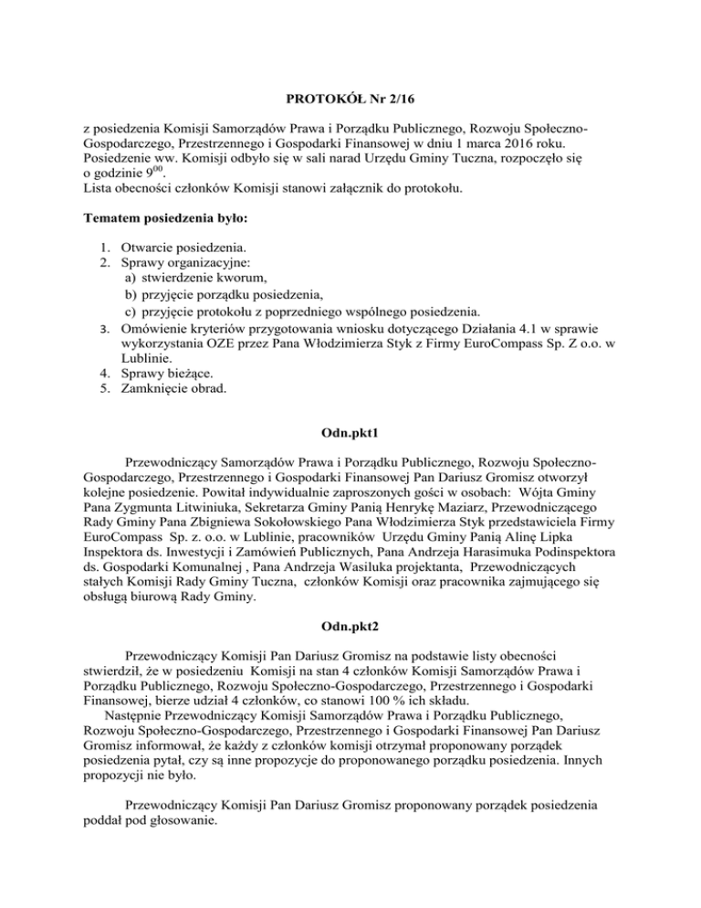 PROTOKÓŁ Nr 2/16 z posiedzenia Komisji Samorządów Prawa i Porządku Publicznego, Rozwoju SpołecznoGospodarczego, Przestrzennego i Gospodarki Finansowej w dniu 1 marca 2016 roku. Posiedzenie ww. Komisji odbyło się w sali narad Urzędu Gminy Tuczna, rozpoczęło się o godzinie 900. Lista obecności członków Komisji stanowi załącznik do protokołu. Tematem posiedzenia było: 1. Otwarcie posiedzenia. 2. Sprawy organizacyjne: a) stwierdzenie kworum, b) przyjęcie porządku posiedzenia, c) przyjęcie protokołu z poprzedniego wspólnego posiedzenia. 3. Omówienie kryteriów przygotowania wniosku dotyczącego Działania 4.1 w sprawie wykorzystania OZE przez Pana Włodzimierza Styk z Firmy EuroCompass Sp. Z o.o. w Lublinie. 4. Sprawy bieżące. 5. Zamknięcie obrad. Odn.pkt1 Przewodniczący Samorządów Prawa i Porządku Publicznego, Rozwoju SpołecznoGospodarczego, Przestrzennego i Gospodarki Finansowej Pan Dariusz Gromisz otworzył kolejne posiedzenie. Powitał indywidualnie zaproszonych gości w osobach: Wójta Gminy Pana Zygmunta Litwiniuka, Sekretarza Gminy Panią Henrykę Maziarz, Przewodniczącego Rady Gminy Pana Zbigniewa Sokołowskiego Pana Włodzimierza Styk przedstawiciela Firmy EuroCompass Sp. z. o.o. w Lublinie, pracowników Urzędu Gminy Panią Alinę Lipka Inspektora ds. Inwestycji i Zamówień Publicznych, Pana Andrzeja Harasimuka Podinspektora ds. Gospodarki Komunalnej , Pana Andrzeja Wasiluka projektanta, Przewodniczących stałych Komisji Rady Gminy Tuczna, członków Komisji oraz pracownika zajmującego się obsługą biurową Rady Gminy. Odn.pkt2 Przewodniczący Komisji Pan Dariusz Gromisz na podstawie listy obecności stwierdził, że w posiedzeniu Komisji na stan 4 członków Komisji Samorządów Prawa i Porządku Publicznego, Rozwoju Społeczno-Gospodarczego, Przestrzennego i Gospodarki Finansowej, bierze udział 4 członków, co stanowi 100 % ich składu. Następnie Przewodniczący Komisji Samorządów Prawa i Porządku Publicznego, Rozwoju Społeczno-Gospodarczego, Przestrzennego i Gospodarki Finansowej Pan Dariusz Gromisz informował, że każdy z członków komisji otrzymał proponowany porządek posiedzenia pytał, czy są inne propozycje do proponowanego porządku posiedzenia. Innych propozycji nie było. Przewodniczący Komisji Pan Dariusz Gromisz proponowany porządek posiedzenia poddał pod głosowanie. Na ogólny stan 4 członków Komisji Samorządów Prawa i Porządku Publicznego, Rozwoju Społeczno-Gospodarczego, Przestrzennego i Gospodarki Finansowej na posiedzeniu obecnych było 4 osoby. Za przyjęciem proponowanego porządku posiedzenia głosowało 4 członków Komisji. Przewodniczący Komisji Pan Dariusz Gromisz stwierdził, że Komisja Samorządów Prawa i Porządku Publicznego, Rozwoju Społeczno-Gospodarczego, Przestrzennego i Gospodarki Finansowej w głosowaniu jawnym jednogłośnie przyjęła porządek posiedzenia. Następnie Przewodniczący Komisji Samorządów Prawa i Porządku Publicznego, Rozwoju Społeczno-Gospodarczego, Przestrzennego i Gospodarki Finansowej Pan Dariusz Gromisz informował, że zgodnie z przyjętym zwyczajem protokół z poprzedniego posiedzenia stałych Komisji Rady Gminy Tuczna był dostępne w wersji elektronicznej w biuletynie informacji publicznej oraz w wersji papierowej wyłożony i udostępniony w sekretariacie Urzędu Gminy Tuczna. Pytał, czy są uwagi do protokołu. Uwag nie było. Na ogólny stan 4 członków Komisji Samorządów Prawa i Porządku Publicznego, Rozwoju Społeczno-Gospodarczego, Przestrzennego i Gospodarki Finansowej na posiedzeniu obecnych było 4 osoby. Za przyjęciem protokołu z poprzedniego wspólnego posiedzenia stałych Komisji Rady Gminy Tuczna głosowało 4 członków. Przewodniczący Komisji Pan Dariusz Gromisz stwierdził, że Komisja w głosowaniu jawnym jednogłośnie przyjęła protokół z wspólnego posiedzenia stałych Komisji Rady Gminy Tuczna. Odn.pkt3 Przewodniczący Komisji Samorządów Prawa i Porządku Publicznego, Rozwoju Społeczno-Gospodarczego, Przestrzennego i Gospodarki Finansowej Pan Dariusz Gromisz poprosił o zabranie głosu Pana Włodzimierza Styk przedstawiciela Firmy EuroCompass Sp. z. o.o. w Lublinie. Pan Włodzimierz Styk omówił konkurs dotyczący naboru wniosków, który odbędzie się pod koniec I kwartału 2016 r. umożliwiający pozyskanie środków finansowych na montaż instalacji pozwalającej pozyskania odnawialnych źródeł energii. Następnie Pan Włodzimierz Styk omówił zasady opracowania wniosku, udział własny oraz wysokość dofinansowania kolektorów słonecznych, paneli fotowoltaicznych, pomp ciepła, kotłów na biomasę. W dyskusji na temat najbardziej korzystnego wyboru pozyskania źródeł energii słonecznej i maksymalnego dofinansowania udział wzięli Wójt Gminy Pan Zygmunt Litwiniuk, Pani Alina Lipka inspektor ds. inwestycji i zamówień publicznych, Pan Zenon Karpiuk Przewodniczący Komisji Samorządów, Prawa i Porządku Publicznego, Rozwoju Społeczno – Gospodarczego, Przestrzennego i Gospodarki Finansowej, Pan Zbigniew Sokołowski Przewodniczący Rady Gminy. Odpowiedzi na zadawane pytania udzielał Pan Włodzimierz Styk przedstawiciel Firmy EuroCompass Sp. z. o.o. w Lublinie. Po dyskusji ustalono, że: - najkorzystniejsze będzie zainstalowanie kolektorów słonecznych. - pracownicy Urzędu Gminy Pani Alina Lipka i Pan Andrzej Harasimuk skontaktują się telefonicznie z osobami zainteresowanymi panelami fotowoltaicznymi w celu przedstawienia warunków, które Komisja uznała za najkorzystniejsze pod względem dofinansowania przy założeniu kolektorów słonecznych, - komplet materiałów do opracowania wniosku o dofinansowanie przedsięwzięcia opracuje w ciągu trzech tygodni Pan Andrzej Wasiluk projektant, - wniosek o dofinansowanie odnawialnych źródeł energii opracuje Pan Włodzimierz Styk przedstawiciela Firmy EuroCompass Sp. z. o.o. w Lublinie. Odn.pkt4 W sprawach bieżących głos zabrali: Członkowie komisj