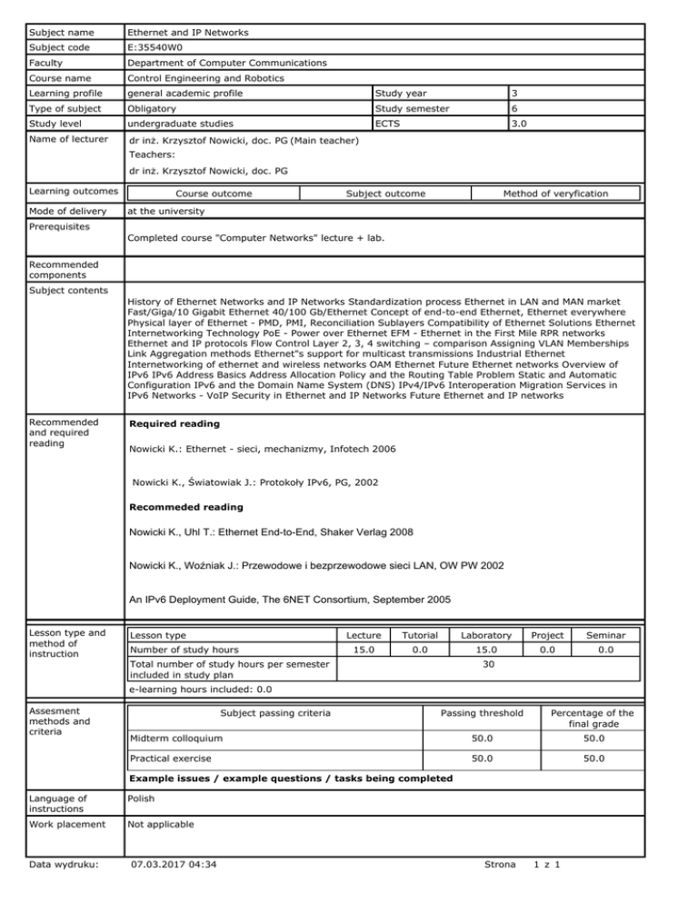 Subject name Ethernet and IP Networks Subject code E:35540W0 Faculty Department of Computer Communications Course name Control Engineering and Robotics Learning profile general academic profile Study year 3 Type of subject Obligatory Study semester 6 Study level undergraduate studies ECTS 3.0 Name of lecturer dr inż. Krzysztof Nowicki, doc. PG (Main teacher) Teachers: dr inż. Krzysztof Nowicki, doc. PG Learning outcomes Mode of delivery Course outcome Subject outcome Method of veryfication at the university Prerequisites Completed course "Computer Networks" lecture + lab. Recommended components Subject contents History of Ethernet Networks and IP Networks Standardization process Ethernet in LAN and MAN market Fast/Giga/10 Gigabit Ethernet 40/100 Gb/Ethernet Concept of end-to-end Ethernet, Ethernet everywhere Physical layer of Ethernet - PMD, PMI, Reconciliation Sublayers Compatibility of Ethernet Solutions Ethernet Internetworking Technology PoE - Power over Ethernet EFM - Ethernet in the First Mile RPR networks Ethernet and IP protocols Flow Control Layer 2, 3, 4 switching – comparison Assigning VLAN Memberships Link Aggregation methods Ethernet"s support for multicast transmissions Industrial Ethernet Internetworking of ethernet and wireless networks OAM Ethernet Future Ethernet networks Overview of IPv6 IPv6 Address Basics Address Allocation Policy and the Routing Table Problem Static and Automatic Configuration IPv6 and the Domain Name System (DNS) IPv4/IPv6 Interoperation Migration Services in IPv6 Networks - VoIP Security in Ethernet and IP Networks Future Ethernet and IP networks Recommended and required reading Required reading Nowicki K.: Ethernet - sieci, mechanizmy, Infotech 2006 Nowicki K., Światowiak J.: Protokoły IPv6, PG, 2002 Recommeded reading Nowicki K., Uhl T.: Ethernet End-to-End, Shaker Verlag 2008 Nowicki K., Woźniak J.: Przewodowe i bezprzewodowe sieci LAN, OW PW 2002 An IPv6 Deployment Guide, The 6NET Consortium, September 2005 Lesson type and method of instruction Lesson type Number of study hours Lecture Tutorial Laboratory Project Seminar 15.0 0.0 15.0 0.0 0.0 Total number of study hours per semester included in study plan 30 e-learning hours included: 0.0 Assesment methods and criteria Subject passing criteria Passing threshold Percentage of the final grade Midterm colloquium 50.0 50.0 Practical exercise 50.0 50.0 Example issues / example questions / tasks being completed Language of instructions Polish Work placement Not applicable Data wydruku: 07.03.2017 04:34 Strona 1 z 1