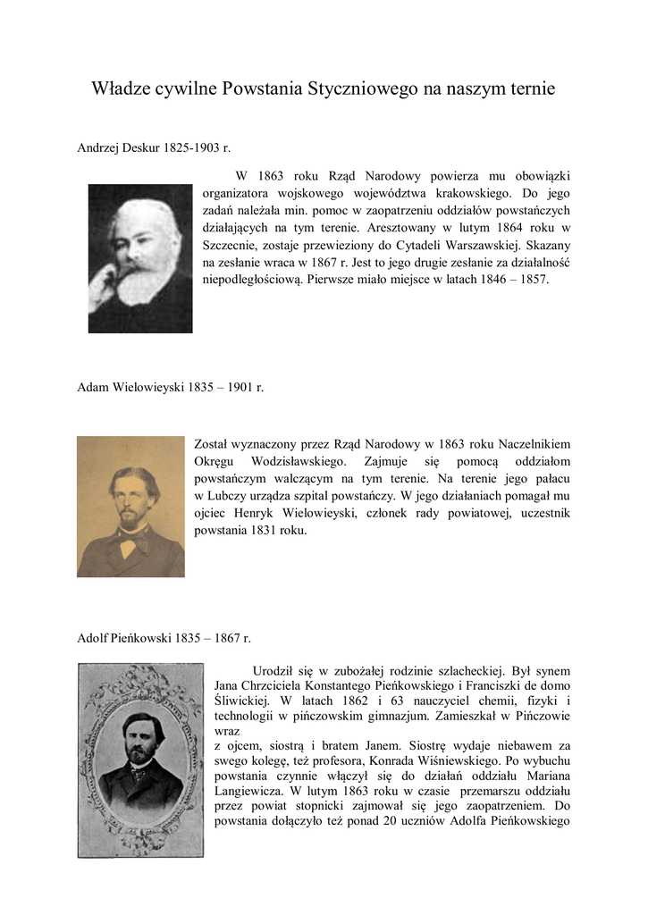 Władze cywilne Powstania Styczniowego na naszym ternie Andrzej Deskur 1825-1903 r. W 1863 roku Rząd Narodowy powierza mu obowiązki organizatora wojskowego województwa krakowskiego. Do jego zadań należała min. pomoc w zaopatrzeniu oddziałów powstańczych działających na tym terenie. Aresztowany w lutym 1864 roku w Szczecnie, zostaje przewieziony do Cytadeli Warszawskiej. Skazany na zesłanie wraca w 1867 r. Jest to jego drugie zesłanie za działalność niepodległościową. Pierwsze miało miejsce w latach 1846 – 1857. Adam Wielowieyski 1835 – 1901 r. Został wyznaczony przez Rząd Narodowy w 1863 roku Naczelnikiem Okręgu Wodzisławskiego. Zajmuje się pomocą oddziałom powstańczym walczącym na tym terenie. Na terenie jego pałacu w Lubczy urządza szpital powstańczy. W jego działaniach pomagał mu ojciec Henryk Wielowieyski, członek rady powiatowej, uczestnik powstania 1831 roku. Adolf Pieńkowski 1835 – 1867 r. Urodził się w zubożałej rodzinie szlacheckiej. Był synem Jana Chrzciciela Konstantego Pieńkowskiego i Franciszki de domo Śliwickiej. W latach 1862 i 63 nauczyciel chemii, fizyki i technologii w pińczowskim gimnazjum. Zamieszkał w Pińczowie wraz z ojcem, siostrą i bratem Janem. Siostrę wydaje niebawem za swego kolegę, też profesora, Konrada Wiśniewskiego. Po wybuchu powstania czynnie włączył się do działań oddziału Mariana Langiewicza. W lutym 1863 roku w czasie przemarszu oddziału przez powiat stopnicki zajmował się jego zaopatrzeniem. Do powstania dołączyło też ponad 20 uczniów Adolfa Pieńkowskiego ze szkoły w Pińczowie, m.in. Szymon Włoszek, Bolesław Kołtoński i Władysław Bonikowski, uczestnicy bitwy pod Małogoszczem, których mogiły znajdują się na Cmentarzu Starym w Kielcach. W marcu 1863 roku Adolf Pieńkowski został szefem biura Władysława Gołemberskiego, naczelnika cywilnego województwa krakowskiego (okresowo pełnił funkcję jego zastępcy). Formował powstańcze oddziały w kieleckim, w tym oddział Zygmunta Chmieleńskiego. W połowie lipca tego roku został wysłannikiem Rządu Narodowego (RN), skierowanym na rozmowy z Leonem Królikowskim o jego projektach utworzenia polskiej marynarki wojennej, a w sierpniu – otrzymał zadanie utworzenia warszawskiego wydziału policji RN (scentralizowania różnych powstańczych agend policyjnych) i ochrony RN. Po likwidacji wydziału Pieńkowski został zdymisjonowany i wyjechał do Pińczowa (był zagrożony aresztowaniem i wyrokiem śmierci). Do Warszawy wrócił w połowie listopada na wezwanie Romualda Traugutta, który powierzył mu wznowienie działania wydziału policji w swoim rządzie. We współpracy z Trauguttem wydawał we wrześniu „Rozporządzenia Wydziału Policji”, a od 10 grudnia – „Rozporządzenia i Wiadomości Policji Narodowej”. Na początku lutego 1864 roku, gdy pojawiło się realne zagrożenie dekonspiracją, zbiegł do Paryża. Zachowane dane dotyczące funkcji pełnionych we Francji nie są jednoznaczne. Istnieją informacje, że był m.in. naczelnikiem policji przy Adamie Sapieże i komisarzem rządowym przy Izbie Obrachunkowej. Łukasz Łaganowski ( na podstawie mojego wcześniejszego artykułu z czasopisma KPN Zamek 3/1993r.)