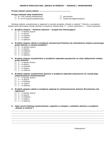 ANKIETA EWALUACYJNA „SZKOŁA W MIEŚCIE” – RODZICE / OPIEKUNOWIE Proszę wpisać nazwę szkoły: ................................................... Proszę wskazać etap kształcenia: □ kl. I-III (szkoła podstawowa) □ kl. IV-VI (szkoła podstawowa) □ □ gimnazjum szkoła ponadgimnazjalna Państwa dziecko uczestniczyło w zajęciach w ramach projektu „Szkoła w mieście”. Prosimy o wyrażenie swojej opinii dotyczącej udziału dziecka w projekcie według skali: 5 – ocena najwyższa, 1 – ocena najniższa. 1. W jakim stopniu – Państwa zdaniem – projekt był interesujący? □ 5 – w bardzo dużym □ 4 – w dużym □ 3 – w średnim □ 2 – w małym □ 1 – w żadnym 2. W jakim stopniu udział w projekcie zainspirował Państwa do odwiedzenia miejsca poznanego przez dziecko w ramach projektu? □ 5 – w bardzo dużym □ 4 – w dużym □ 3 – w średnim □ 2 – w małym □ 1 – w żadnym 3. W jakim stopniu uczestnictwo w projekcie wpłynęło pozytywnie na chęć zdobywania wiedzy przez dziecko? □ 5 – w bardzo dużym □ 4 – w dużym □ 3 – w średnim □ 2 – w małym □ 1 – w żadnym 4. W jakim stopniu uczestnictwo dziecka w projekcie wpłynęło pozytywnie na rozwój jego indywidualnych zainteresowań? □ 5 – w bardzo dużym □ 4 – w dużym □ 3 – w średnim □ 2 – w małym □ 1 – w żadnym 5. W jakim stopniu udział w projekcie wpłynął na zainteresowanie dziecka Wrocławiem lub regionem? □ 5 – w bardzo dużym □ 4 – w dużym □ 3 – w średnim □ 2 – w małym □ 1 – w żadnym 6. Jakie macie Państwo spostrzeżenia, sugestie w związku z udziałem dziecka w projekcie „Szkoła w mieście”? __________________________________________________________________________________ __________________________________________________________________________________ __________________________________________________________________________________ __________________________________________________________________________________ __________________________________________________________________________________ __________________________________________________________________________________ Dziękujemy!