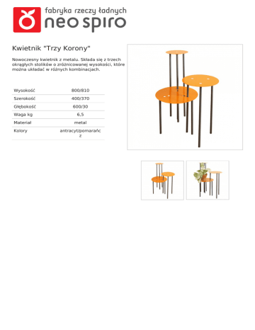 Kwietnik "Trzy Korony" Nowoczesny kwietnik z metalu. Składa się z trzech okrągłych stolików o zróżnicowanej wysokości, które można układać w różnych kombinacjach. Wysokość 800/810 Szerokość 400/370 Głębokość 600/30 Waga kg 6,5 Materiał metal Kolory Powered by TCPDF (www.tcpdf.org) antracyt/pomarańc z