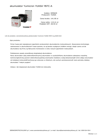 akumulator Yumicron YUASA YB7C-A Indeks: SM5629 Producent: YUASA Cena brutto: 141.95 zł Cena netto: 115.41 zł Podatek VAT: 26.54 zł Link do produktu: serwismotocyklowy.pl/akumulator-Yumicron-YUASA-YB7C-A,p,5629.html Opis produktu: Firma Yuasa jest największym japońskim producentem akumulatorów motocyklowych. Nowoczesna technologia zastosowana w akumulatorach Yuasa sprawia, że są bardzo wydajnym źródłem energii, dzięki czemu od lat akumulatory tej firmy są fabrycznie montowane w wielu nowych japońskich motocyklach. Podstawowe zasady prawidłowej eksploatacji akumulatora: Nowy akumulator zalej elektrolitemUtrzymuj akumulator w czystościKlemy akumulatora zabezpiecz wazeliną technicznąKontroluj poziom elektrolituUzupełniaj ewentualne niedobory wodą destylowanąW zimie odłącz akumulator od instalacji motocyklaPrzechowuj go wówczas w chłodnym, ale suchym pomieszczeniuW razie potrzeby doładuj akumulator "małym prądem" Zobacz: Jak dopasować akumulator YUASA do motocykla. SERWISMOTOCYKLOWY.pl | www.serwismotocyklowy.pl | e-mail: [email protected] | tel. 606 814 814 Strona 1 z 1