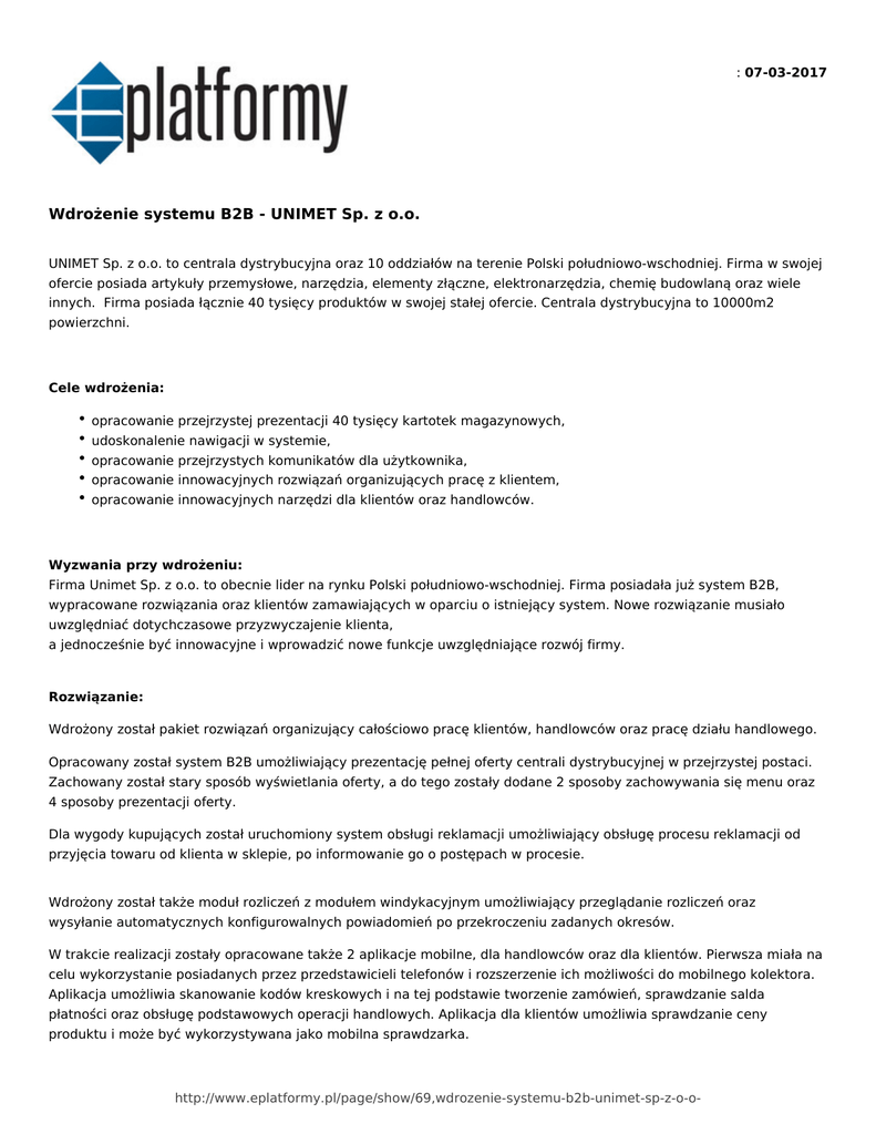 : 07-03-2017 Wdrożenie systemu B2B - UNIMET Sp. z o.o. UNIMET Sp. z o.o. to centrala dystrybucyjna oraz 10 oddziałów na terenie Polski południowo-wschodniej. Firma w swojej ofercie posiada artykuły przemysłowe, narzędzia, elementy złączne, elektronarzędzia, chemię budowlaną oraz wiele innych. Firma posiada łącznie 40 tysięcy produktów w swojej stałej ofercie. Centrala dystrybucyjna to 10000m2 powierzchni. Cele wdrożenia: opracowanie przejrzystej prezentacji 40 tysięcy kartotek magazynowych, udoskonalenie nawigacji w systemie, opracowanie przejrzystych komunikatów dla użytkownika, opracowanie innowacyjnych rozwiązań organizujących pracę z klientem, opracowanie innowacyjnych narzędzi dla klientów oraz handlowców. Wyzwania przy wdrożeniu: Firma Unimet Sp. z o.o. to obecnie lider na rynku Polski południowo-wschodniej. Firma posiadała już system B2B, wypracowane rozwiązania oraz klientów zamawiających w oparciu o istniejący system. Nowe rozwiązanie musiało uwzględniać dotychczasowe przyzwyczajenie klienta, a jednocześnie być innowacyjne i wprowadzić nowe funkcje uwzględniające rozwój firmy. Rozwiązanie: Wdrożony został pakiet rozwiązań organizujący całościowo pracę klientów, handlowców oraz pracę działu handlowego. Opracowany został system B2B umożliwiający prezentację pełnej oferty centrali dystrybucyjnej w przejrzystej postaci. Zachowany został stary sposób wyświetlania oferty, a do tego zostały dodane 2 sposoby zachowywania się menu oraz 4 sposoby prezentacji oferty. Dla wygody kupujących został uruchomiony system obsługi reklamacji umożliwiający obsługę procesu reklamacji od przyjęcia towaru od klienta w sklepie, po informowanie go o postępach w procesie. Wdrożony został także moduł rozliczeń z modułem windykacyjnym umożliwiający przeglądanie rozliczeń oraz wysyłanie automatycznych konfigurowalnych powiadomień po przekroczeniu zadanych okresów. W trakcie realizacji zostały opracowane także 2 aplikacje mobilne, dla handlowców oraz dla klientów. Pierwsza miała na celu wykorzystanie posiadanych przez przedstawicieli telefonów i rozszerzenie ich możliwości do mobilnego kolektora. Aplikacja umożliwia skanowanie kodów kreskowych i na tej podstawie tworzenie zamówień, sprawdzanie salda płatności oraz obsługę podstawowych operacji handlowych. Aplikacja dla klientów umożliwia sprawdzanie ceny produktu i może być wykorzystywana jako mobilna sprawdzarka. http://www.eplatformy.pl/page/show/69,wdrozenie-systemu-b2b-unimet-sp-z-o-o- Funkcje i rozwiązania: System B2B Zawiera wielopoziomowy katalog produktów, Zawiera pełne odwzorowanie cen z systemu ERP, Umożliwia przeglądanie rozliczeń, salda , niezapłaconych faktur, Obsługuje proces reklamacyjny, Pozwala na opracowywanie ofert handlowych z poziomu B2B dla klientów końcowych, Zawiera wielopoziomowy katalog uprawnień i ograniczeń dla subkont. Aplikacja mobilna - kolektor danych umożliwia składanie zamówień za pomocą telefonu, prezentuje aktualną dostępność produktów, umożliwia sprawdzenie opisu produktu, współpracuje z kontami handlowców w systemie B2B. Aplikacja mobilna - sprawdzarka umożliwia sprawdzenie ceny w sklepie, umożliwia sprawdzenie ilości dostępnych produktów w wybranej placówce, umożliwia zapoznanie się z szczegółami technicznymi i opisem produktu. Efekty współpracy: 94% klientów oceniło nowy system B2B jako bardziej intuicyjny, 32% zwiększyła się ilość zamówień składanych przez Internet, 19% zwiększyła się wartość składanych zamówień. Użyte technologie: Dedykowany system e-commerce wykonany został w technologii PHP, przy wykorzystaniu bazy danych MySql oraz autorskich API do połączenia z systemem ERP. Korzyści ze współpracy: Wzrost zadowolenia klientów, co przekłada się na wzrost zamówień, wytworzenie innowacyjnych narzędzi dla przedstawicieli, dzięki którym możliwe jest prezentowanie firmy jako firmy innowacyjnej, lidera rynku, automatyzacja i usprawnienie procesów związanych ze sprzedażą, systematyzujące pracę i zwiększające wydajność. : 16-12-2015 , : 07-02-2017, : Jan Kowalski http://www.eplatformy.pl/page/show/69,wdrozenie-systemu-b2b-unimet-sp-z-o-o-