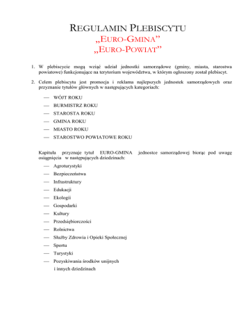 REGULAMIN PLEBISCYTU „EURO-GMINA” „EURO-POWIAT” 1. W plebiscycie mogą wziąć udział jednostki samorządowe (gminy, miasta, starostwa powiatowe) funkcjonujące na terytorium województwa, w którym ogłoszony został plebiscyt. 2. Celem plebiscytu jest promocja i reklama najlepszych jednostek samorządowych oraz przyznanie tytułów głównych w następujących kategoriach: WÓJT ROKU BURMISTRZ ROKU STAROSTA ROKU GMINA ROKU MIASTO ROKU STAROSTWO POWIATOWE ROKU Kapituła przyznaje tytuł EURO-GMINA osiągnięcia w następujących dziedzinach: Agroturystyki Bezpieczeństwa Infrastruktury Edukacji Ekologii Gospodarki Kultury Przedsiębiorczości Rolnictwa Służby Zdrowia i Opieki Społecznej Sportu Turystyki Pozyskiwania środków unijnych i innych dziedzinach jednostce samorządowej biorąc pod uwagę REGULAMIN PLEBISCYTU „EURO-GMINA” 3. Wyniki Plebiscytu ogłasza Kapituła w oparciu o zebrane własne informacje oraz dokumentację nadesłaną przez uczestników Plebiscytu, a także inne podmioty zgłaszające samorządy do Plebiscytu. 4. W skład Kapituły oceniającej osiągnięcia samorządów mogą wejść: Wojewoda lub jego przedstawiciel, Marszałek Województwa lub jego przedstawiciel, przedstawiciel organizatora, przedstawiciele patronów medialnych Plebiscytu, ekonomiści, pracownicy naukowi i inni eksperci zaproszeni przez organizatora do Kapituły. 5. W obradach Kapituły musi uczestniczyć minimum 3 osoby. 6. Kapituła podejmuje decyzje na posiedzeniu niejawnym. 7. Kapituła ocenia osiągnięcia samorządów na podstawie dostarczonej dokumentacji opisowej w poszczególnych dziedzinach: W dziedzinie agroturystyki m.in. za: a) stwarzanie warunków do rozwoju gospodarstw agroturystycznych b) liczba i poziom gospodarstw agroturystycznych na terenie gminy c) atrakcyjność ofert gospodarstw agroturystycznych d) jakość produktów oferowanych dla turystów przez gospodarstwa agroturystyczne W dziedzinie bezpieczeństwa m.in. za: a) współpracę samorządu ze służbami Policji i Straży Pożarnej (zakup samochodów, doposażenie komisariatów i strażnic, współfinansowanie dodatkowych patroli policyjnych) b) poprawę i zmianę oznakowania dróg i ulic c) przebudowę i modernizację dróg i ulic, w tym budowę skrzyżowań z ruchem okrężnym, ustawianie progów zwalniających, budowę oświetlenia miejsc niebezpiecznych d) budowę ścieżek rowerowych oraz nowych ciągów pieszych wzdłuż ruchliwych arterii komunikacyjnych e) akcje promujące bezpieczeństwo na terenie gmin, miast i powiatów f) współpracę policji i straży pożarnej z lokalnymi społecznościami oraz szkołami W dziedzinie edukacji m.in. za: a) inwestycje oświatowe w gminie, w tym termomodernizacja szkół b) organizacja dojazdu dzieci do szkół na terenie działania jednostek samorządu terytorialnego c) udział w konkursach i olimpiadach przedmiotowych d) dostępność do nowoczesnych środków edukacyjnych (internet˙ rzutniki audiowizualne, tablice multimedialne) 2 REGULAMIN PLEBISCYTU „EURO-GMINA” W dziedzinie ekologii m.in. za: a) inwestycje proekologiczne w gminie (budowa oczyszczalni ścieków, utylizacja odpadów, budowa urządzeń redukujących zanieczyszczenia atmosfery) b) budowę sieci kanalizacyjnej odprowadzającej ścieki c) czystość wód na terenie gminy d) zagospodarowanie naturalnych zbiorników wodnych, budowa zbiorników retencyjnych e) zagospodarowanie nieużytków (zalesianie) W dziedzinie gospodarki m.in. za: a) rozwój infrastruktury drogowej b) rozwój sieci teleinformatycznej c) tworzenie korzystnych warunków dla inwestorów (w tym przygotowanie lokalizacji na terenach uzbrojonych) d) pozyskanie inwestorów, w tym zagranicznych e) pozyskiwanie i wykorzystanie środków unijnych f) budowa nowych wodociągów W dziedzinie kultury m.in. za: a) wykorzystanie obiektów kultury na terenie jednostek samorządu terytorialnego b) organizację imprez kulturalnych i koncertów c) organizacja i promocja imprez o zasięgu regionalnym i ponadregionalnym d) wspieranie sztuki ludowej na terenach działania jednostek samorządu terytorialnego (zespoły folklorystyczne i śpiewacze, rzeźbiarze, malarze i inni twórcy ludowi) e) organizację czasu wolnego dla dzieci młodzieży (w tym ferii zimowych i wakacje) f) ochronę dóbr dziedzictwa i zabytków na terenach jednostek samorządu terytorialnego W dziedzinie przedsiębiorczości m.in. za: a) tworzenie programów i wykorzystanie środków unijnych b) tworzenie nowych miejsc pracy c) współpracę z lokalnymi przedsiębiorcami d) promocję jednostek samorządu terytorialnego W dziedzinie rolnictwa m.in. za: a) wspieranie i promocję spółek producenckich b) promowanie młodych rolników i ich osiągnięć 3 REGULAMIN PLEBISCYTU „EURO-GMINA” c) wspieranie firm zajmujących się między innymi skupem, przetwórstwem, zbytem produktów rolnych d) przetwórstwo, skup i zbyt produktów rolnych e) wspieranie producentów żywności ekologicznej f) wspieranie producentów gospodarki ogrodniczej, w tym producentów kwiatów W dziedzinie służby zdrowia i opieki społecznej m.in. za: a) organizację służby zdrowia w jednostkach samorządu terytorialnego, w tym przekształcenia własnościowe na korzyść pacjentów b) prowadzenie profilaktyki zdrowotnej, m.in. stomatologia w szkołach, mammobusy, „białe niedziele” c) budowę i modernizację obiektów służby zdrowia d) nowatorskie rozwiązania w zakresie opieki społecznej e) projekty zwiększające dostęp pacjentów do opieki specjalistycznej W dziedzinie sportu m.in. za: a) rozwój bazy sportowej na terenie jednostek samorządu terytorialnego (stadiony, hale sportowe, ścieżki zdrowia) b) osiągnięcia klubów i stowarzyszeń sportowych c) rozwój sportu w szkołach, w tym rywalizacja z innymi szkołami na terenie województwa d) wspieranie lokalnych klubów sportów młodzieżowych e) organizację turniejów i zawodów promujących sport na terenach działania jedno