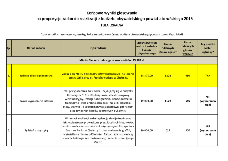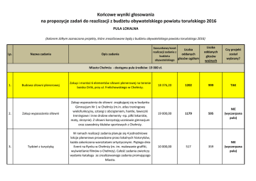 Końcowe wyniki głosowania na propozycje zadań do reazlizacji z budżetu obywatelskiego powiatu toruńskiego 2016 PULA LOKALNA (kolorem żółtym zaznaczono projekty, które zreazlizowane będą z budżetu obywatelskiego powiatu toruńskiego 2016) Lp. Nazwa zadania Opis zadania Szacunkowy koszt Liczba realizacji zadania z oddanych budżetu głosów ogółem obywatelskiego Liczba oddanych głosów ważnych Czy projekt został wybrany? 999 TAK 595 NIE (wyczerpana pula) 359 NIE (wyczerpana pula) Miasto Chełmża - dostępna pula środków: 19 000 zł. 1. 2. 3. Budowa siłowni plenerowej Zakup i montaż 6 elementów siłowni plenerowej na terenie boiska Orlik, przy ul. Frelichowskiego w Chełmży. Zakup wyposażenia siłowni Zakup wyposażenia do siłowni znajdującej się w budynku Gimnazjum Nr 1 w Chełmży (m.in. atlas treningowy wielofunkcyjny, sztangi z obciążeniem, hantle, ławeczki treningowe i inne drobne elementy -np. piłki lekarskie, maty, skrzynie). Z siłowni korzystają uczniowie gimnazjum oraz zawodnicy klubów sportowych z Chełmży. Tydzień z turystyką W ramach realizacji zadania planuje się 4 jednodniowe lekcje plenerowe prowadzone przez lokalnych historyków, każda zakończona warsztatami artystycznymi. Piątego dnia Event na Rynku w Chełmży (m. im. malowanie graffiti, wyświetlanie filmów o Chełmży). Całość zadania zwieńczy wydanie katalogu ze zrealizowanego zadania promującego Miasto. 18 376,20 19 000,00 10 000,00 1202 1179 517 4. 5. Samo zdrowie w Ciechocinku Jednodniowy wyjazd do uzdrowiska w Ciechocinku. Wyjazd przeznaczony jest dla osób niepełnosprawnych. Podczas wyjazdu zaplanowane zostały zabiegi rehabilitacyjne oraz zwiedzanie miasta z przewodnikiem. 3 600,00 127 90 NIE (wyczerpana pula) Warsztaty florystyczne, malowanie akwarelą Zajęcia edukacyjne dla słuchaczy Uniwersytetu Trzeciego Wieku w Chełmży. Zakres zajęć obejmuje układanie aranżacji roślinnych oraz malowanie akwarelą w plenerze. Planowane jest także zwiedzanie miasta Mrągowa oraz wizyta w Motylarni. 4 000,00 0 0 NIE 54 976,20 3 025,00 2 043,00 X Razem: Gmina Chełmża - dostępna pula środków: 12 500 zł. 1. 2. II Święto Truskawki Festyn integracyjny w truskawką w roli głównej. Podczas festynu zaplanowane zostały prezentacje i degustacje potraw z wykorzystaniem truskawki. Nie zabraknie także zabaw i konkursów, w tym konkursu kulinarnego na najsmaczniejszy tort truskawkowy. Zaplanowane zostały także atrakcje dla dzieci - dmuchańce, ścianka wspinaczkowa i przejażdżki konne. Festyn zakończy wspólne biesiadowanie. Miejsce realizacji zadania: Bielczyny. 3 000,00 601 520 TAK Akademia zdrowego odżywiania Organizacja sześciu ośmiogodzinnych warsztatów kulinarnych w miejscowościach w gminie Chełmża (Zelgno, Bielczyny, Nawra, Kuczwały, Kończewice, Sławkowo) prowadzonych przez wykwalifikowanego instruktora kulinarnego przy konsultacji z dietetykiem. Podczas warsztatów uczestnicy pozyskają wiedzę z zakresu zdrowego żywienia oraz dietetyki. Całość zadania zwieńczy konferencja podsumowująca zrealizowane zadania. 5 000,00 351 311 TAK 3. 4. 5. 6. Wakacje w Grzywnie Planuje się zorganizowanie 6 dniowego wypoczynku wakacyjnego dla dzieci i młodzieży ze sołectwa Grzywna i okolic. W ramach realizacji zadania odbędą się warsztaty artystyczne, kulinarne, taneczne, rozgrywki planszowe oraz wycieczka piesza po gminie Chełmża i wyjazd do kina w Toruniu. 2 700,00 312 279 TAK Powykopki Głuchowskie - festyn integracyjny mieszkańców Festyn integracyjny z ziemniakiem w roli głównej. Podczas festynu zaplanowane zostały pokazy obróbki ziemniaka, wystawa sprzętów gospodarskich, konkursy, w tym konkurs kulinarny na najsmaczniejszą potrawę z ziemniaka. Całość spotkania zwieńczona zostanie wspólnym ogniskiem i biesiadą. 3 000,00 251 224 NIE (wyczerpana pula) VI Festiwal Smaku PYZA Organizacja festiwalu podczas którego uczestnikom przybliżone zostaną produkty kuchni tradycyjnej wytwarzane na wsi wg dawnych receptur. Festiwalowi towarzyszyć będą prezentacje i degustacje potraw, konkursy oraz występy taneczne i muzyczne. Do udziału w festiwalu zaproszone zostaną zespoły i twórcy kuchni tradycyjnej z terenu gminy Chełmża, którzy zaprezentują uprawianą przez siebie dziedzinę sztuki kulinarnej i tradycji folklorystycznych. Miejsce realizacji zadania: Browina. 179 NIE (wyczerpana pula) Spotkanie z operą Zorganizowanie wyjazdu do Opery Nova w Bydgoszczy. Wyjazd poprzedzony zostanie spotkaniem podczas którego m.in. uczestnicy wirtualnie zapoznają się z obiektem, omówione zostaną gatunki operowe, jak również przybliżona zostanie twórczość i życiorys autora spektaklu. Po wyjeździe odbędzie się drugie spotkanie (podsumowanie, komentarze, refleksje). 56 NIE (wyczerpana pula) 5 500,00 1 900,00 196 57 7. Realizacja zadania obejmuje przeprowadzenie warsztatów w zakresie wiedzy o zapomnianych kwiatach polskiej wsi. Podczas warsztatów, podczas których planowana jest wizyta Rośliny poznamy-rzeźbę wykonamy w przydomowym ogródku, uczestnicy zapoznają się z warsztaty przyrodnicze zakończone wymaganiami i pielęgnacją ww. kwiatów. Całość zadania wykonaniem rzeźby kwiatowej zwieńczy wykonanie przez uczestników rzeźby kwiatowej (pawia z rozłożystym ogonem), która stanie w centrum wsi Sławkowo. 1 000,00 40 37 TAK Razem: 22 100,00 1 808,00 1 606,00 X 573 532 TAK Gmina Czernikowo - dostępna pula środków: 11 400 zł. Organizowanie działalności w dziedzinie Zakup i montaż huśtawki podwójnej z metalową belką oraz 1. rekreacji ruchowej w Osówce, poprzez huśtawki bocianie gniazdo na terenie świetlicy wiejskiej w tworzenie placu zabaw Osówce. 2. 3. 8 400,00 Budowa siłowni zewnętrznej Zakup i montaż 3 elementów siłowni zewnętrznej w Mazowszu. 9 963,00 418 392 NIE (wyczerpana pula) Otwarte turnieje w szachy i warcaby klasyczne W ramach zadania rozegrane zostaną turnieje w szachy i warcaby skierowane do t