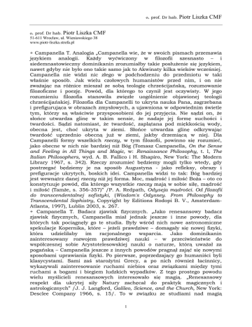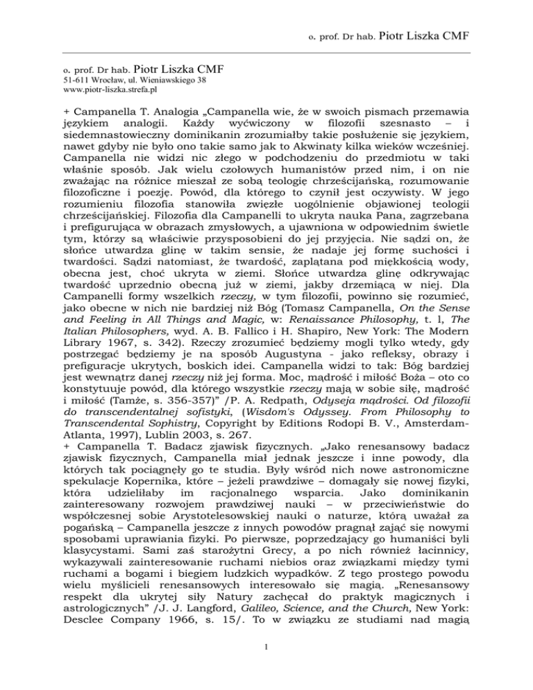 o. prof. Dr hab. Piotr Liszka CMF o. prof. Dr hab. Piotr Liszka CMF 51-611 Wrocław, ul. Wieniawskiego 38 www.piotr-liszka.strefa.pl + Campanella T. Analogia „Campanella wie, że w swoich pismach przemawia językiem analogii. Każdy wyćwiczony w filozofii szesnasto – i siedemnastowieczny dominikanin zrozumiałby takie posłużenie się językiem, nawet gdyby nie było ono takie samo jak to Akwinaty kilka wieków wcześniej. Campanella nie widzi nic złego w podchodzeniu do przedmiotu w taki właśnie sposób. Jak wielu czołowych humanistów przed nim, i on nie zważając na różnice mieszał ze sobą teologię chrześcijańską, rozumowanie filozoficzne i poezję. Powód, dla którego to czynił jest oczywisty. W jego rozumieniu filozofia stanowiła zwięzłe uogólnienie objawionej teologii chrześcijańskiej. Filozofia dla Campanelli to ukryta nauka Pana, zagrzebana i prefigurująca w obrazach zmysłowych, a ujawniona w odpowiednim świetle tym, którzy są właściwie przysposobieni do jej przyjęcia. Nie sądzi on, że słońce utwardza glinę w takim sensie, że nadaje jej formę suchości i twardości. Sądzi natomiast, że twardość, zaplątana pod miękkością wody, obecna jest, choć ukryta w ziemi. Słońce utwardza glinę odkrywając twardość uprzednio obecną już w ziemi, jakby drzemiącą w niej. Dla Campanelli formy wszelkich rzeczy, w tym filozofii, powinno się rozumieć, jako obecne w nich nie bardziej niż Bóg (Tomasz Campanella, On the Sense and Feeling in All Things and Magic, w: Renaissance Philosophy, t. l, The Italian Philosophers, wyd. A. B. Fallico i H. Shapiro, New York: The Modern Library 1967, s. 342). Rzeczy zrozumieć będziemy mogli tylko wtedy, gdy postrzegać będziemy je na sposób Augustyna - jako refleksy, obrazy i prefiguracje ukrytych, boskich idei. Campanella widzi to tak: Bóg bardziej jest wewnątrz danej rzeczy niż jej forma. Moc, mądrość i miłość Boża – oto co konstytuuje powód, dla którego wszystkie rzeczy mają w sobie siłę, mądrość i miłość (Tamże, s. 356-357)” /P. A. Redpath, Odyseja mądrości. Od filozofii do transcendentalnej sofistyki, (Wisdom's Odyssey. From Philosophy to Transcendental Sophistry, Copyright by Editions Rodopi B. V., AmsterdamAtlanta, 1997), Lublin 2003, s. 267. + Campanella T. Badacz zjawisk fizycznych. „Jako renesansowy badacz zjawisk fizycznych, Campanella miał jednak jeszcze i inne powody, dla których tak pociągnęły go te studia. Były wśród nich nowe astronomiczne spekulacje Kopernika, które – jeżeli prawdziwe – domagały się nowej fizyki, która udzieliłaby im racjonalnego wsparcia. Jako dominikanin zainteresowany rozwojem prawdziwej nauki – w przeciwieństwie do współczesnej sobie Arystotelesowskiej nauki o naturze, którą uważał za pogańską – Campanella jeszcze z innych powodów pragnął zająć się nowymi sposobami uprawiania fizyki. Po pierwsze, poprzedzający go humaniści byli klasycystami. Sami zaś starożytni Grecy, a po nich również łacinnicy, wykazywali zainteresowanie ruchami niebios oraz związkami między tymi ruchami a bogami i biegiem ludzkich wypadków. Z tego prostego powodu wielu myślicieli renesansowych interesowało się magią. „Renesansowy respekt dla ukrytej siły Natury zachęcał do praktyk magicznych i astrologicznych” /J. J. Langford, Galileo, Science, and the Church, New York: Desclee Company 1966, s. 15/. To w związku ze studiami nad magią 1 o. prof. Dr hab. Piotr Liszka CMF rozwinęła się w XVI wieku na przykład medycyna, co stało się za sprawą takiego wybitnego intelektu, jakim był Teofrastus Bombast von Hohenheim, lepiej znany jako Paracelsus. Campanella dodatkowo jeszcze, podobnie jak Bernardino Telesio, poza magią interesował się neoplatonizmem, co również skłaniało go do obalenia klasycznych poglądów fizycznych starożytnych Greków w ogólności, a fizyki Arystotelesa w szczególności /Tamże, s. 15. Zob. także, P. O. Kristeller, Renaissance Thought: The Classic, Scholastic, and Humanist Strains, New York: Harper and Row, Publishers 1955, s. 61-62/” P. A. Redpath, Odyseja mądrości. Od filozofii do transcendentalnej sofistyki, (Wisdom's Odyssey. From Philosophy to Transcendental Sophistry, Copyright by Editions Rodopi B. V., Amsterdam-Atlanta, 1997), Lublin 2003, s. 258. + Campanella T. Bóg doskonały zaopatrzył wszystkich rzeczy w siły wystarczające do tego, by rzeczy te zachowywały siebie w swoich naturalnych działaniach. „Bóg w sposób indywidualny udziela rzeczom swojego obrazu. Obraz ten jest wrażeniem i czuciem posiadanym przez daną rzecz, a odciśniętym przez Boga w ogólnej formie lub wspólnej naturze tej indywidualnej rzeczy. To czucie czy też wrażenie wystarcza, by wprawić w ruch wszystkie fizyczne rzeczy i by zachować je w istnieniu. Jeżeli rzeczy czują, nie potrzeba aniołów, którzy poruszaliby nimi w ich naturalnych działaniach. Campanella sądzi wręcz, że bezbożnym jest, gdy ktoś twierdzi, iżby Bóg, który jest doskonały, nie zaopatrzył wszystkich rzeczy w siły wystarczające do tego, by rzeczy te zachowywały siebie w swoich naturalnych działaniach i by potrzebowały one poza własnymi siłami pomocy sił pośrednich do sprawowania swoich naturalnych aktów. Uważa przy tym, że nawet opinie uczonych teologów, jak i te, które ma on za bezbożne (jak w przypadku Kalwina) błędne były jeśli idzie o to, w jaki sposób działają formy i jak Bóg operuje w rzeczach, poprzez formy, jako ich Pierwsza Przyczyna /Tomasz Campanella, On the Sense and Feeling in All Things and Magic, w: Renaissance Philosophy, t. l, The Italian Philosophers, wyd. A. B. Fallico i H. Shapiro, New York: The Modern Library 1967, s. 353/. Do swojego poglądu, że czucia i wrażenia zmysłowe odciśnięte są w formy rzeczy i że są przyczyną poszczególnych działań form, Campanella dodaje, że świat nie składa się jak to sobie wyobrażali starożytni atomiś