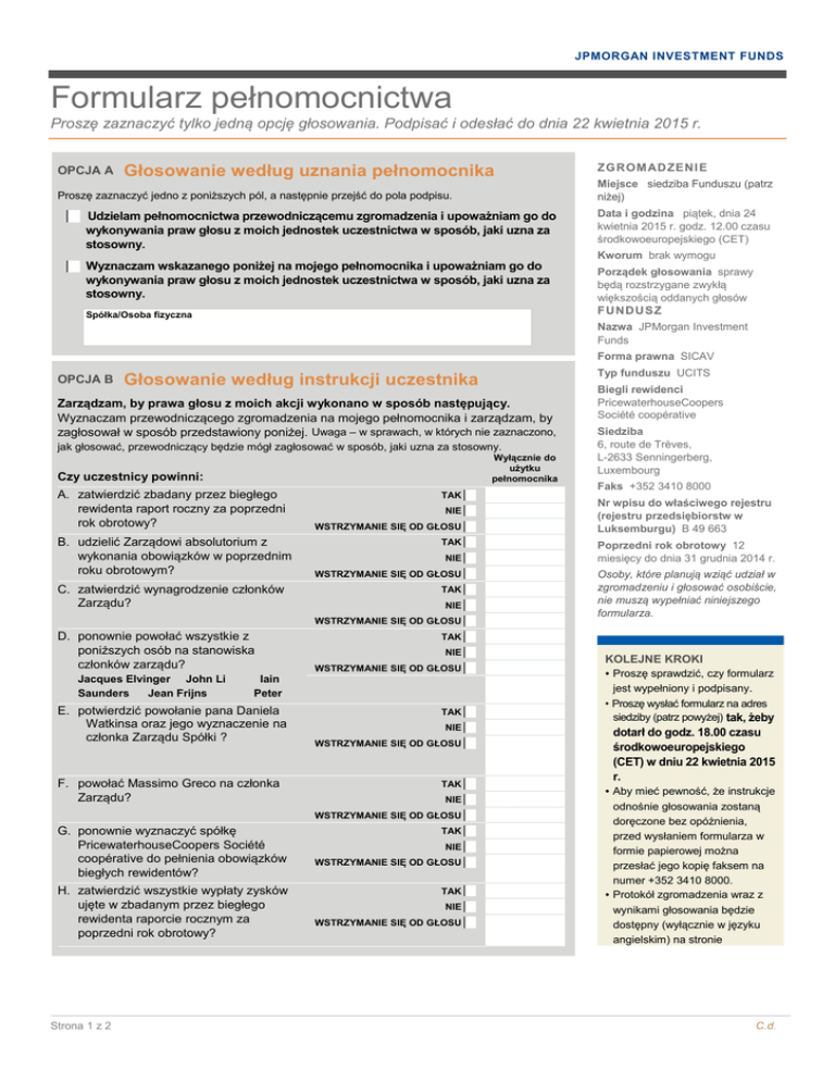 JPMORGAN INVESTMENT FUNDS Formularz pełnomocnictwa Proszę zaznaczyć tylko jedną opcję głosowania. Podpisać i odesłać do dnia 22 kwietnia 2015 r. OPCJA A Głosowanie według uznania pełnomocnika ZGROM AD ZENI E Miejsce siedziba Funduszu (patrz niżej) Proszę zaznaczyć jedno z poniższych pól, a następnie przejść do pola podpisu. Udzielam pełnomocnictwa przewodniczącemu zgromadzenia i upoważniam go do wykonywania praw głosu z moich jednostek uczestnictwa w sposób, jaki uzna za stosowny. Wyznaczam wskazanego poniżej na mojego pełnomocnika i upoważniam go do wykonywania praw głosu z moich jednostek uczestnictwa w sposób, jaki uzna za stosowny. Data i godzina piątek, dnia 24 kwietnia 2015 r. godz. 12.00 czasu środkowoeuropejskiego (CET) Kworum brak wymogu Porządek głosowania sprawy będą rozstrzygane zwykłą większością oddanych głosów FUNDU SZ Spółka/Osoba fizyczna Nazwa JPMorgan Investment Funds Forma prawna SICAV OPCJA B Typ funduszu UCITS Głosowanie według instrukcji uczestnika Zarządzam, by prawa głosu z moich akcji wykonano w sposób następujący. Wyznaczam przewodniczącego zgromadzenia na mojego pełnomocnika i zarządzam, by zagłosował w sposób przedstawiony poniżej. Uwaga – w sprawach, w których nie zaznaczono, jak głosować, przewodniczący będzie mógł zagłosować w sposób, jaki uzna za stosowny. Wyłącznie do użytku pełnomocnika Czy uczestnicy powinni: A. zatwierdzić zbadany przez biegłego rewidenta raport roczny za poprzedni rok obrotowy? B. udzielić Zarządowi absolutorium z wykonania obowiązków w poprzednim roku obrotowym? C. zatwierdzić wynagrodzenie członków Zarządu? TAK NIE WSTRZYMANIE SIĘ OD GŁOSU TAK NIE WSTRZYMANIE SIĘ OD GŁOSU TAK NIE WSTRZYMANIE SIĘ OD GŁOSU D. ponownie powołać wszystkie z poniższych osób na stanowiska członków zarządu? Jacques Elvinger John Li Iain Saunders Jean Frijns Peter E. Schwicht potwierdzić powołanie pana Daniela Watkinsa oraz jego wyznaczenie na członka Zarządu Spółki ? F. powołać Massimo Greco na członka Zarządu? H. zatwierdzić wszystkie wypłaty zysków ujęte w zbadanym przez biegłego rewidenta raporcie rocznym za poprzedni rok obrotowy? Strona 1 z 2 Siedziba 6, route de Trèves, L-2633 Senningerberg, Luxembourg Faks +352 3410 8000 Nr wpisu do właściwego rejestru (rejestru przedsiębiorstw w Luksemburgu) B 49 663 Poprzedni rok obrotowy 12 miesięcy do dnia 31 grudnia 2014 r. Osoby, które planują wziąć udział w zgromadzeniu i głosować osobiście, nie muszą wypełniać niniejszego formularza. TAK NIE WSTRZYMANIE SIĘ OD GŁOSU TAK NIE WSTRZYMANIE SIĘ OD GŁOSU TAK NIE WSTRZYMANIE SIĘ OD GŁOSU G. ponownie wyznaczyć spółkę PricewaterhouseCoopers Société coopérative do pełnienia obowiązków biegłych rewidentów? Biegli rewidenci PricewaterhouseCoopers Société coopérative TAK NIE WSTRZYMANIE SIĘ OD GŁOSU TAK NIE WSTRZYMANIE SIĘ OD GŁOSU KOLEJNE KROKI • Proszę sprawdzić, czy formularz jest wypełniony i podpisany. • Proszę wysłać formularz na adres siedziby (patrz powyżej) tak, żeby dotarł do godz. 18.00 czasu środkowoeuropejskiego (CET) w dniu 22 kwietnia 2015 r. • Aby mieć pewność, że instrukcje odnośnie głosowania zostaną doręczone bez opóźnienia, przed wysłaniem formularza w formie papierowej można przesłać jego kopię faksem na numer +352 3410 8000. • Protokół zgromadzenia wraz z wynikami głosowania będzie dostępny (wyłącznie w języku angielskim) na stronie C.d. Podpis NUMER RACHUNKU J.P. MORGAN LUXEMBOURG PODPIS X IMIĘ I NAZWISKO OSOBY FIZYCZNEJ drukowanymi literami NAZWA PODMIOTU jeżeli dotyczy Strona 2 z 2 Formularz pełnomocnictwa jpmorganassetmanagement.co m/extra.